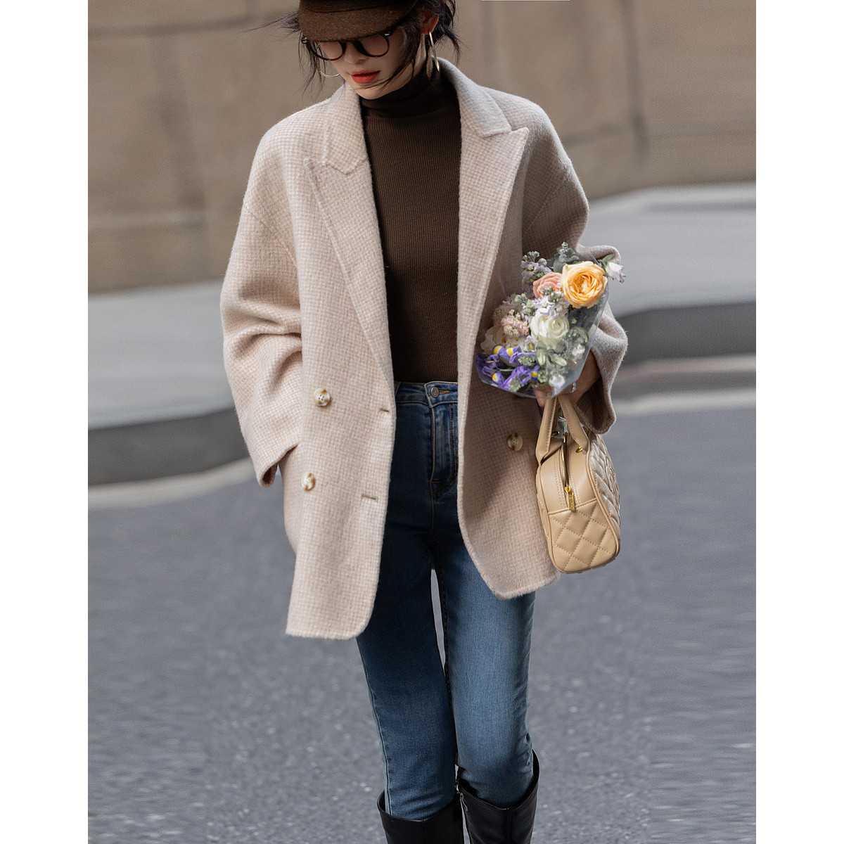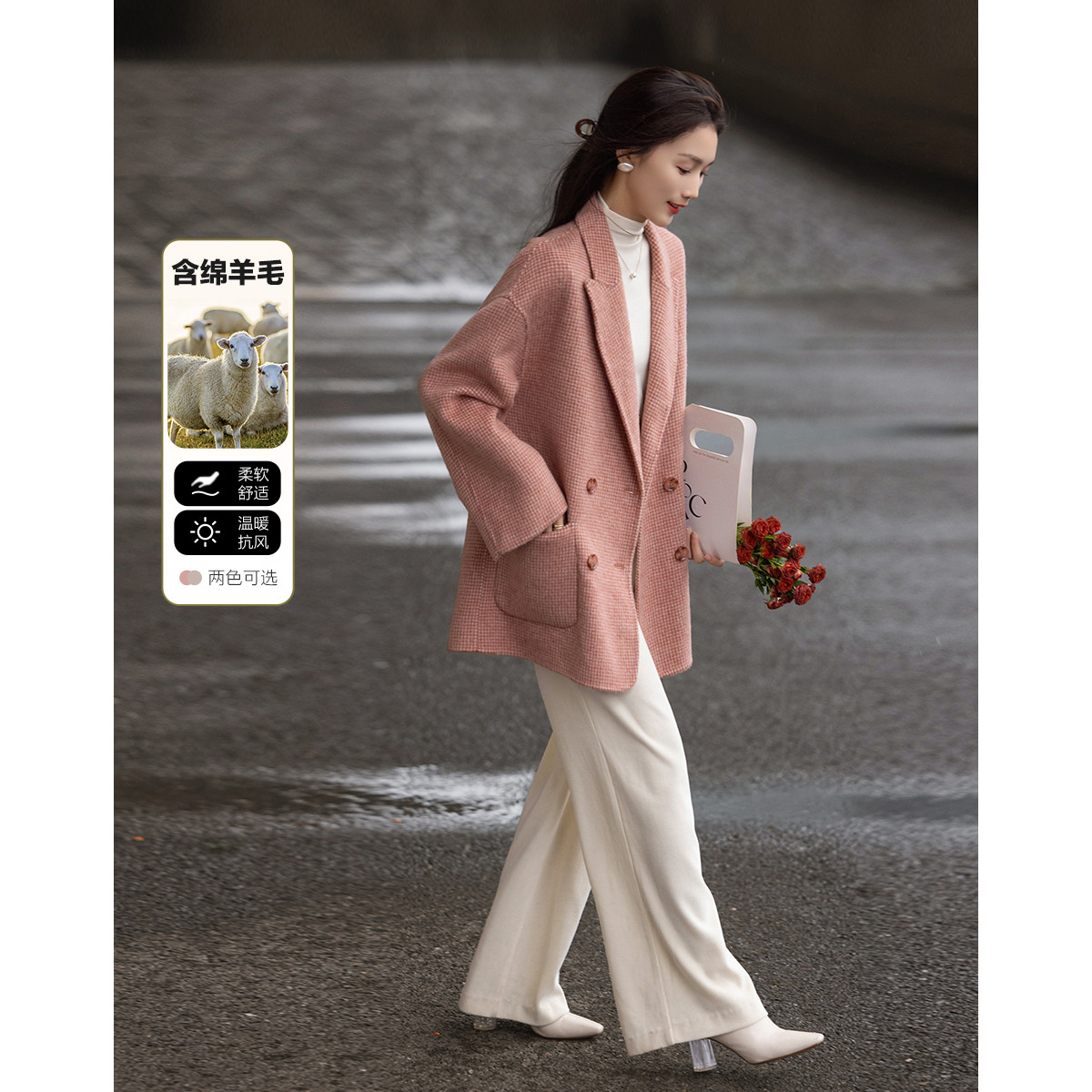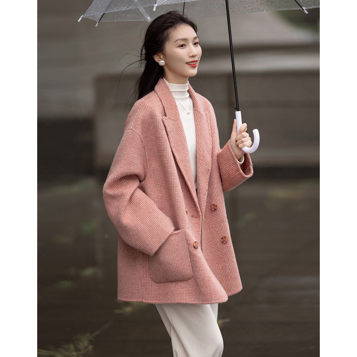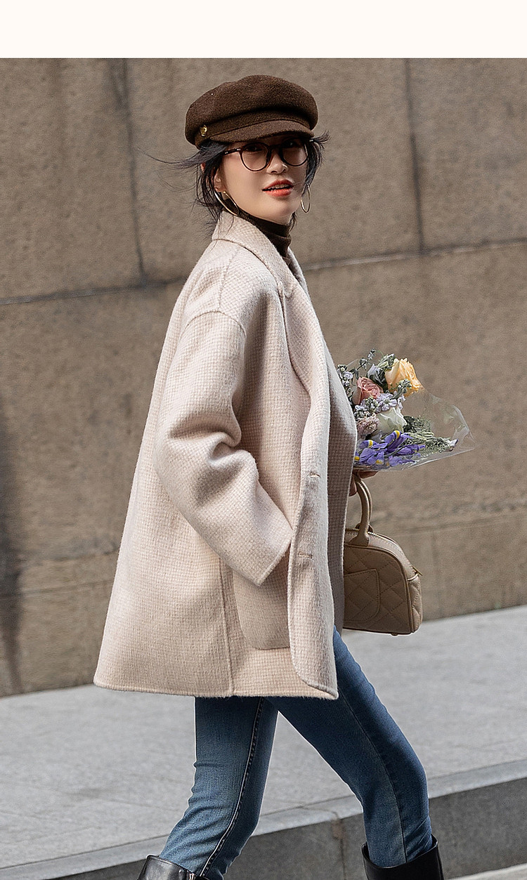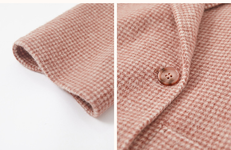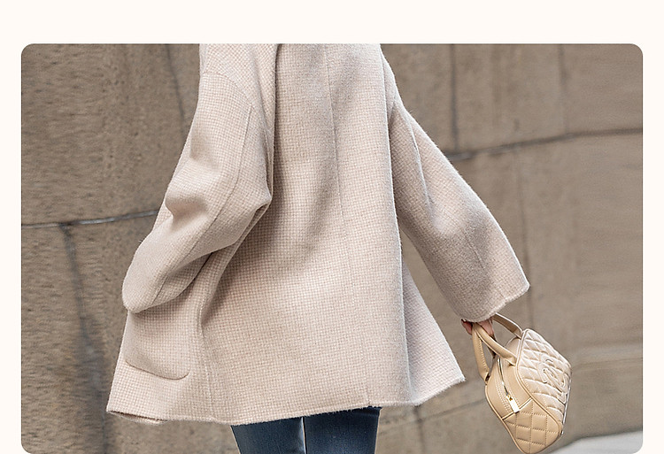【韩风大女主】24冬静奢千鸟格含绵羊毛双面呢双排扣松弛女外套