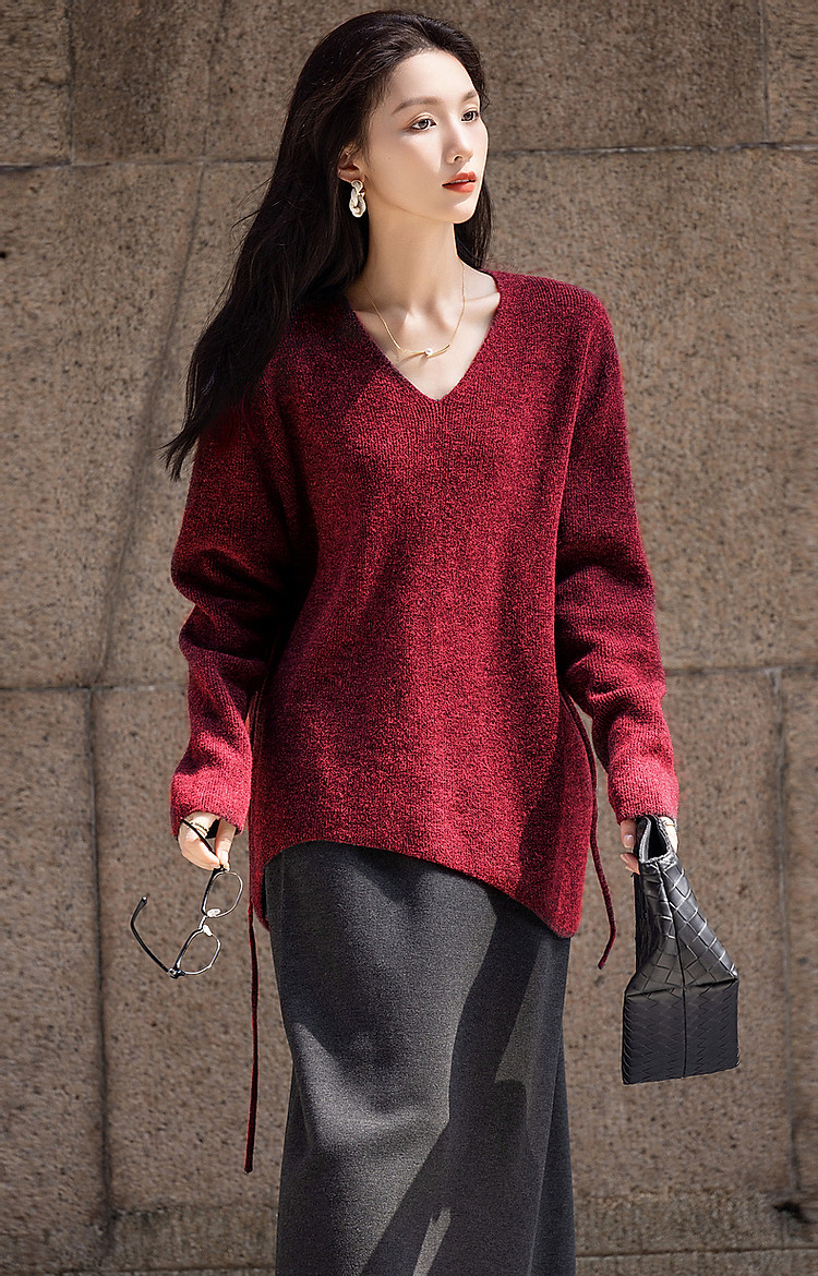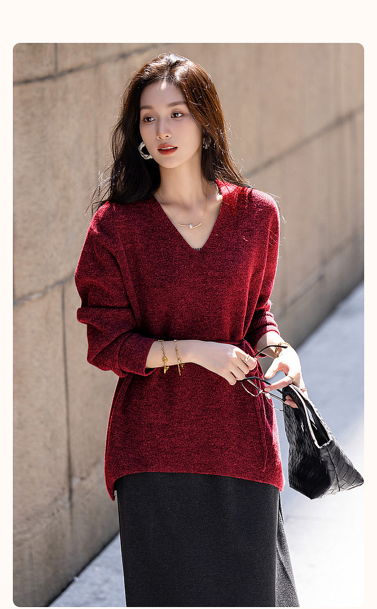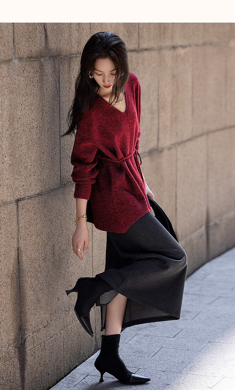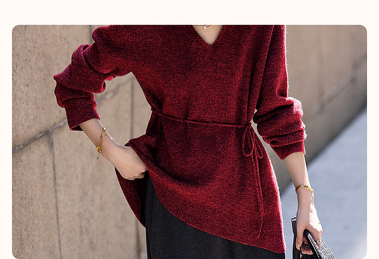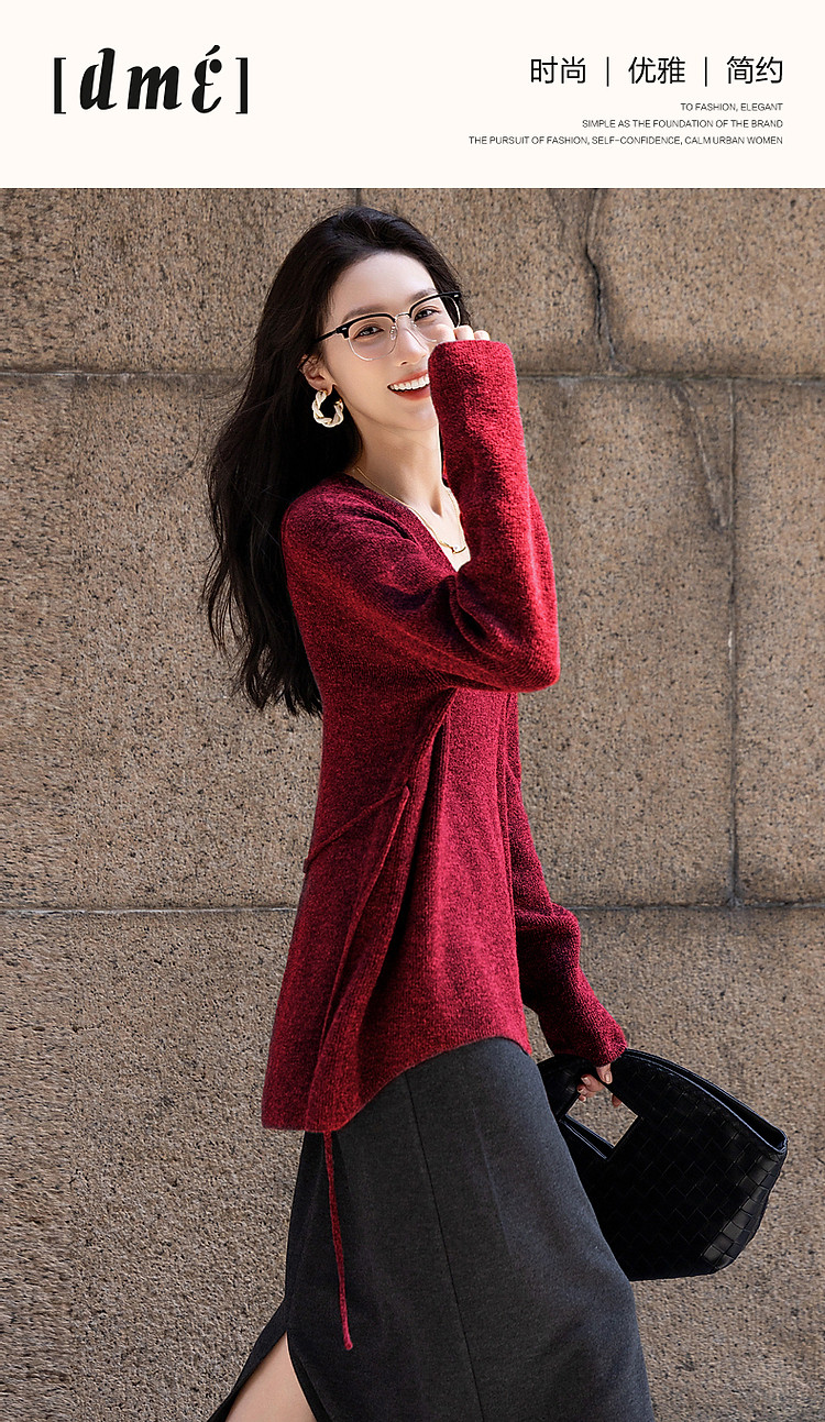 【圣诞恋人】秋冬淑女风V领可调节松紧腰带气质藏肉针织衫女上衣