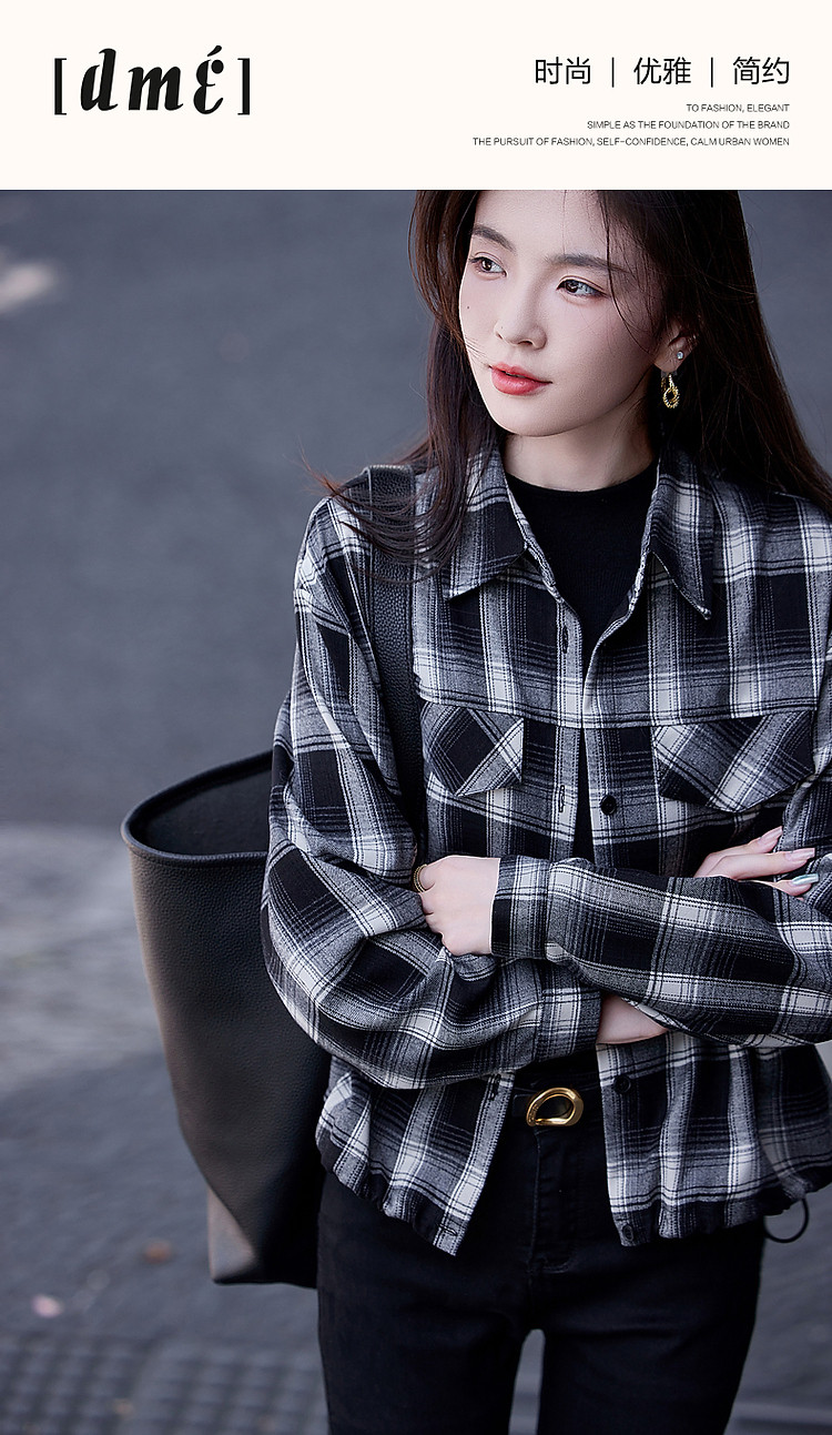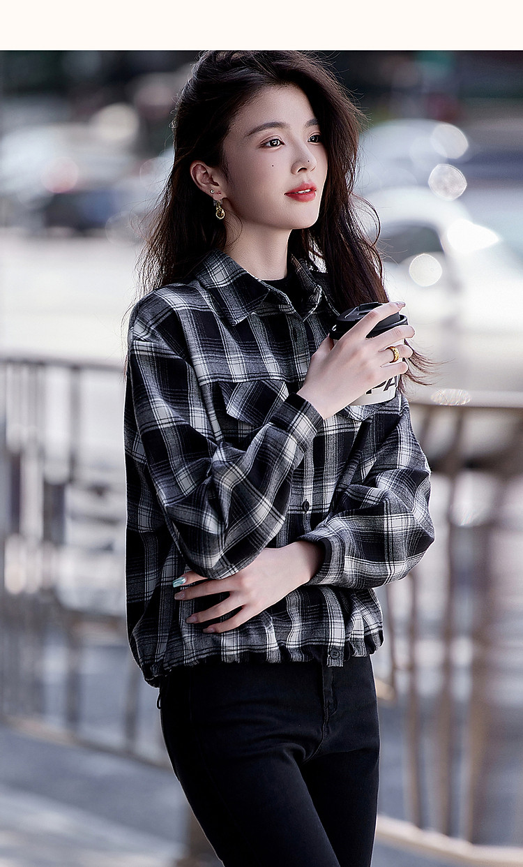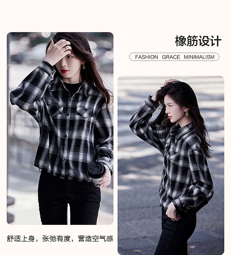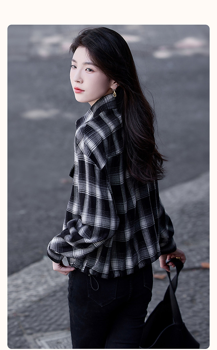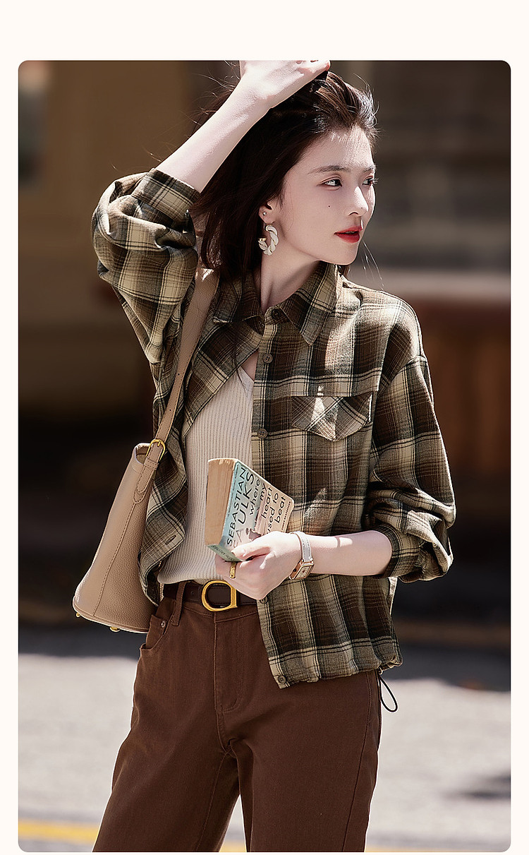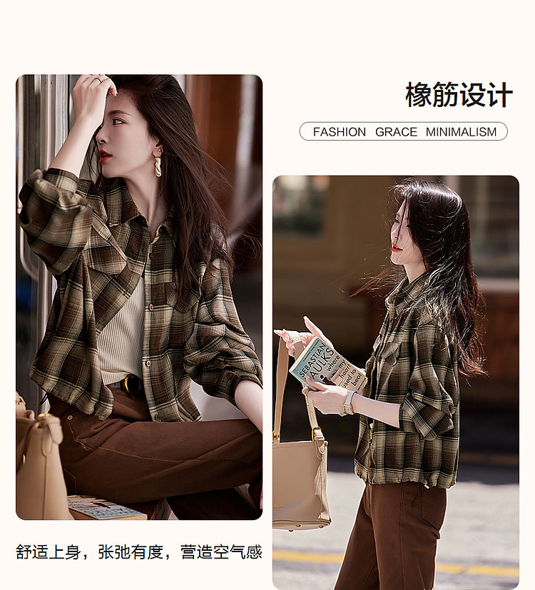 【知识分子穿搭】冬季简约风复古格纹衬衫可调节橡筋衬衣女装上衣