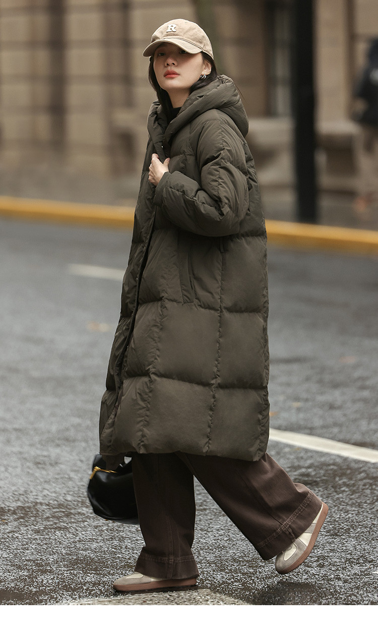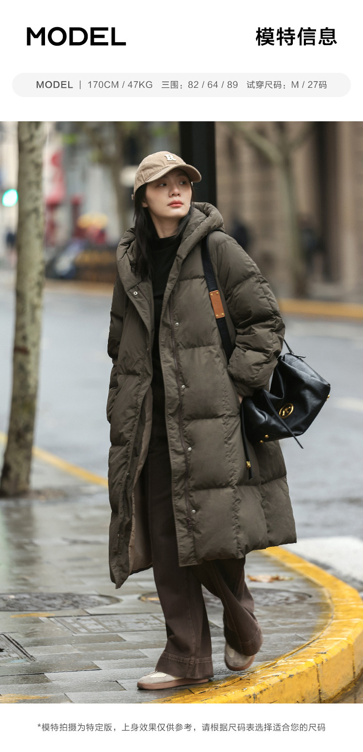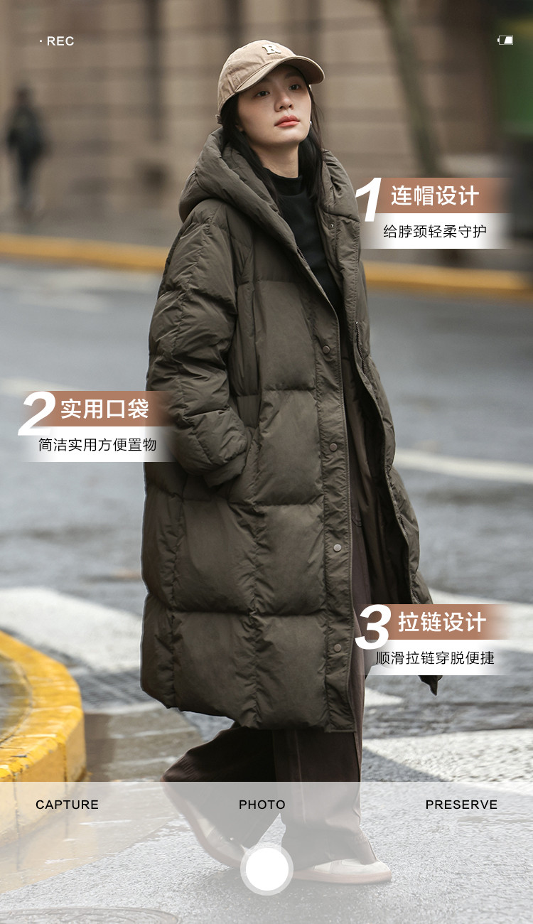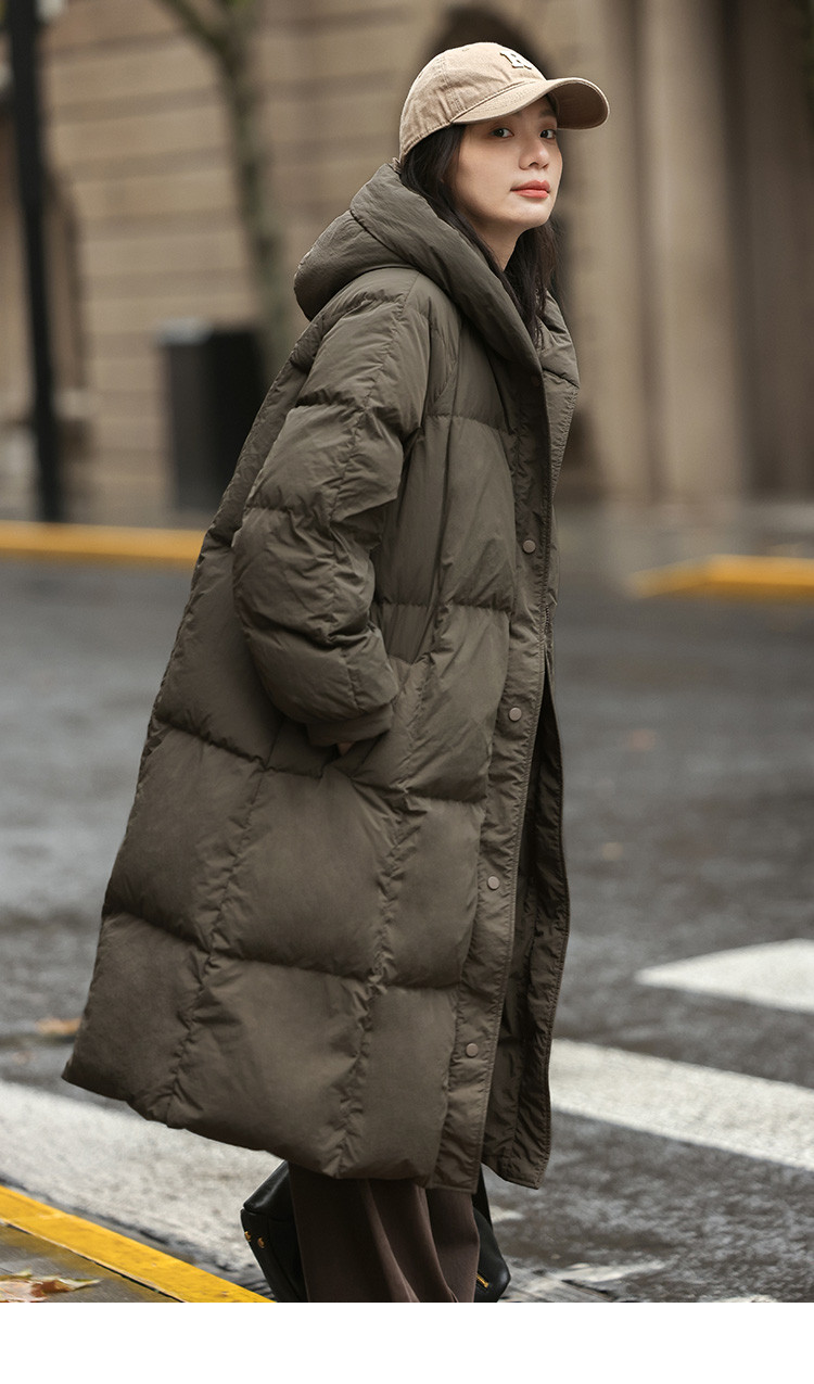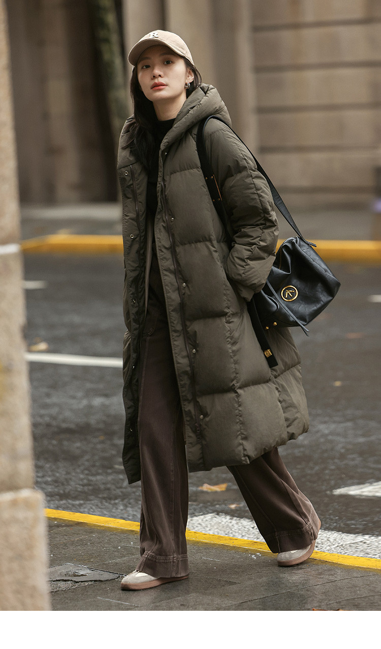 【复古长款连帽羽绒服】冬款斜插袋加腰带长款羽绒服女