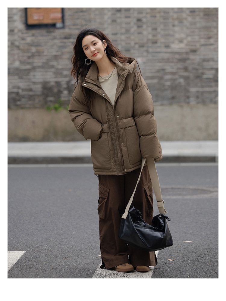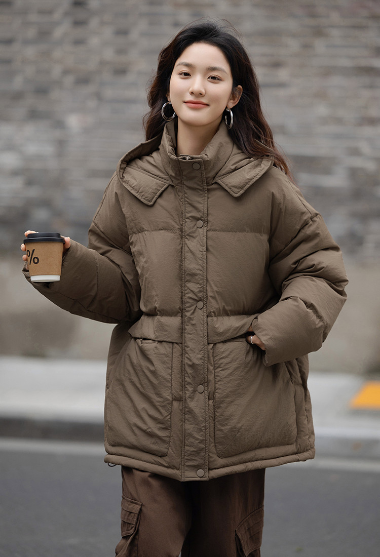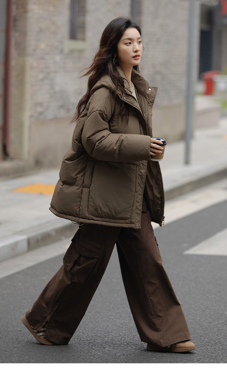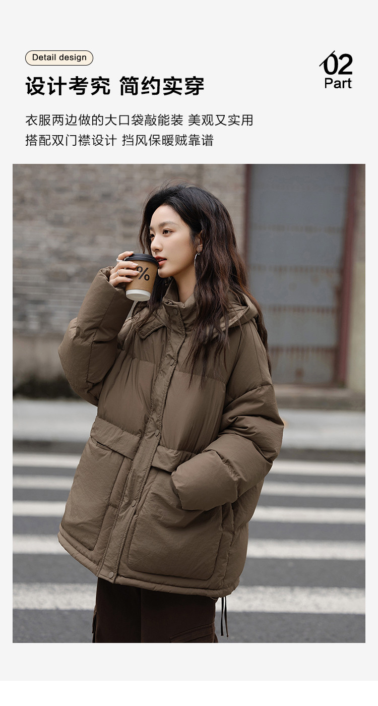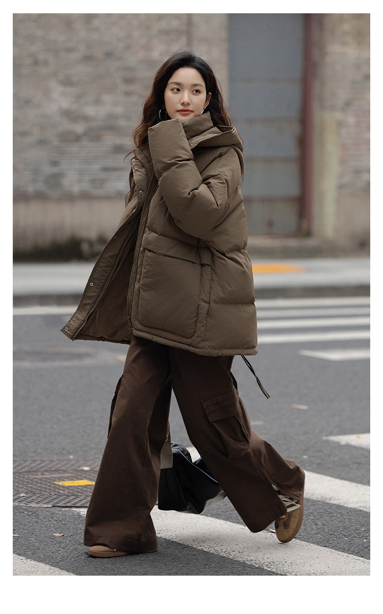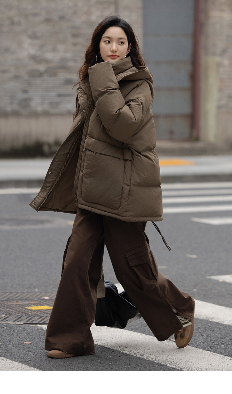 【复古浅咖羽绒服】2024冬款连帽大贴袋装饰一手长羽绒外套女