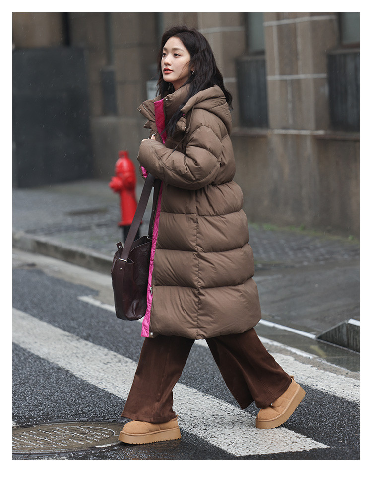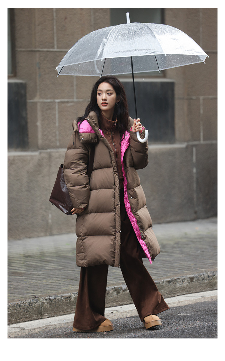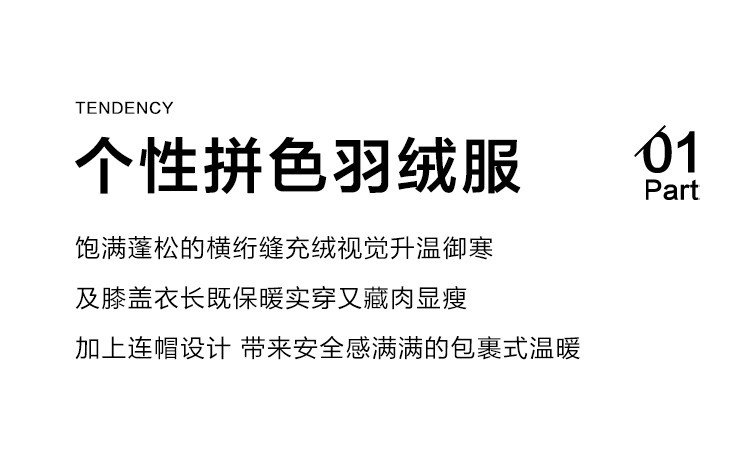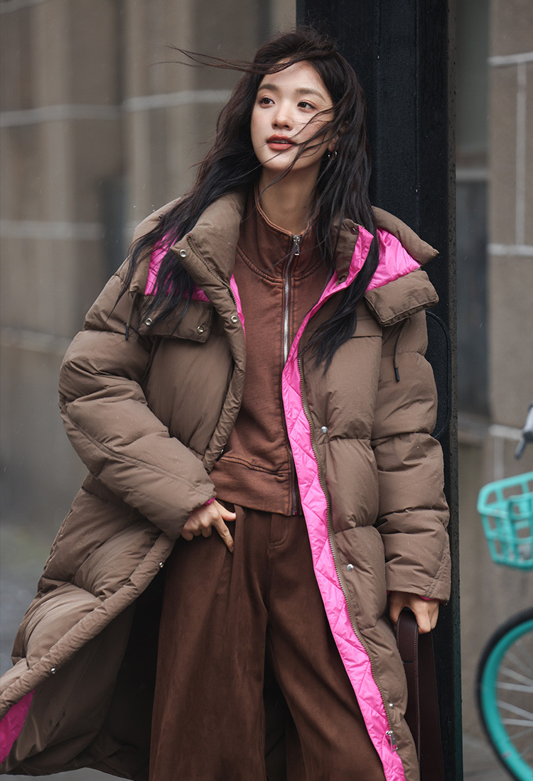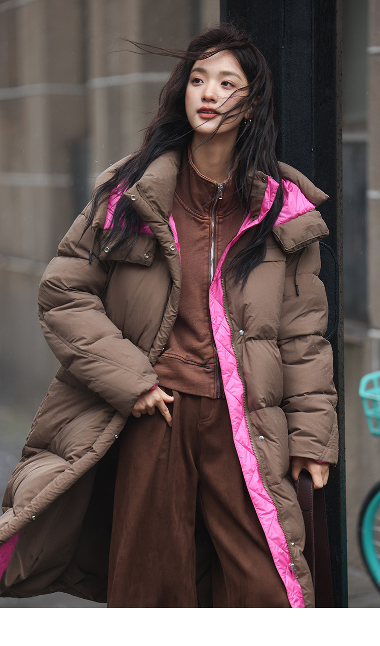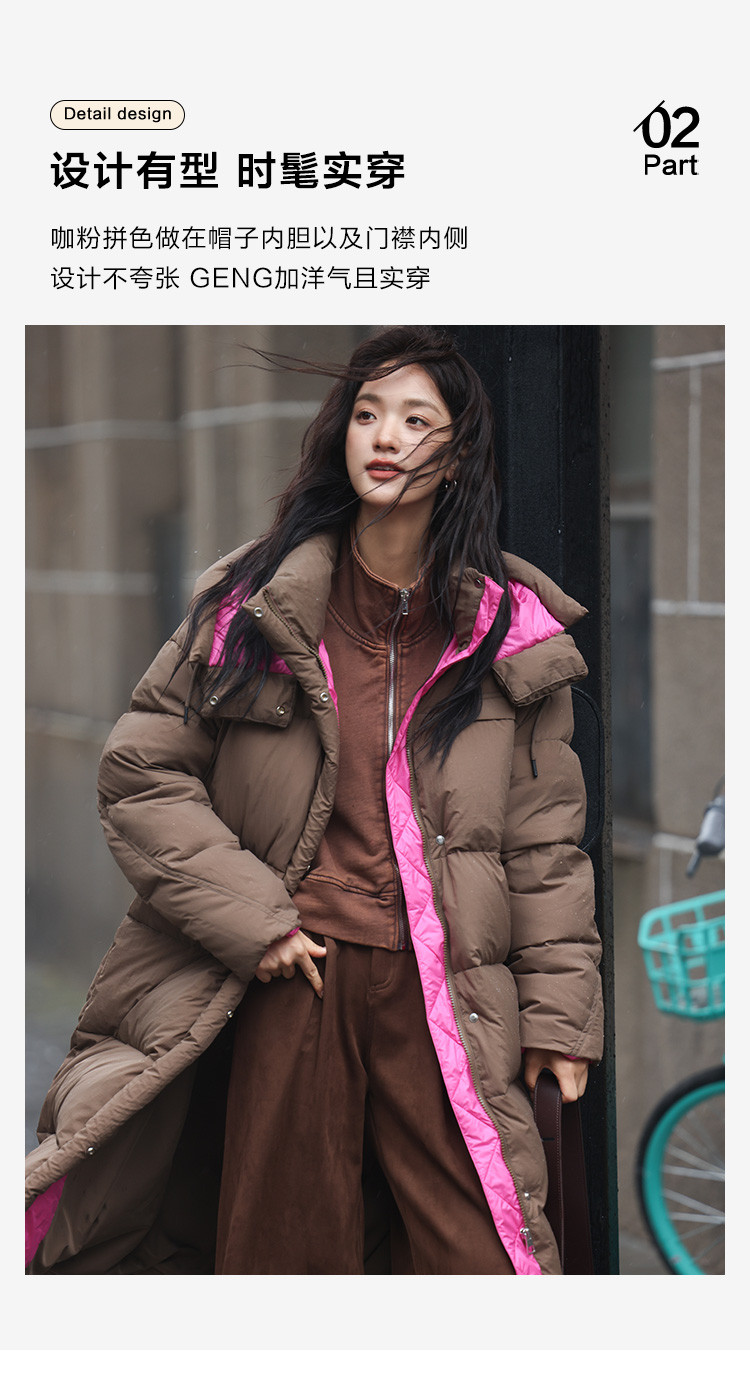 【个性撞色】2024冬款连帽抽绳系带袖子分割线装饰长款羽绒女