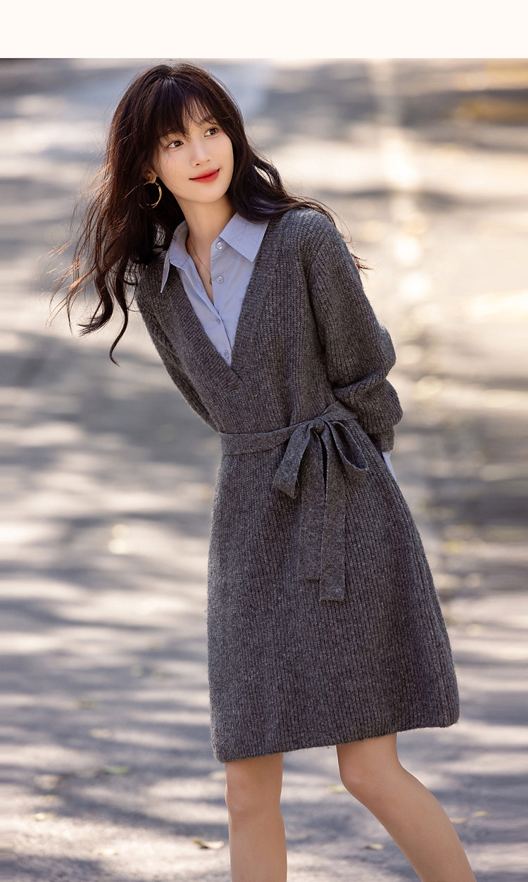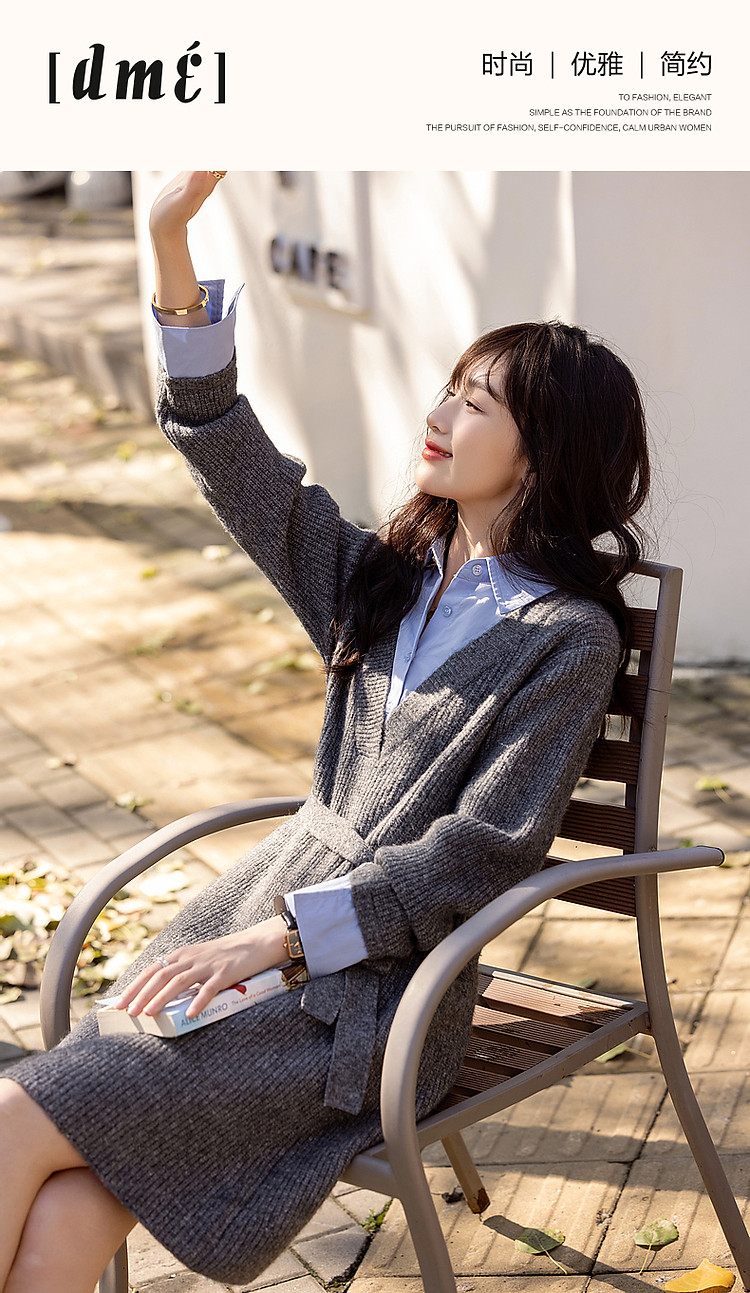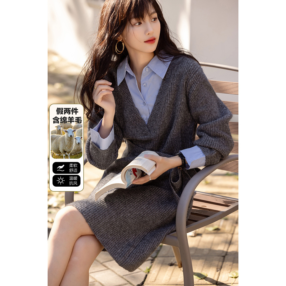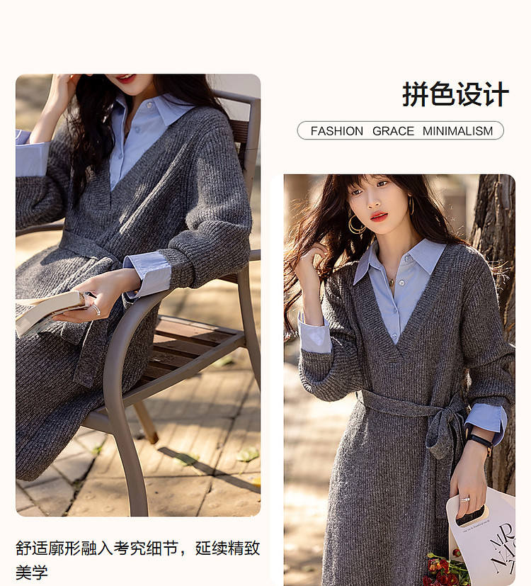 【淡颜高知穿搭】冬季假两件拼色腰带含呼吸感绵羊毛A字连衣裙女