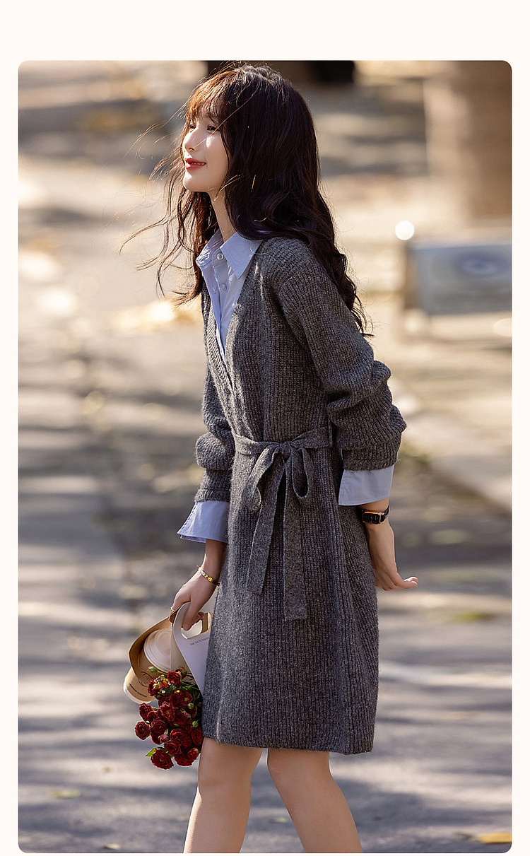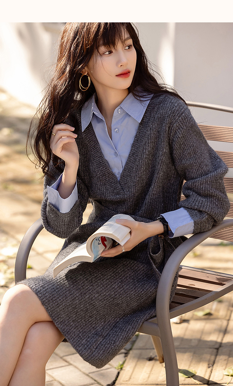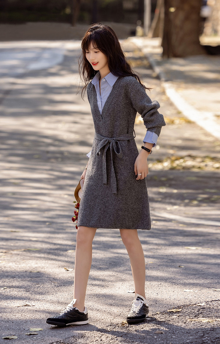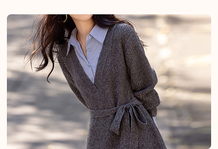 【淡颜高知穿搭】冬季假两件拼色腰带含呼吸感绵羊毛A字连衣裙女