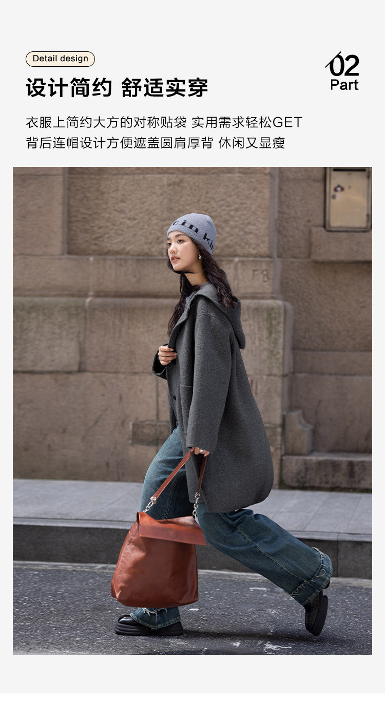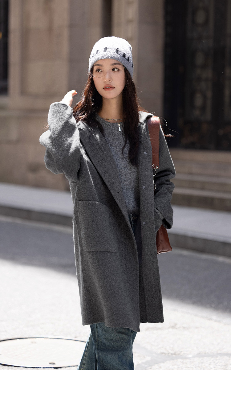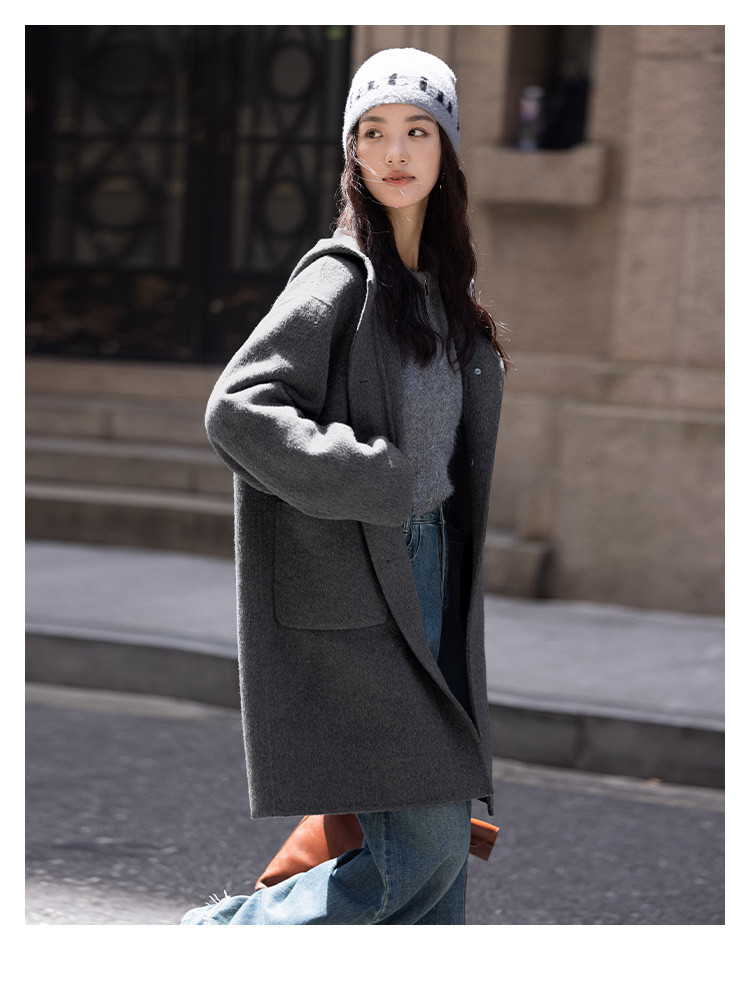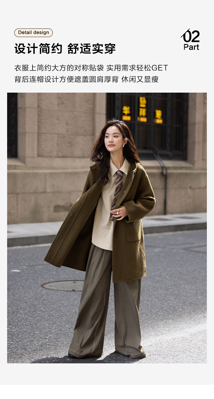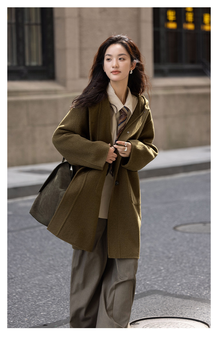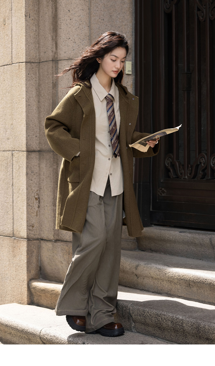 【学院风大衣】2024冬款连帽开门襟贴袋设计长袖中长款呢大衣