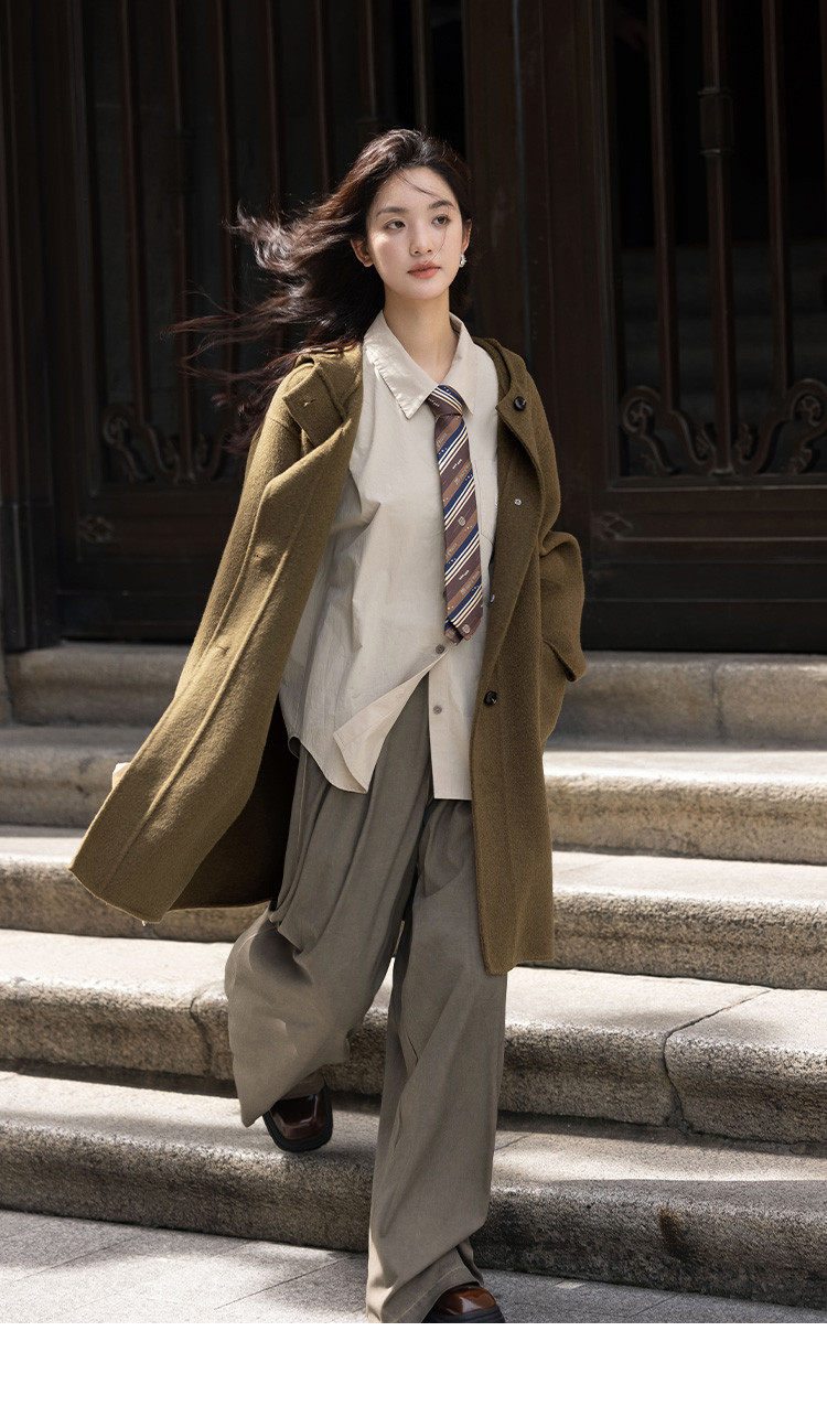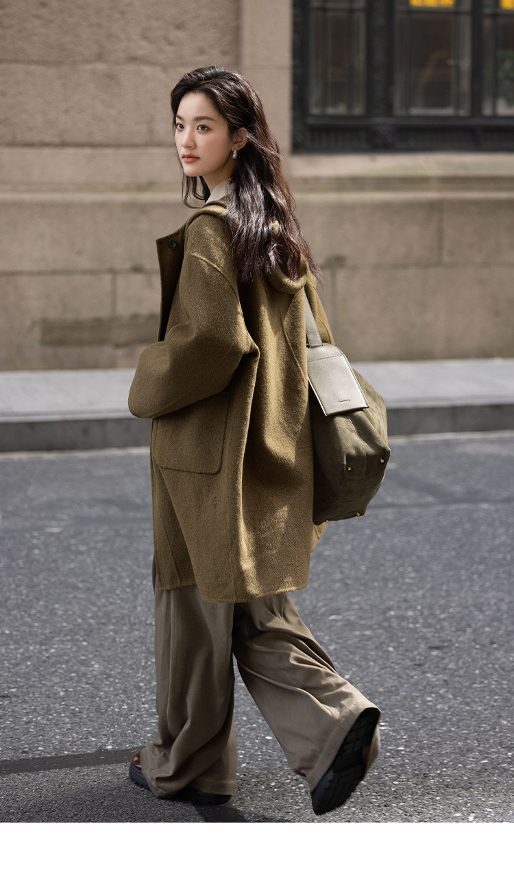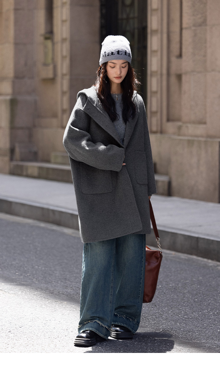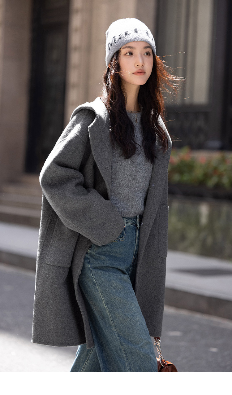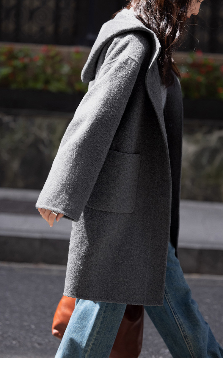 【学院风大衣】2024冬款连帽开门襟贴袋设计长袖中长款呢大衣