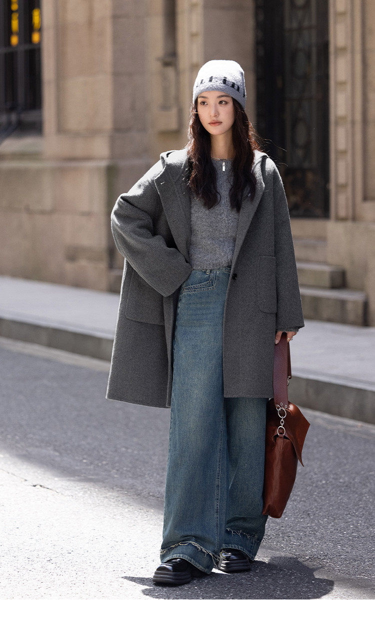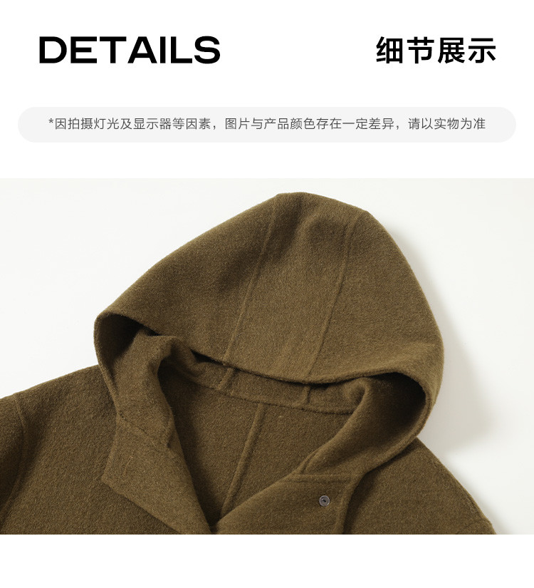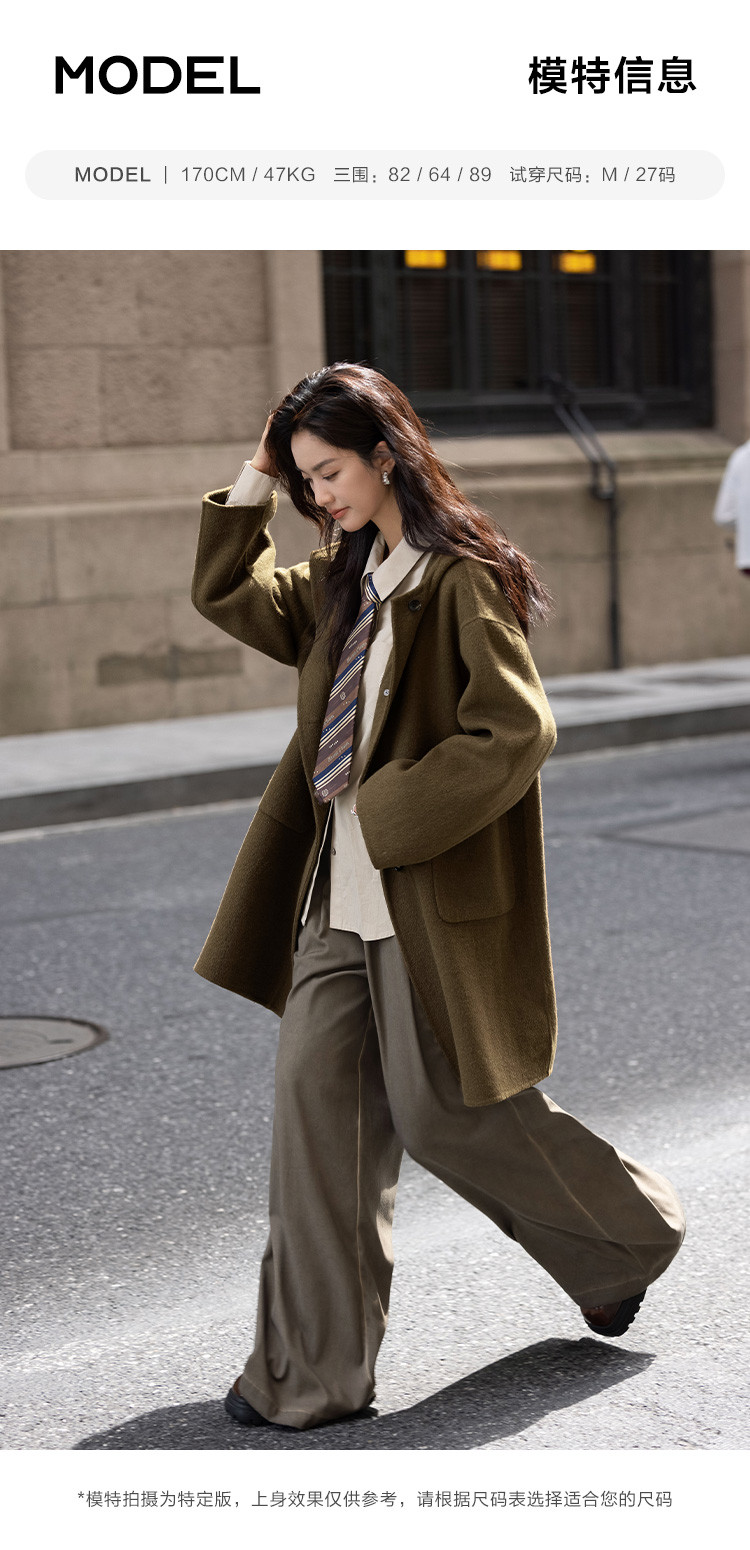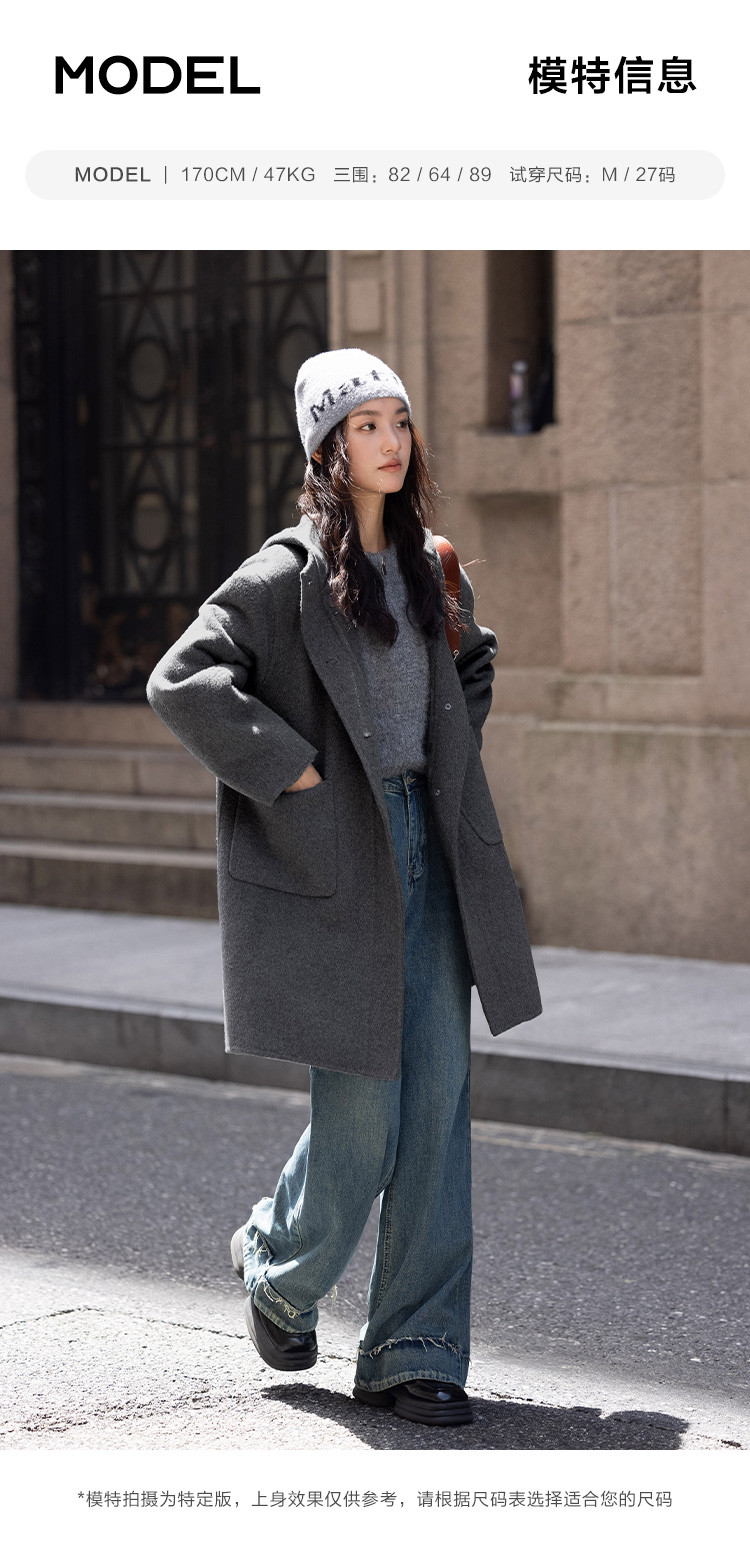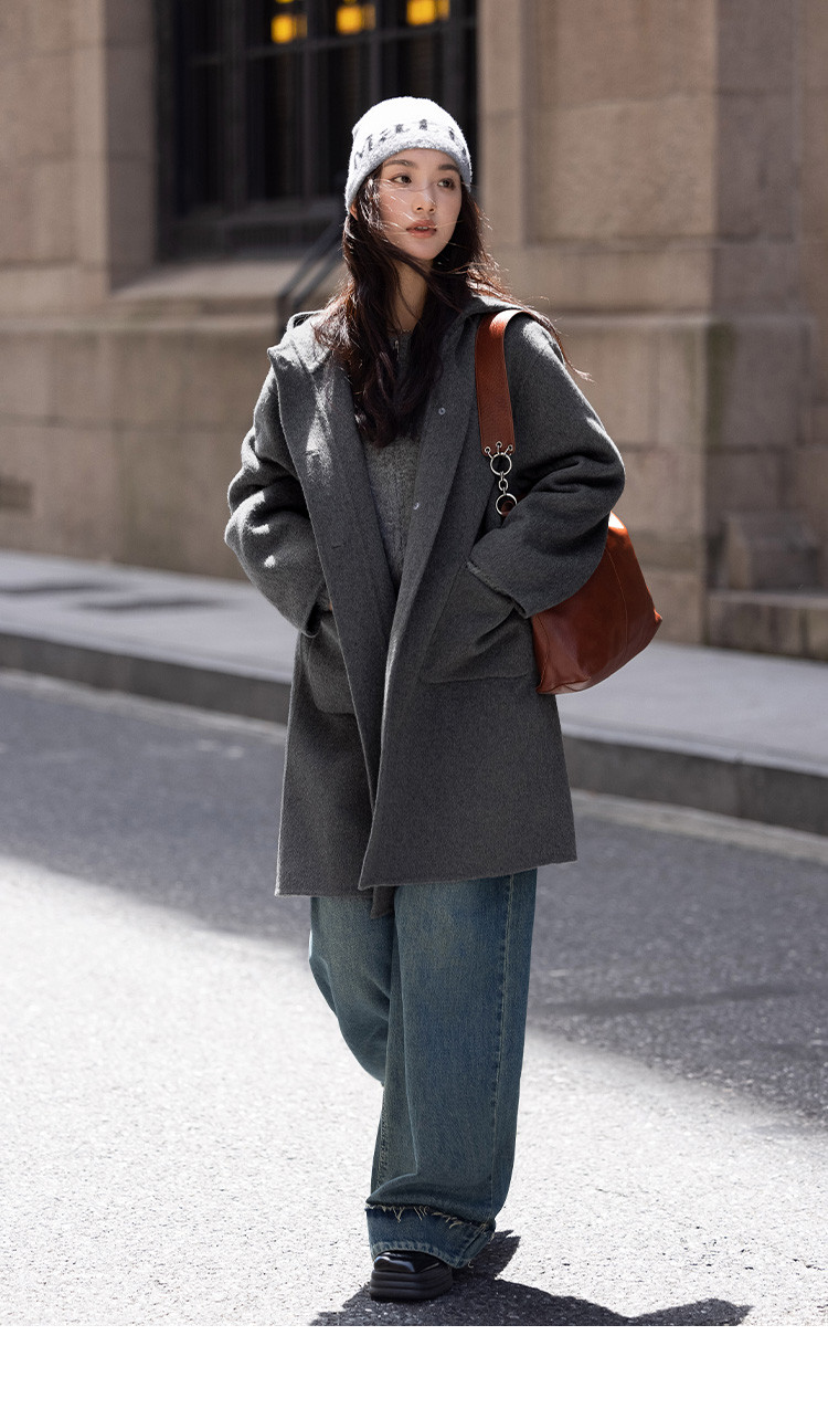 【学院风大衣】2024冬款连帽开门襟贴袋设计长袖中长款呢大衣