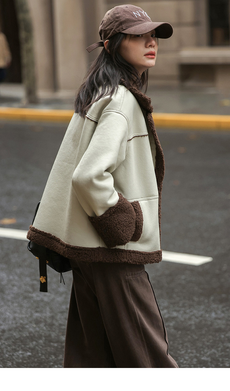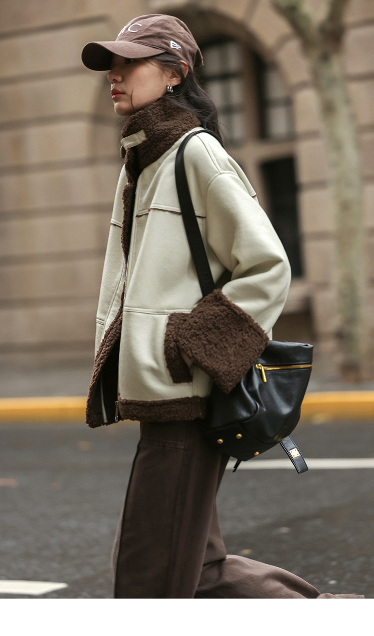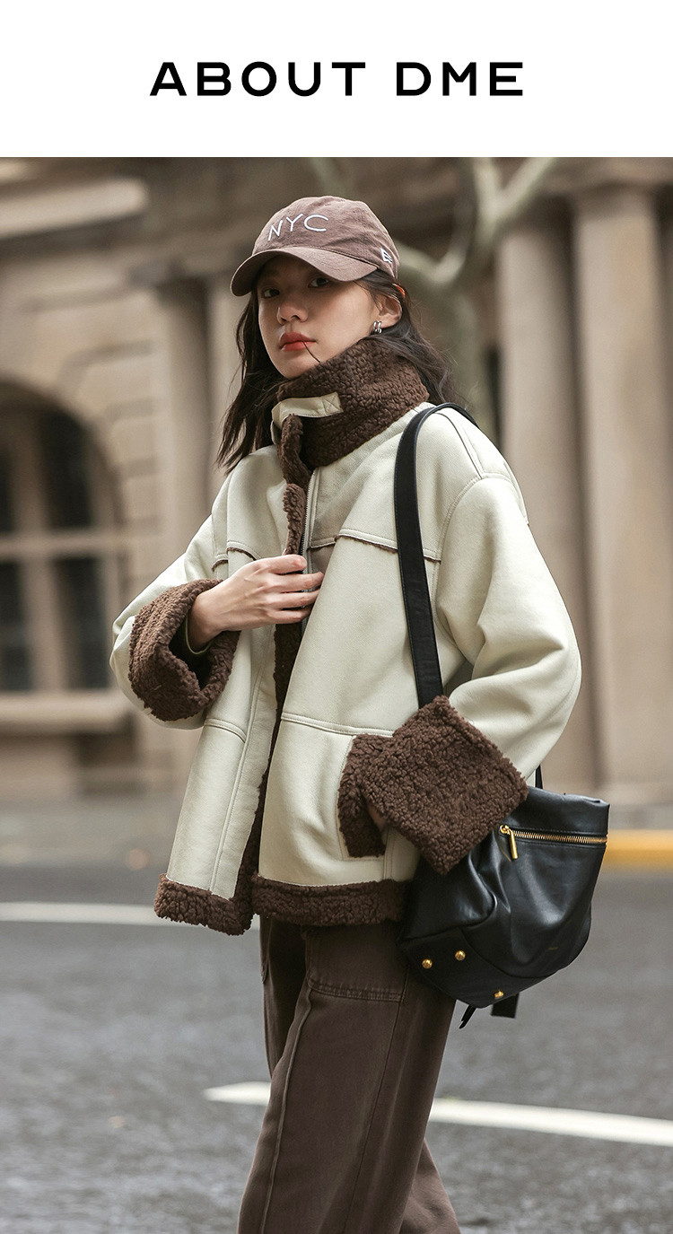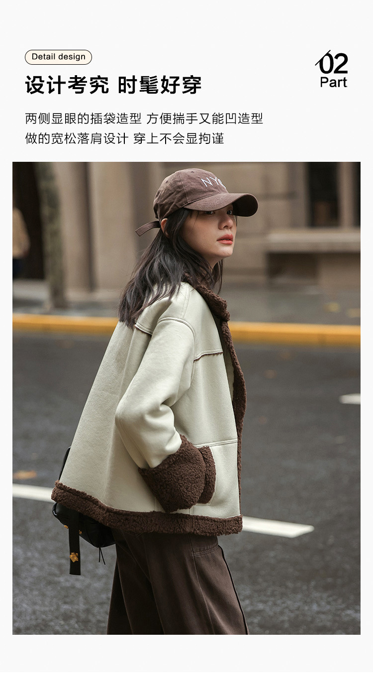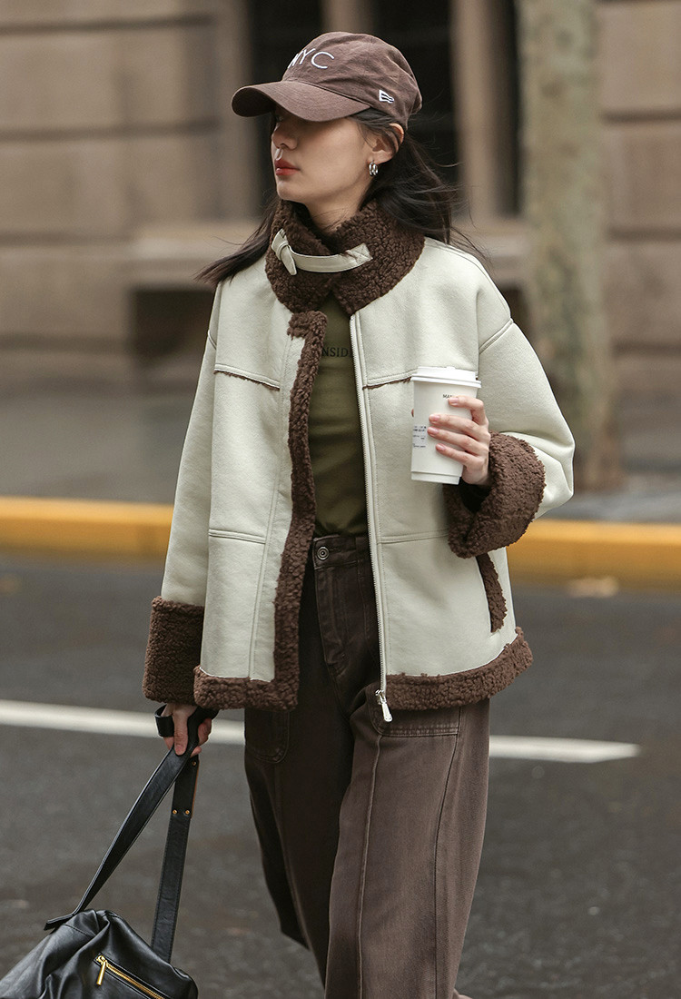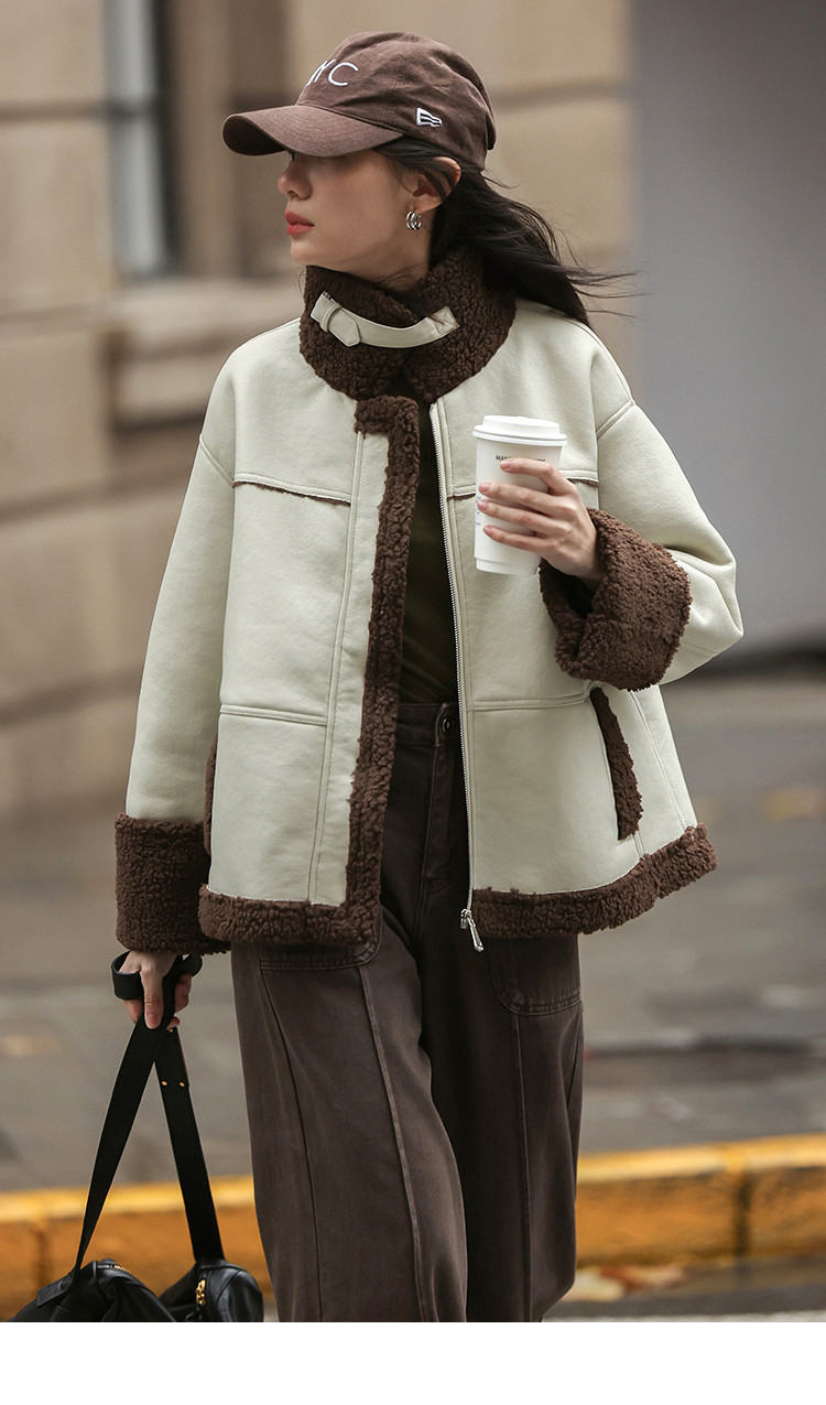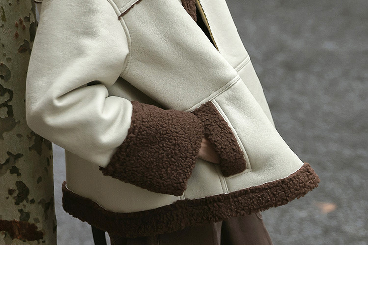 【机车风仿羊羔毛】冬款PU皮拼接个性咖绿拼接外套女