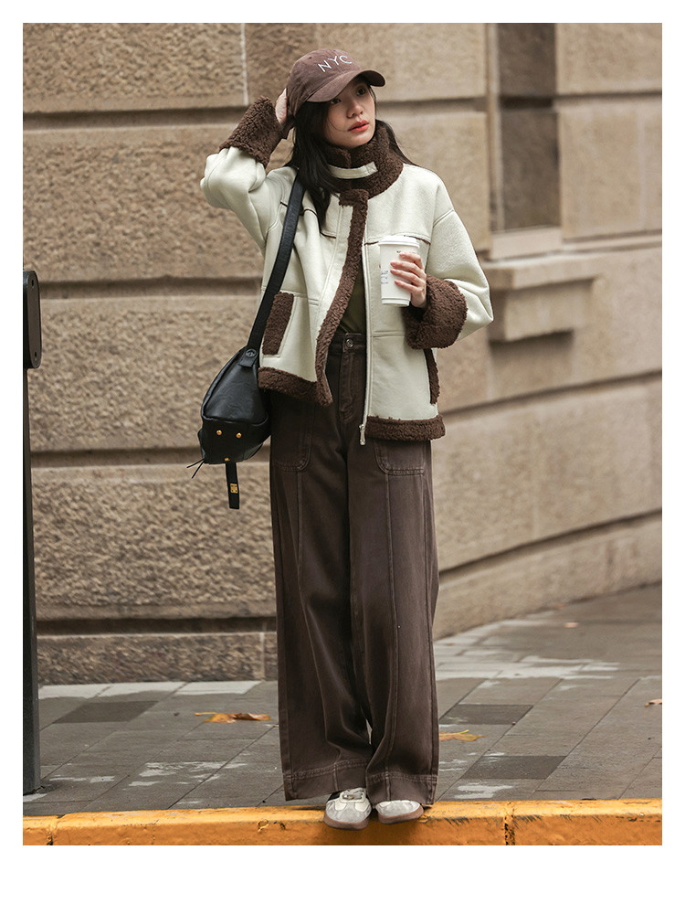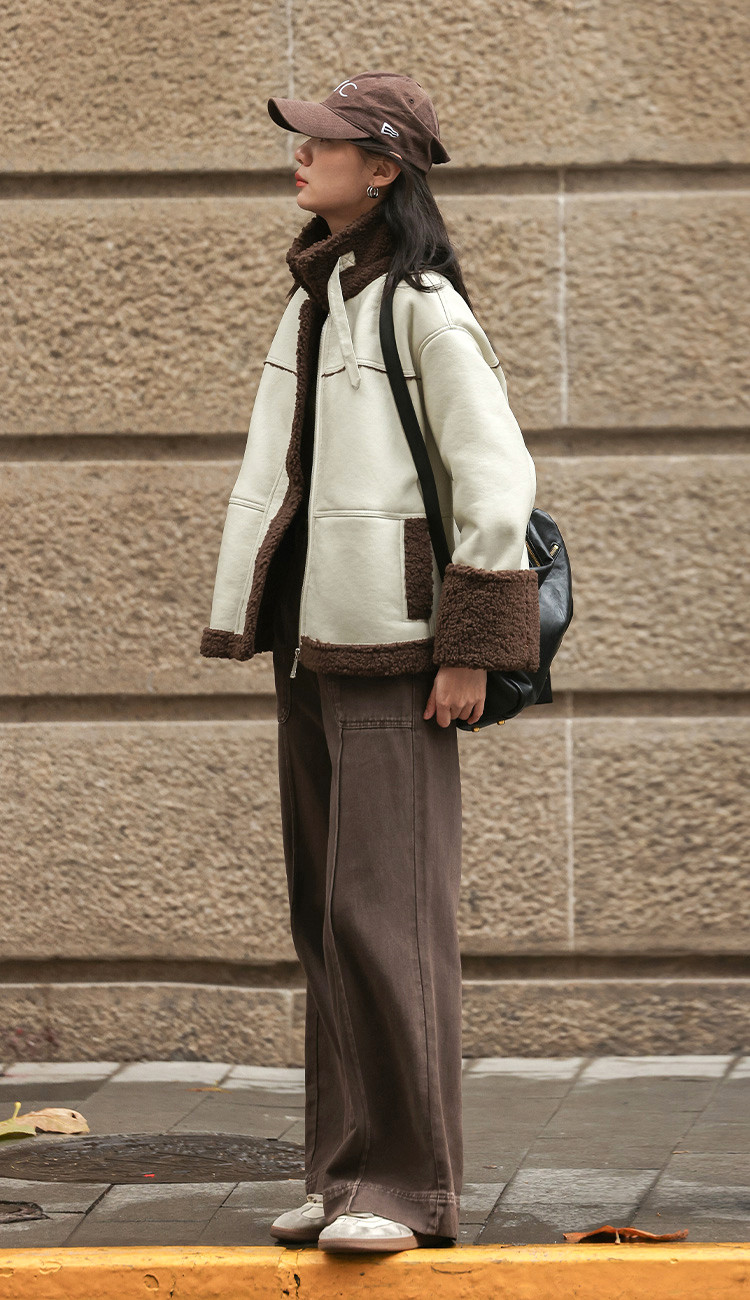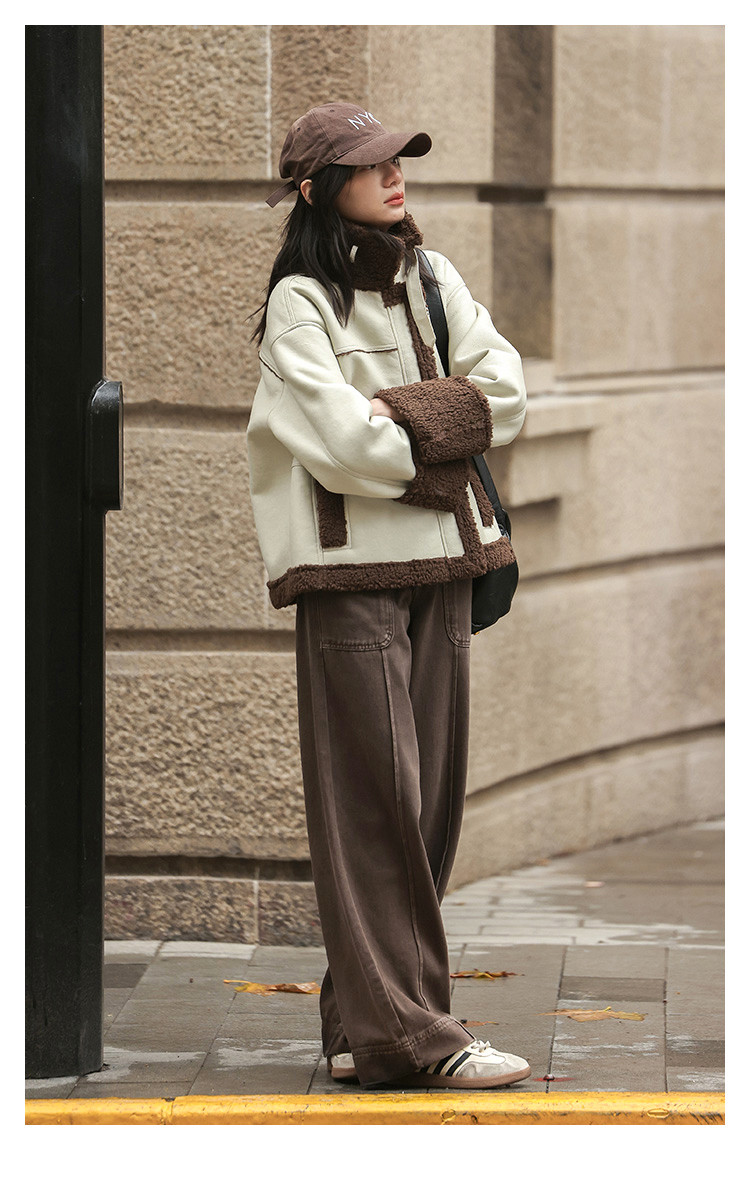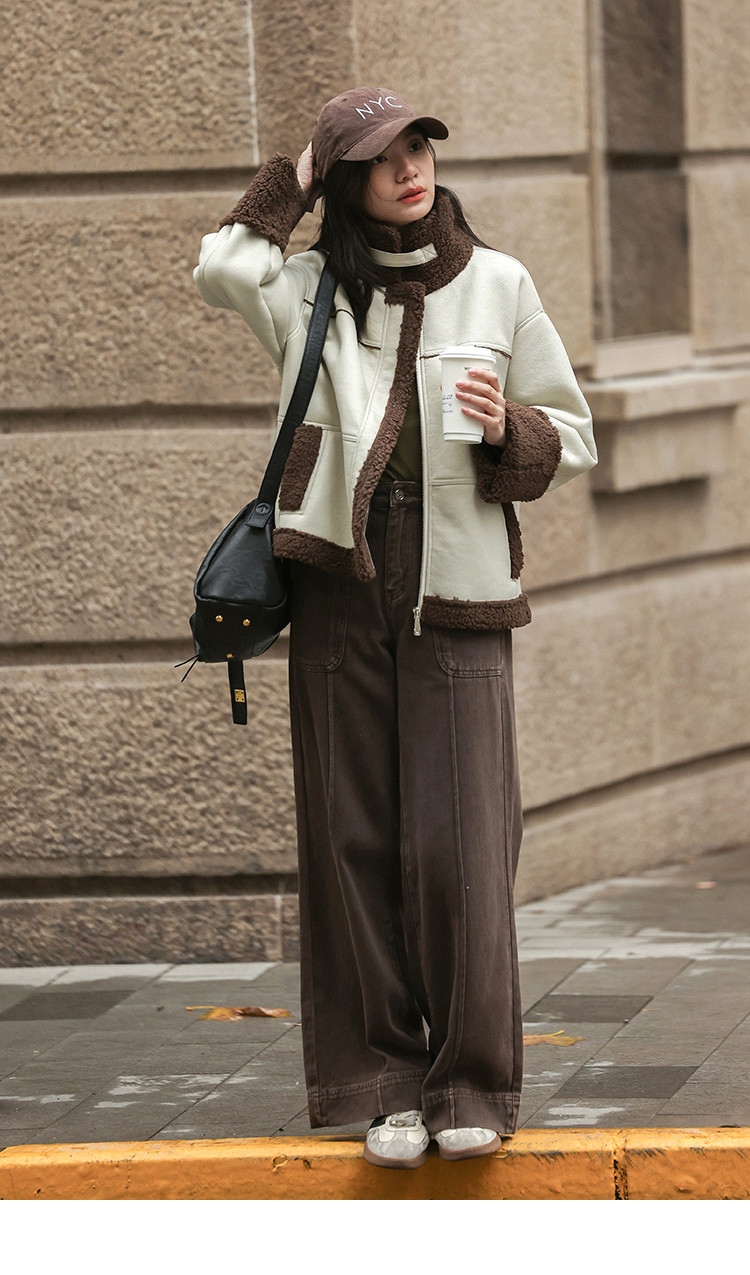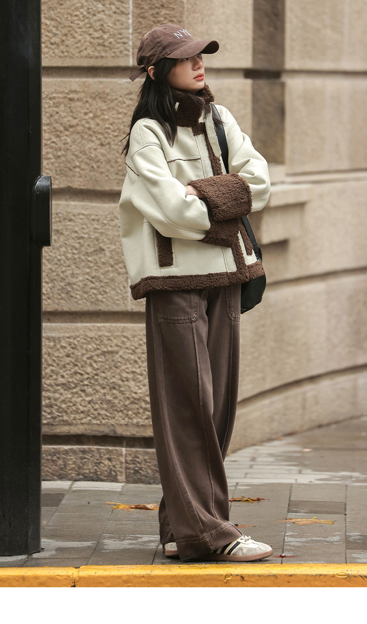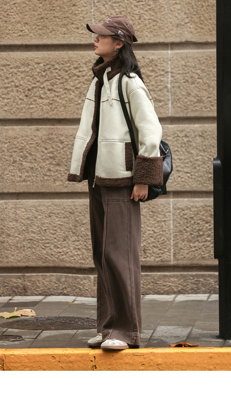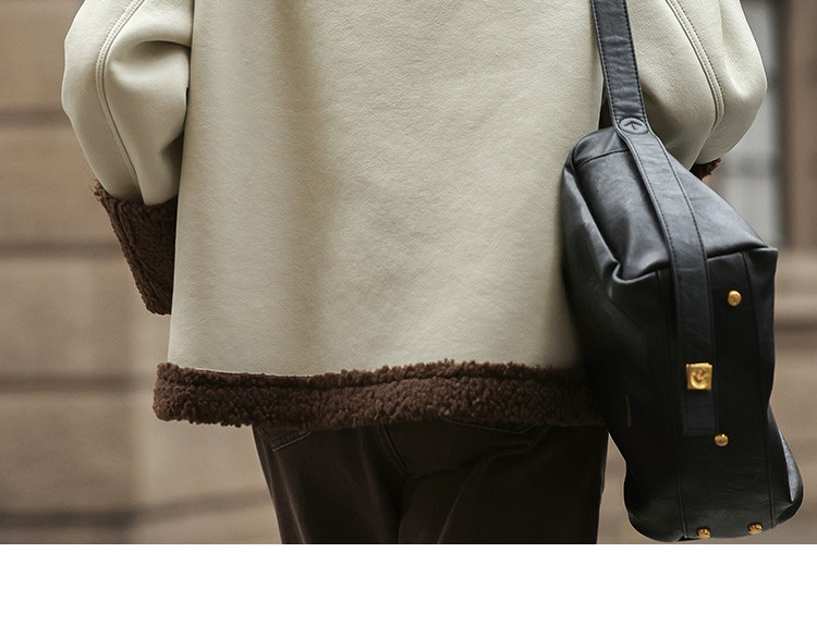 【机车风仿羊羔毛】冬款PU皮拼接个性咖绿拼接外套女