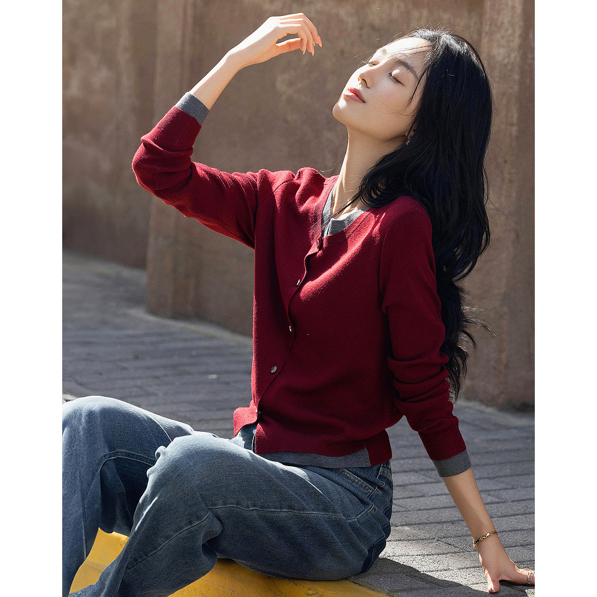 【静奢灵感衣橱】春秋设计感假两件撞色线衫装饰扣针织衫女上衣