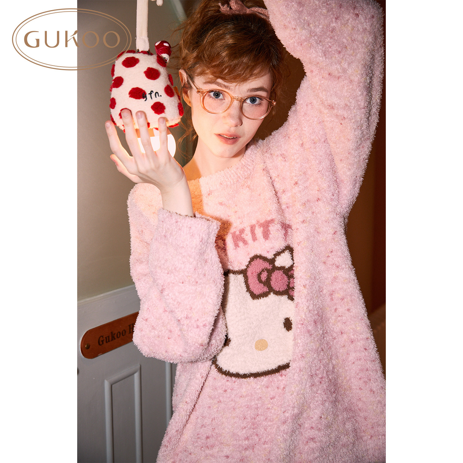 Gukoo/果壳新款半边绒睡衣女秋冬HelloKitty联名可爱家居服套装D