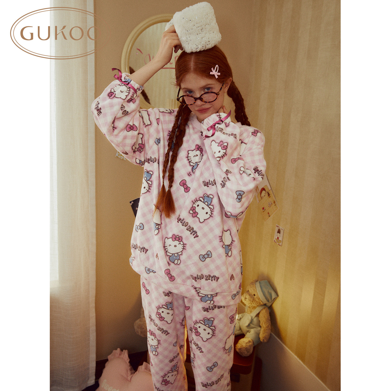 Gukoo/果壳睡衣冬季HelloKitty联名新款甜美保暖女士家居服套装D