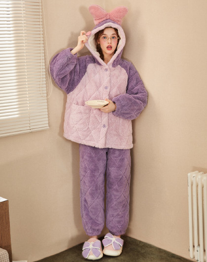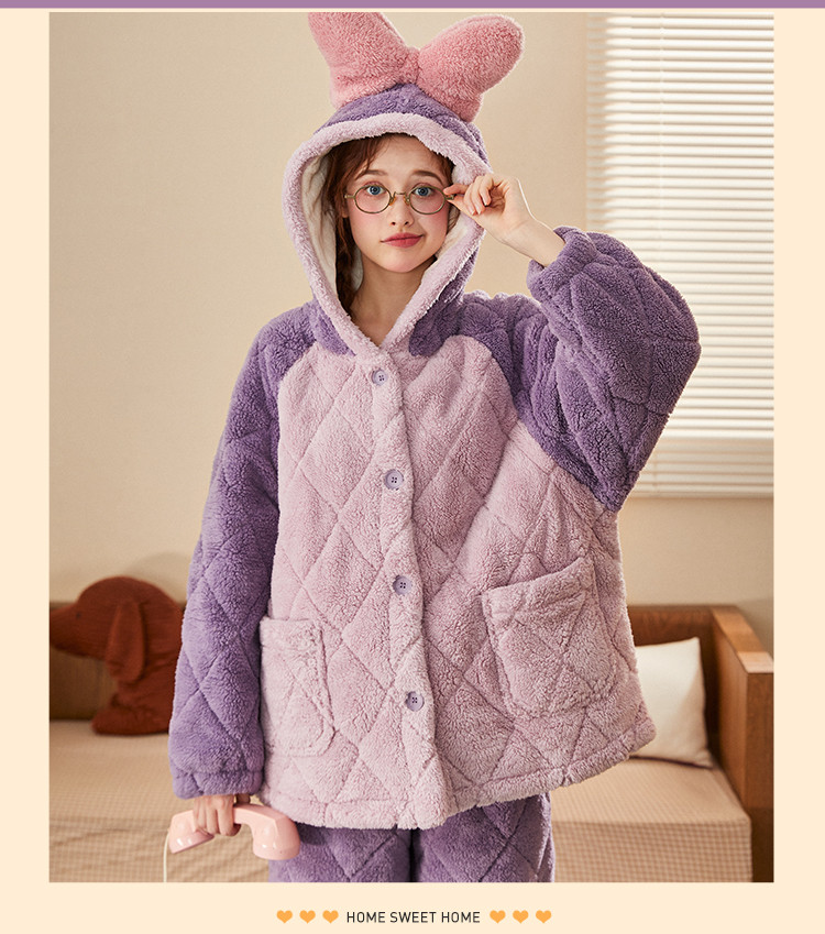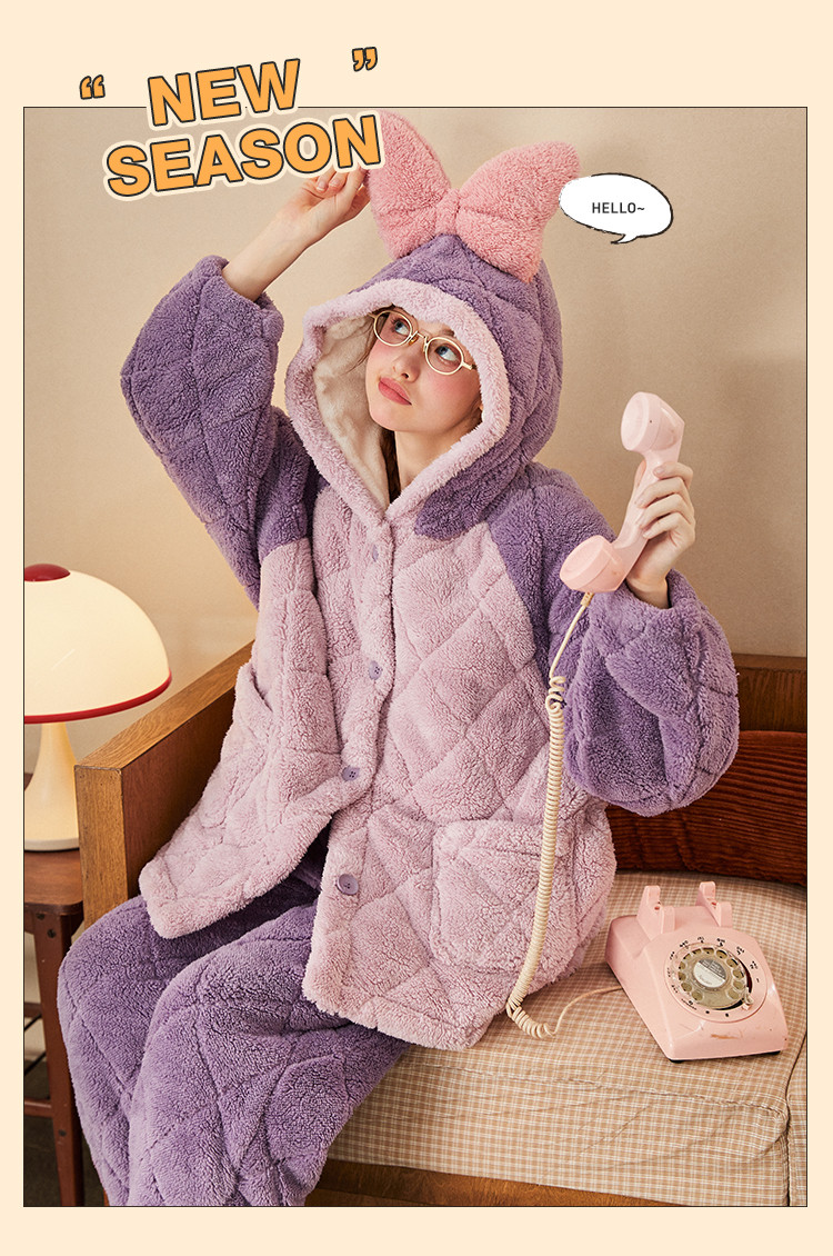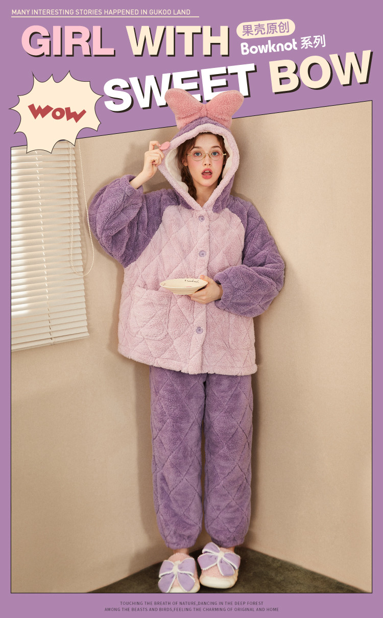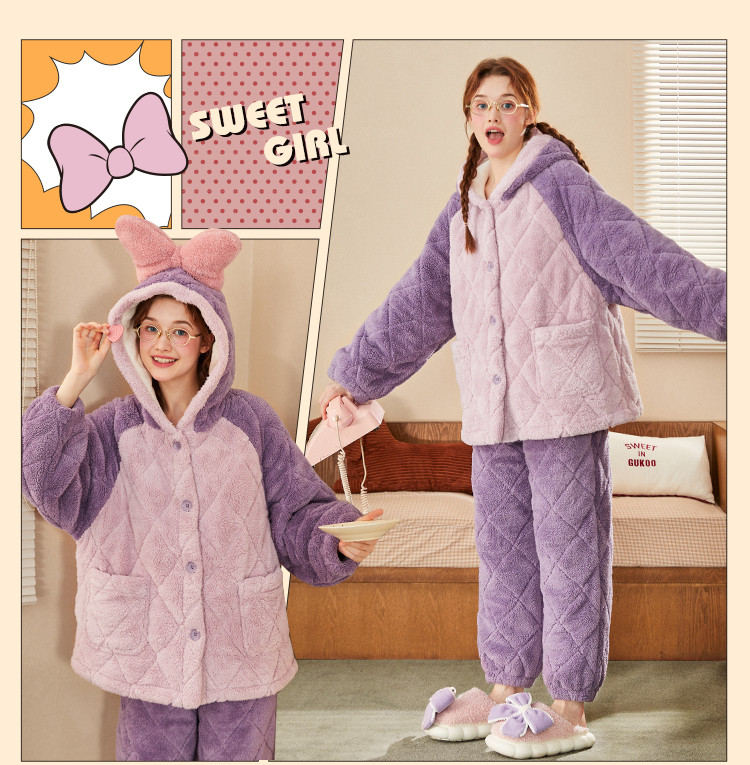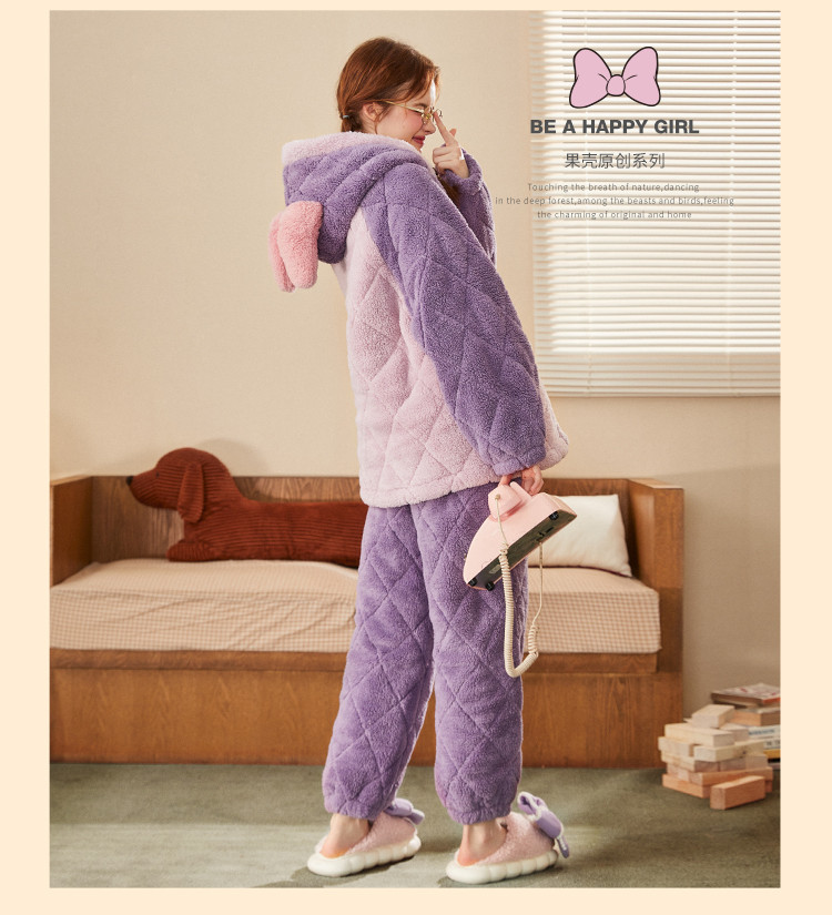 Gukoo/果壳【加厚夹棉】睡衣女秋冬连帽加厚夹棉保暖甜美家居服套装可外穿