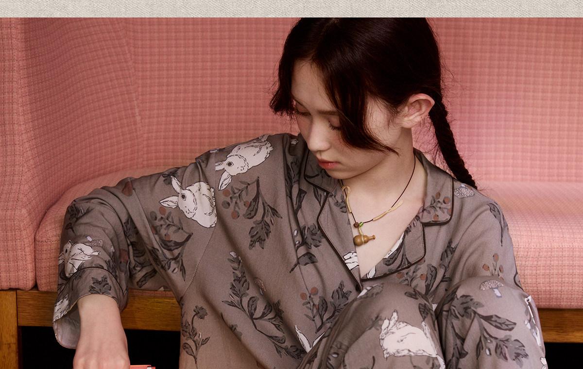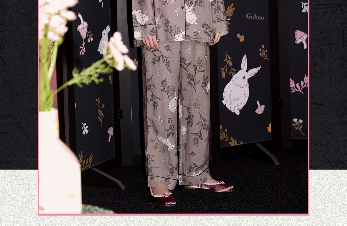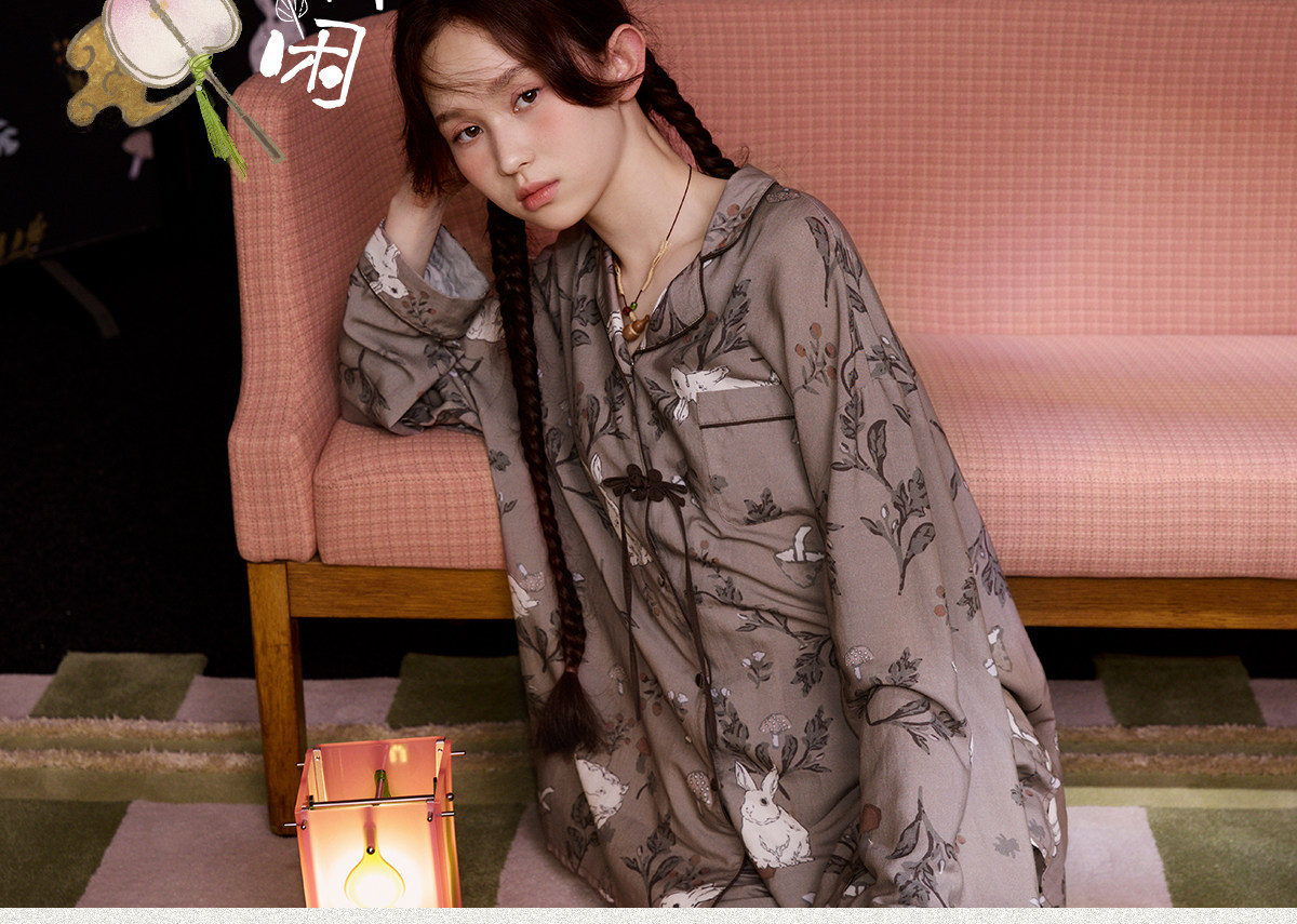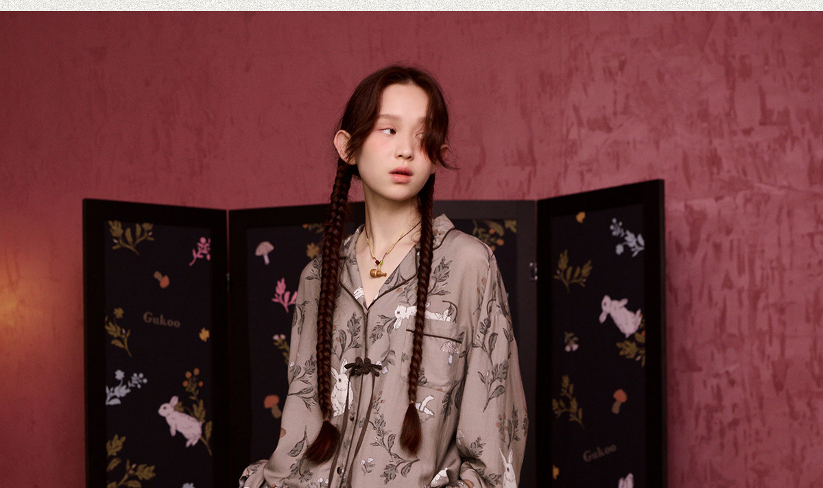 Gukoo/果壳睡衣女春秋款兔子满印新款新中式宽松女士家居服套装C