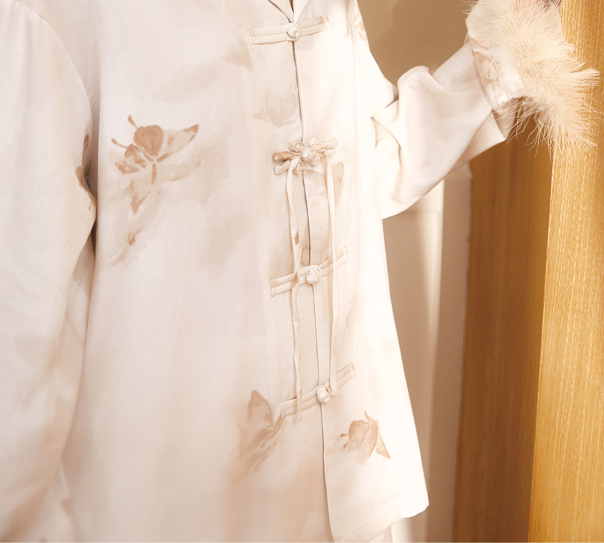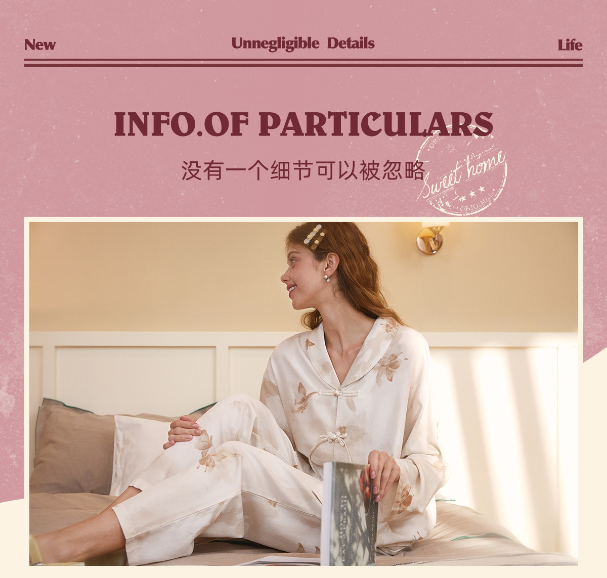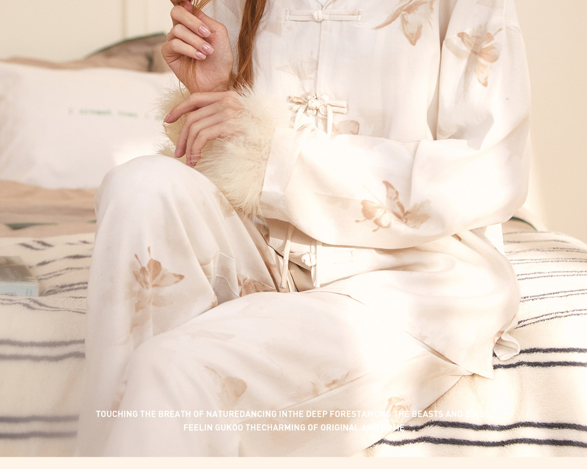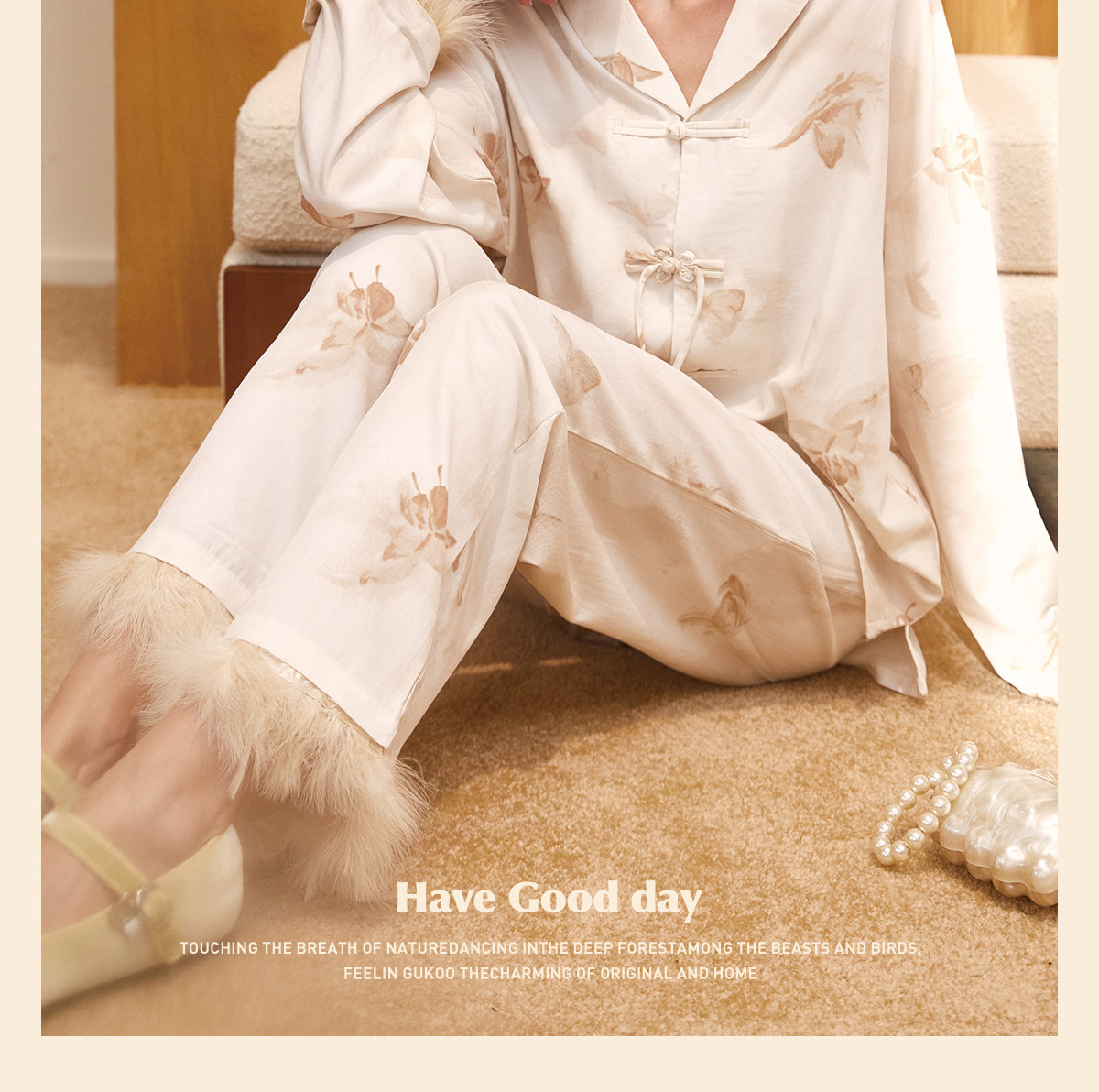 Gukoo/果壳睡衣女春秋款蝴蝶新款简约新中式天丝女士家居服套装C
