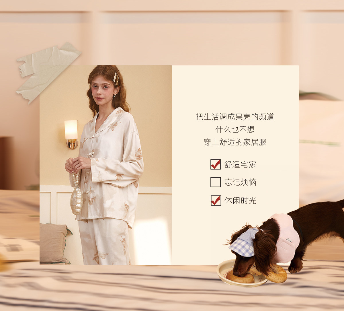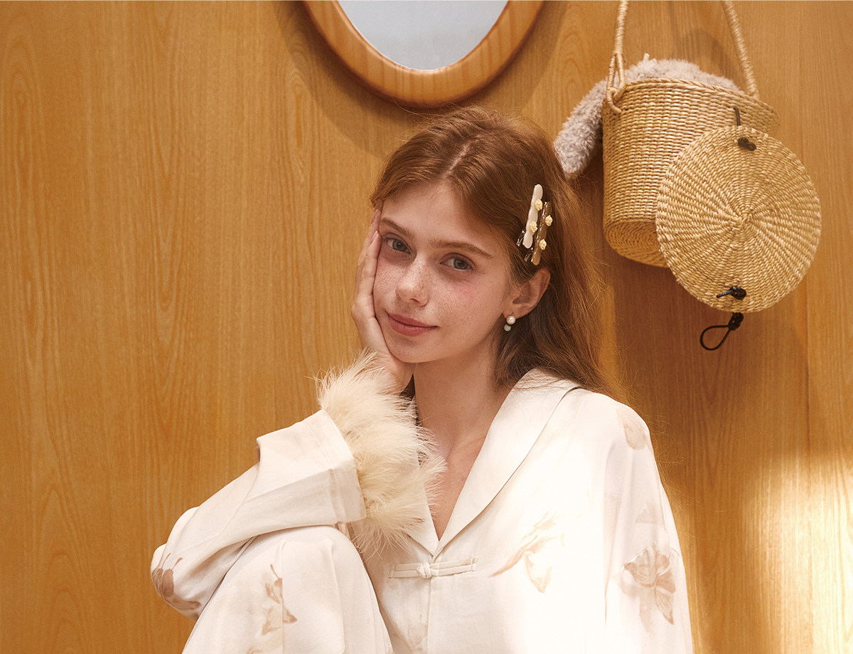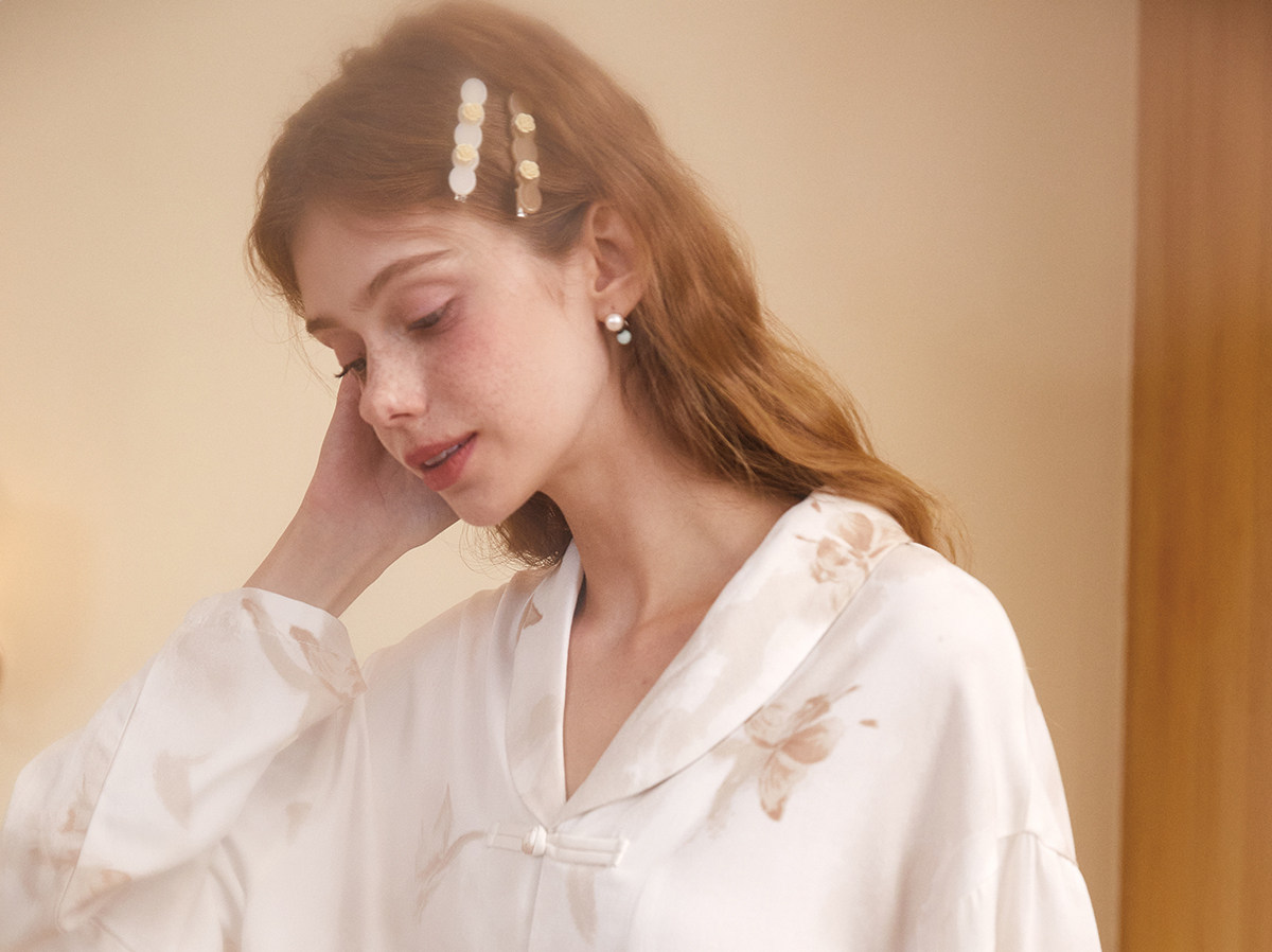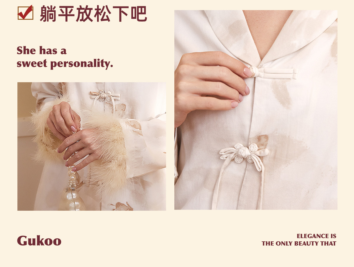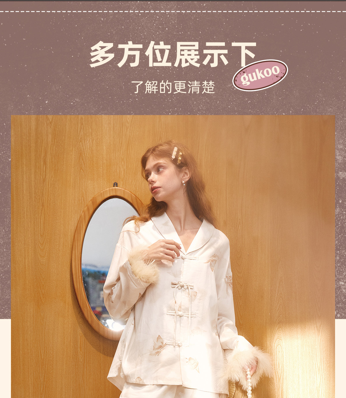Gukoo/果壳睡衣女春秋款蝴蝶新款简约新中式天丝女士家居服套装C