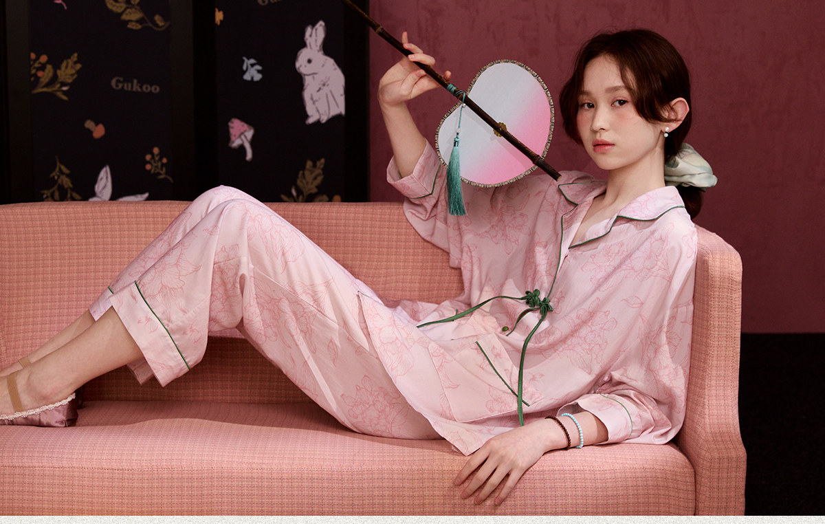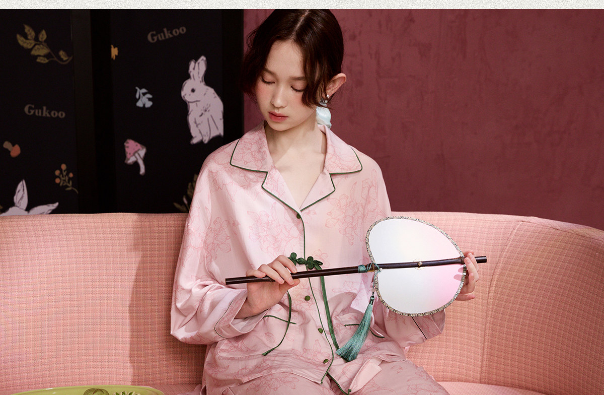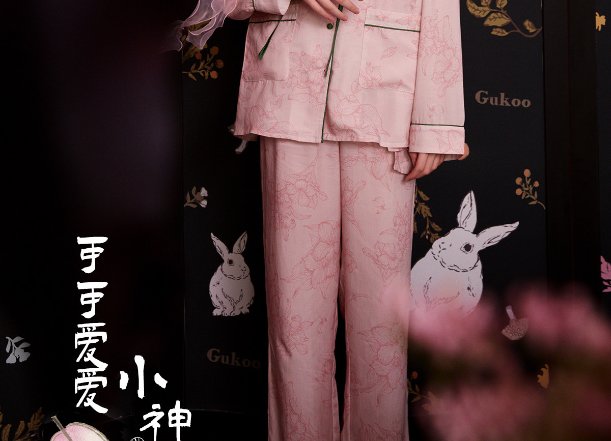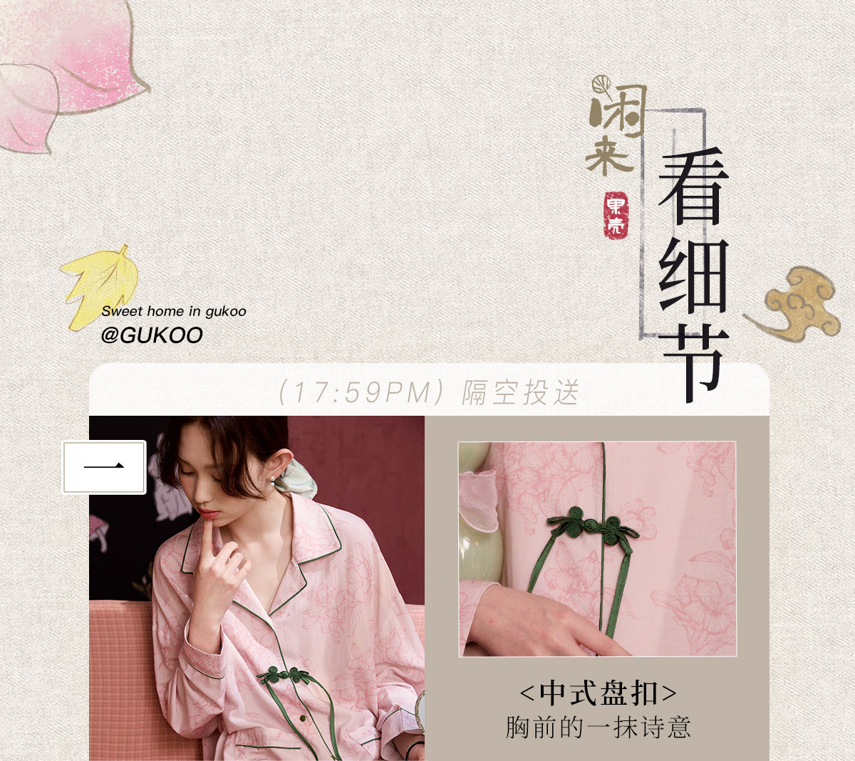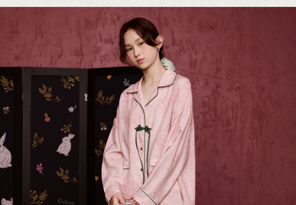 Gukoo/果壳睡衣女春秋款新中式花纹满印新款女士家居服套装C