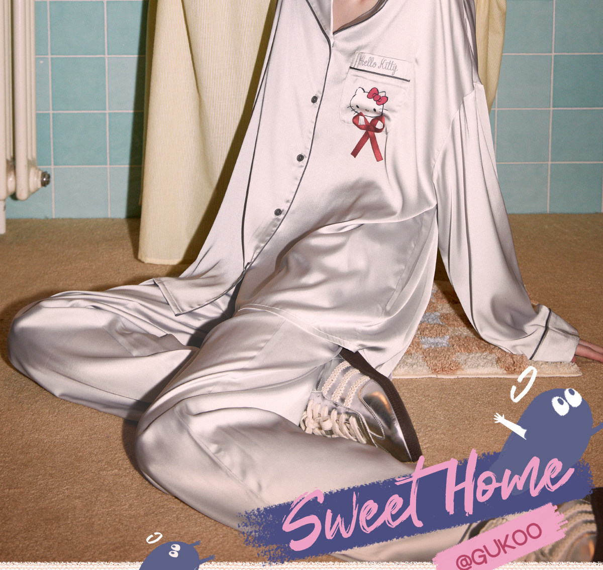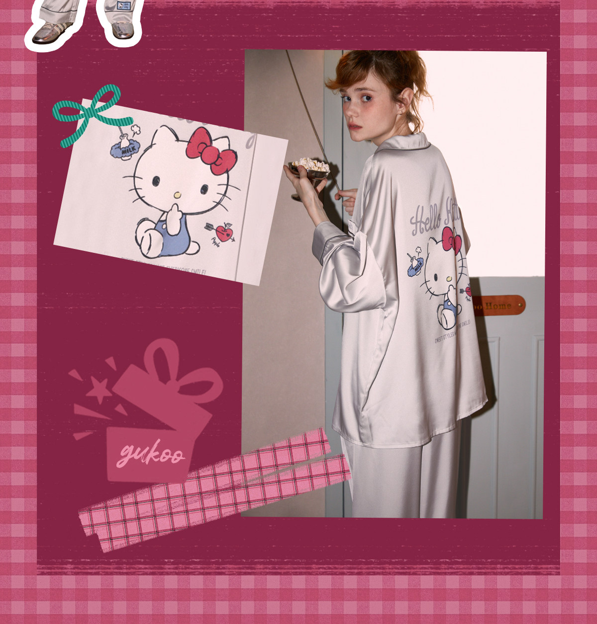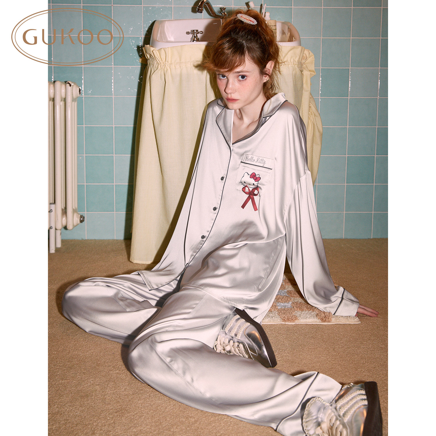 Gukoo/果壳睡衣女春秋款HelloKitty联名新款冰丝女士家居服套装C