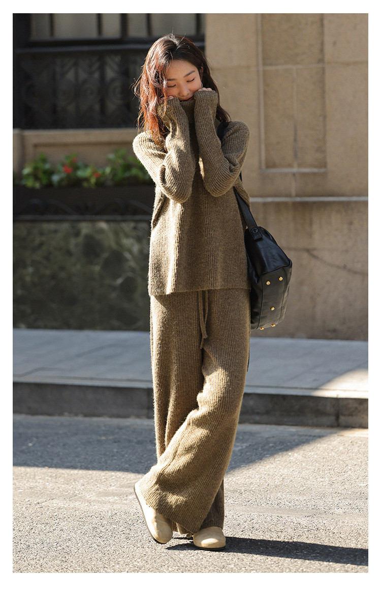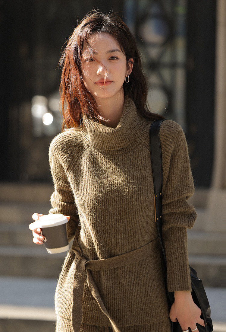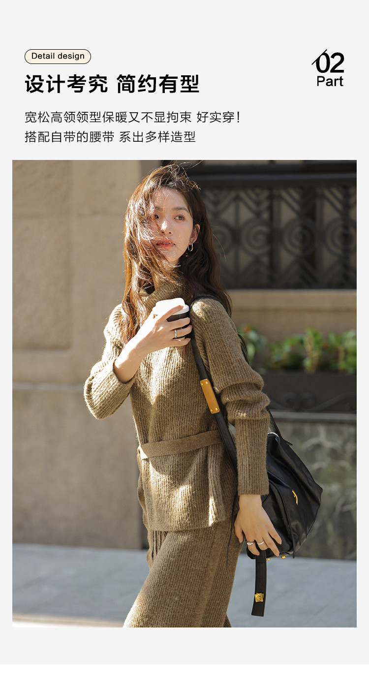 【气质针织套装】2024冬款高领腰带针织衫+腰部条纹毛织长裤