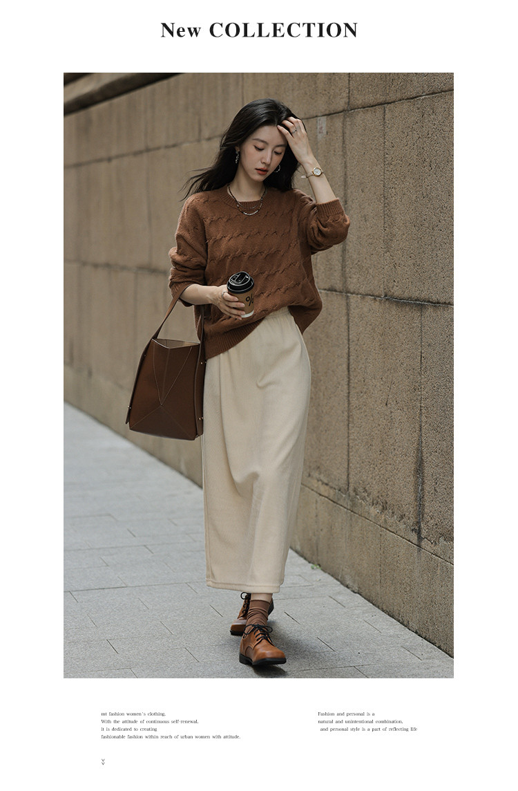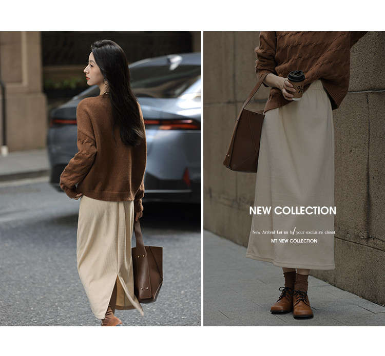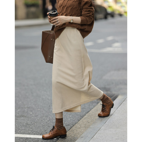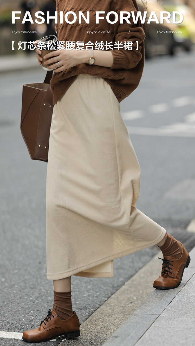 【舒适百搭】2024冬款灯芯条松紧腰复合绒长半裙