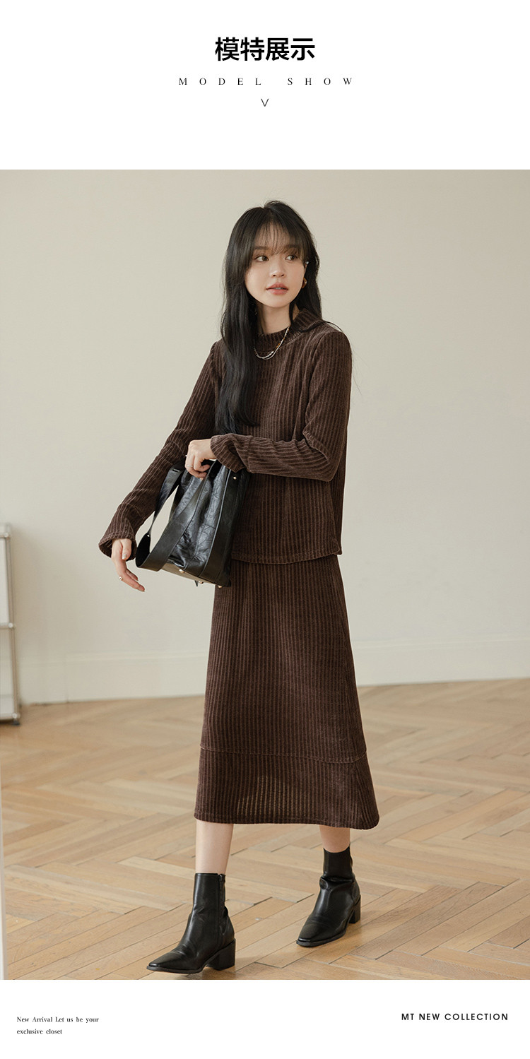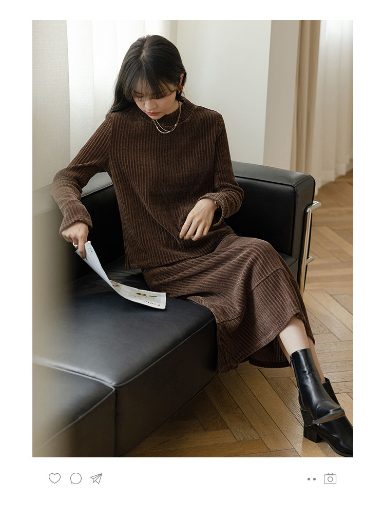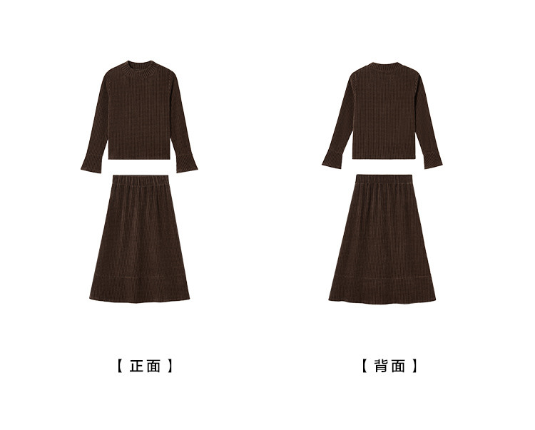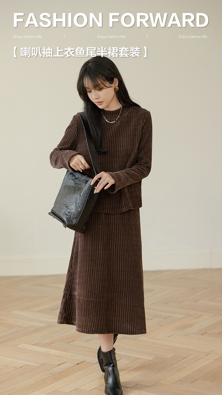 坑条雪尼尔半高领喇叭袖气质上衣松紧腰鱼尾半裙套装