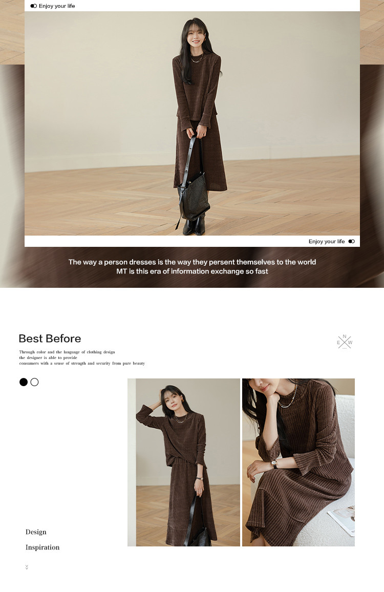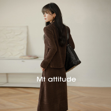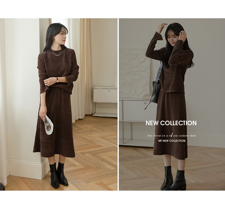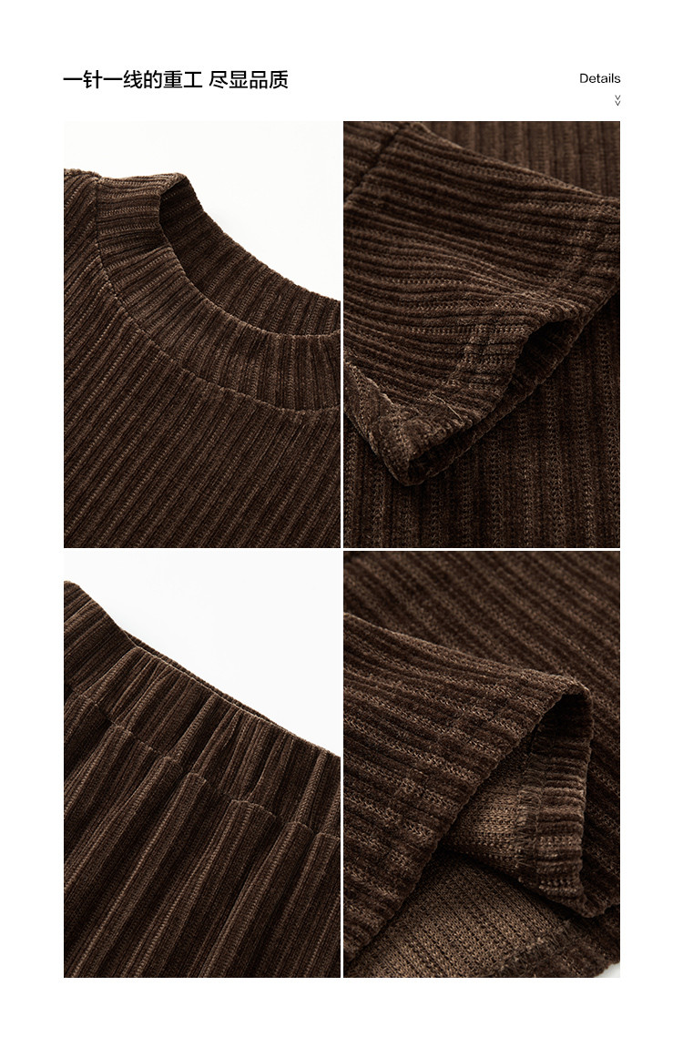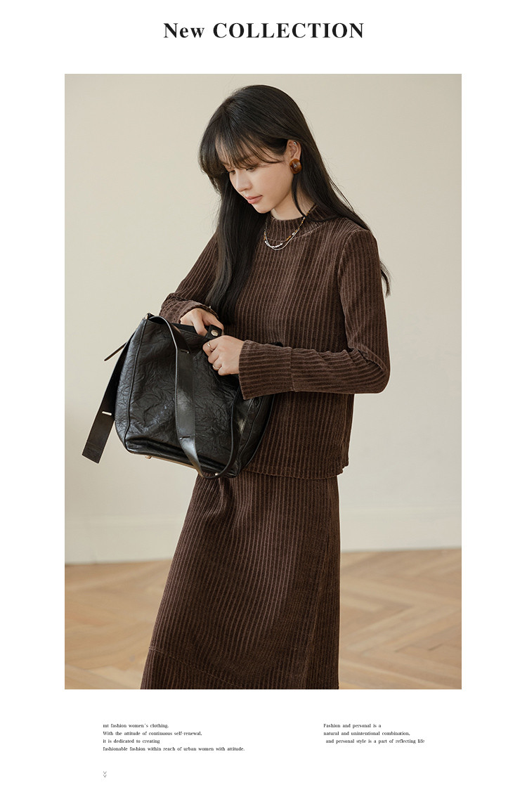 坑条雪尼尔半高领喇叭袖气质上衣松紧腰鱼尾半裙套装