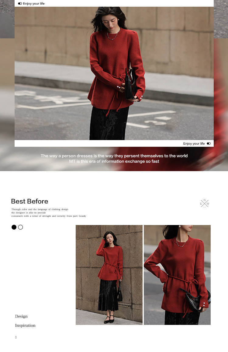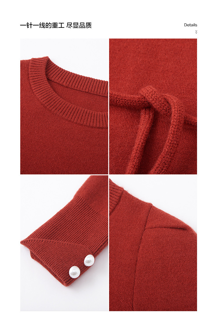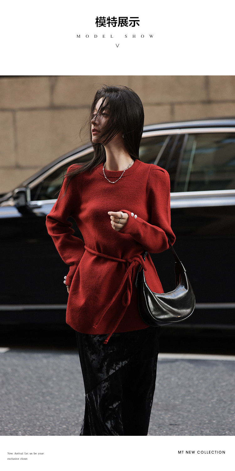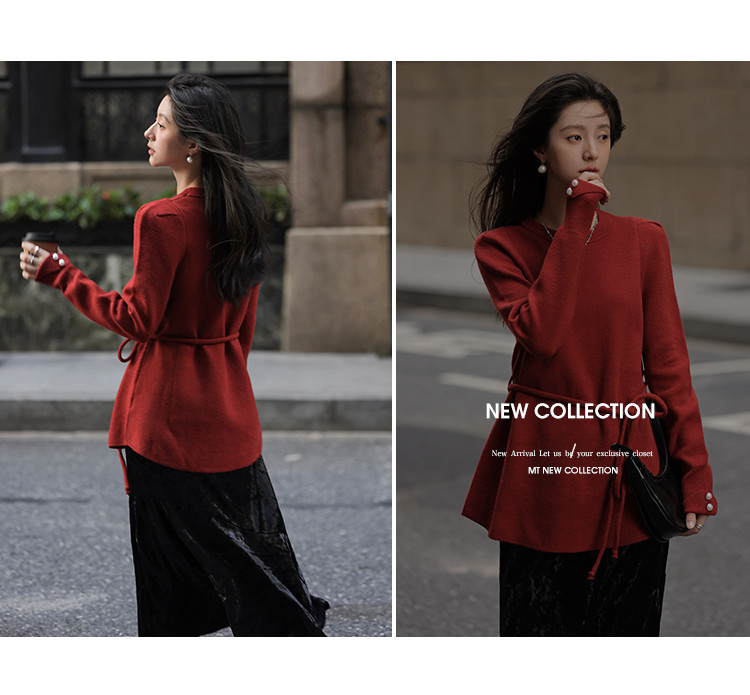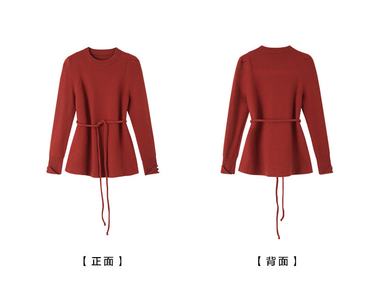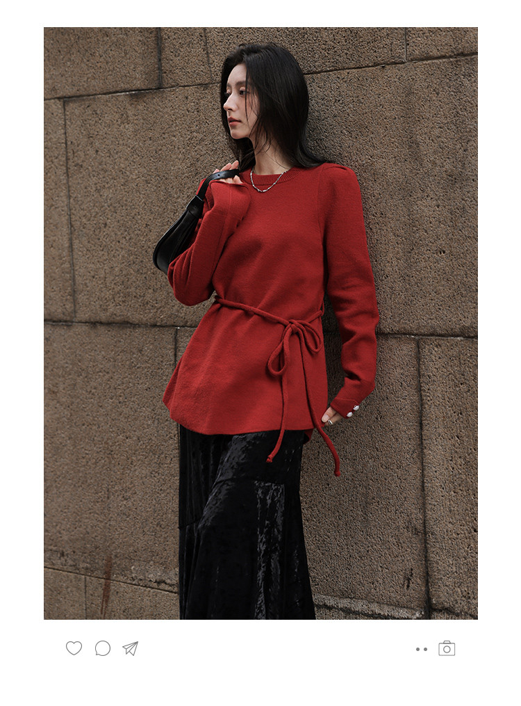 【贺岁红玫瑰】冬季复古珍珠圆领系带长袖针织衫软糯舒适女式上衣