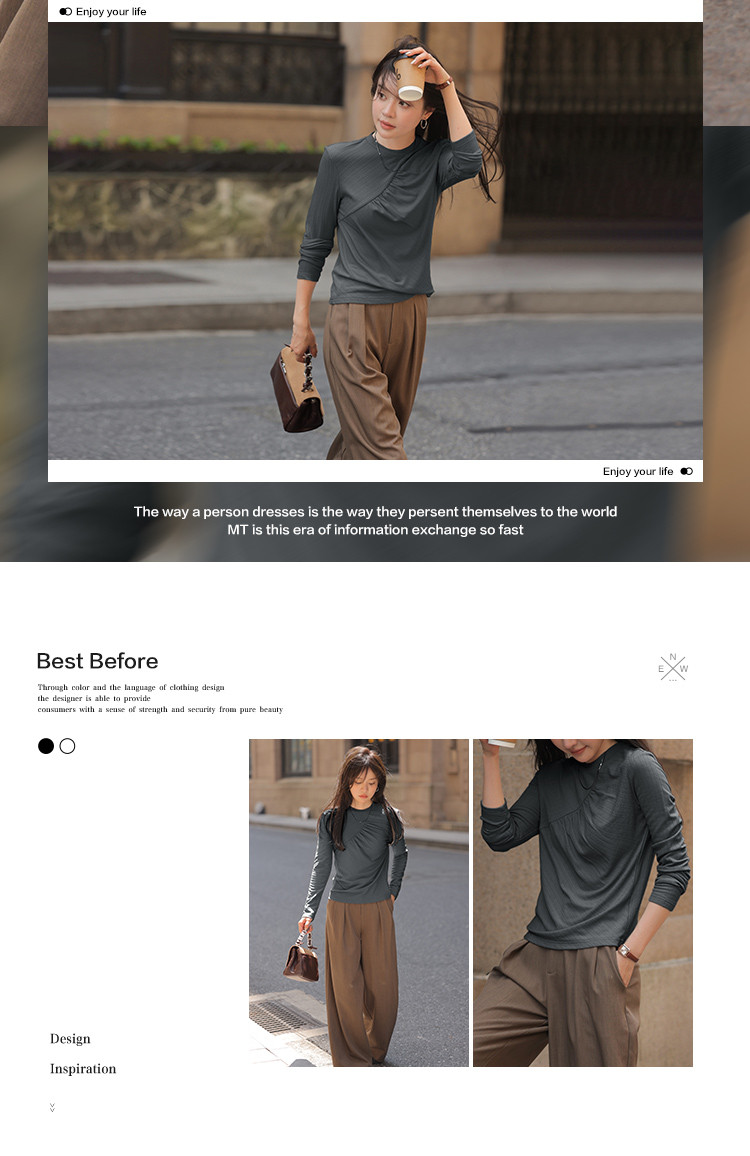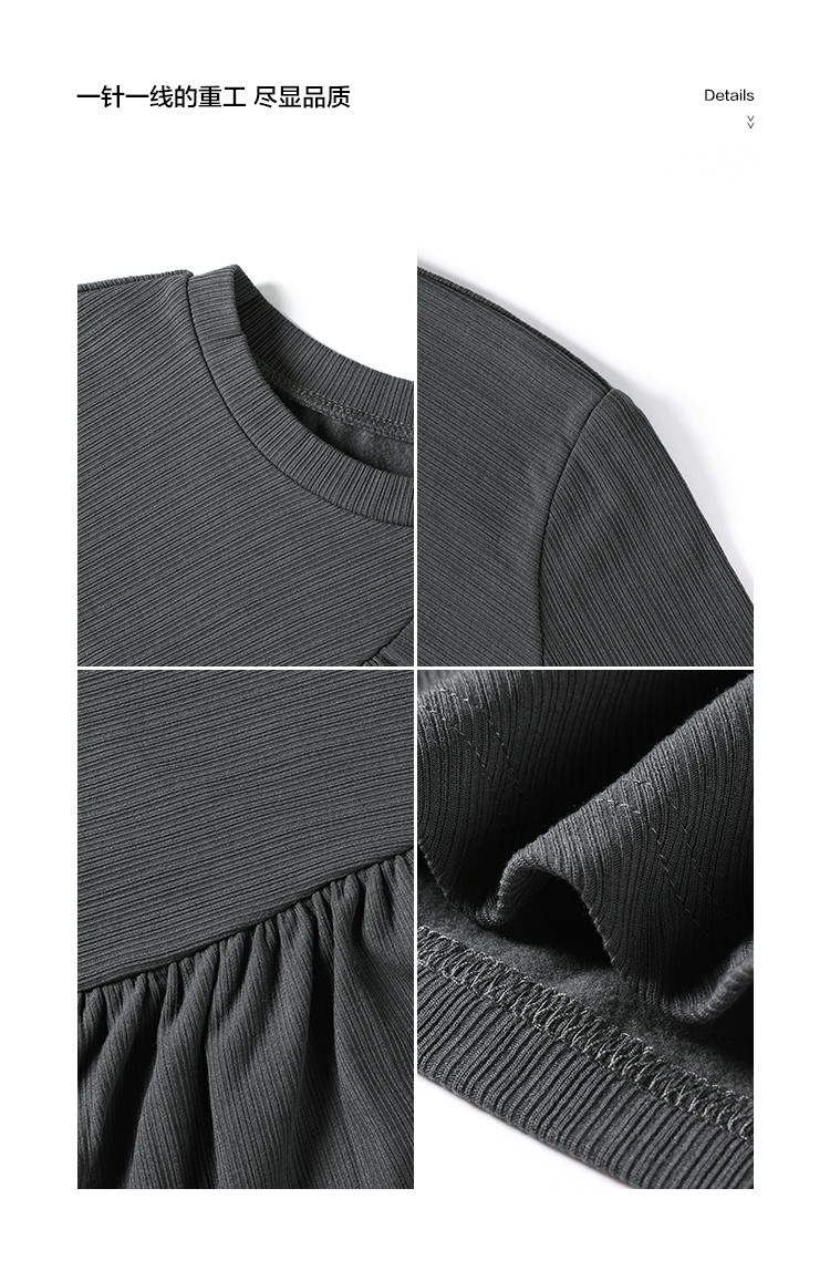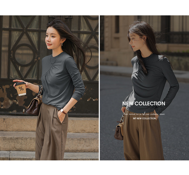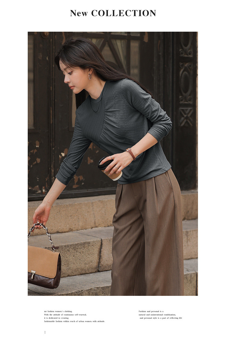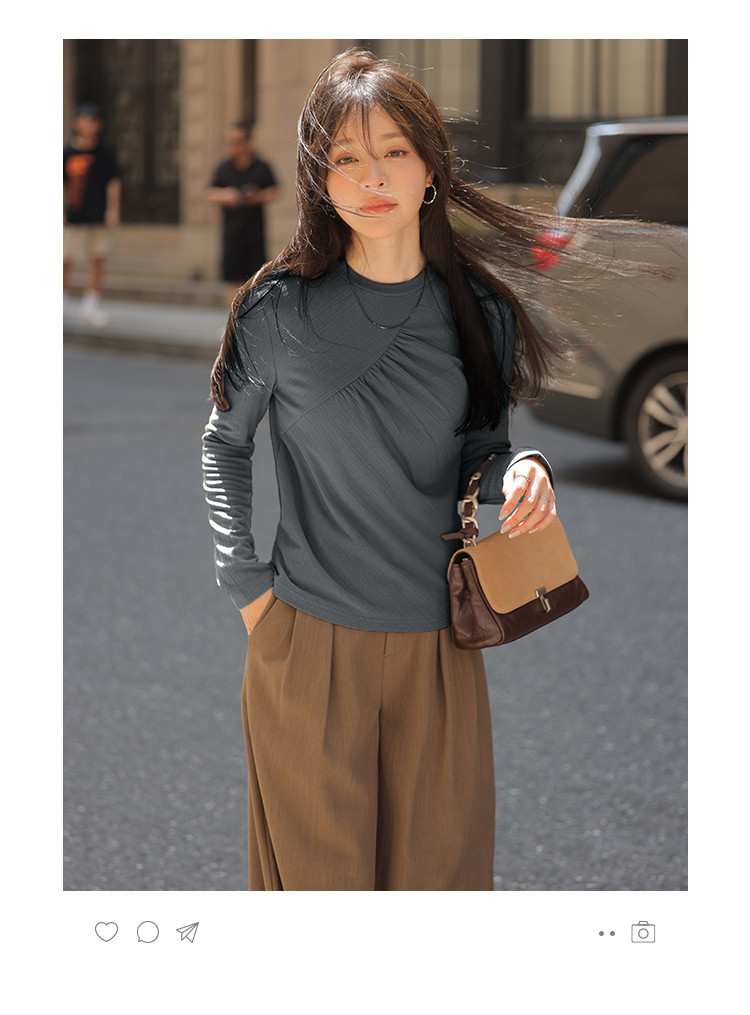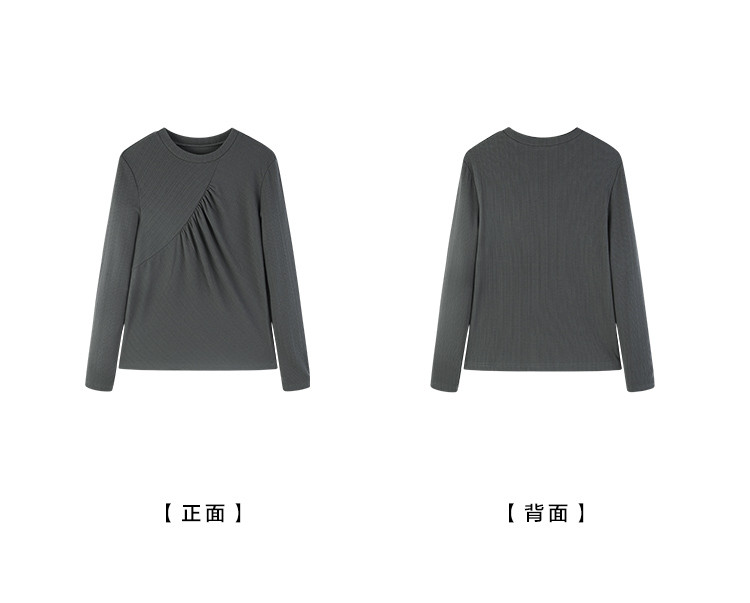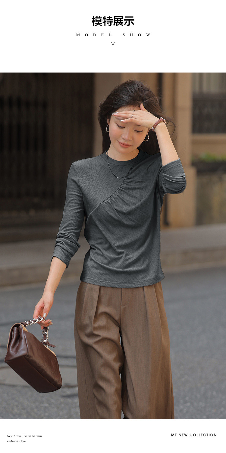 【抓毛弹力】2024年新品罗纹面料褶皱结构设计圆领长袖打底衫