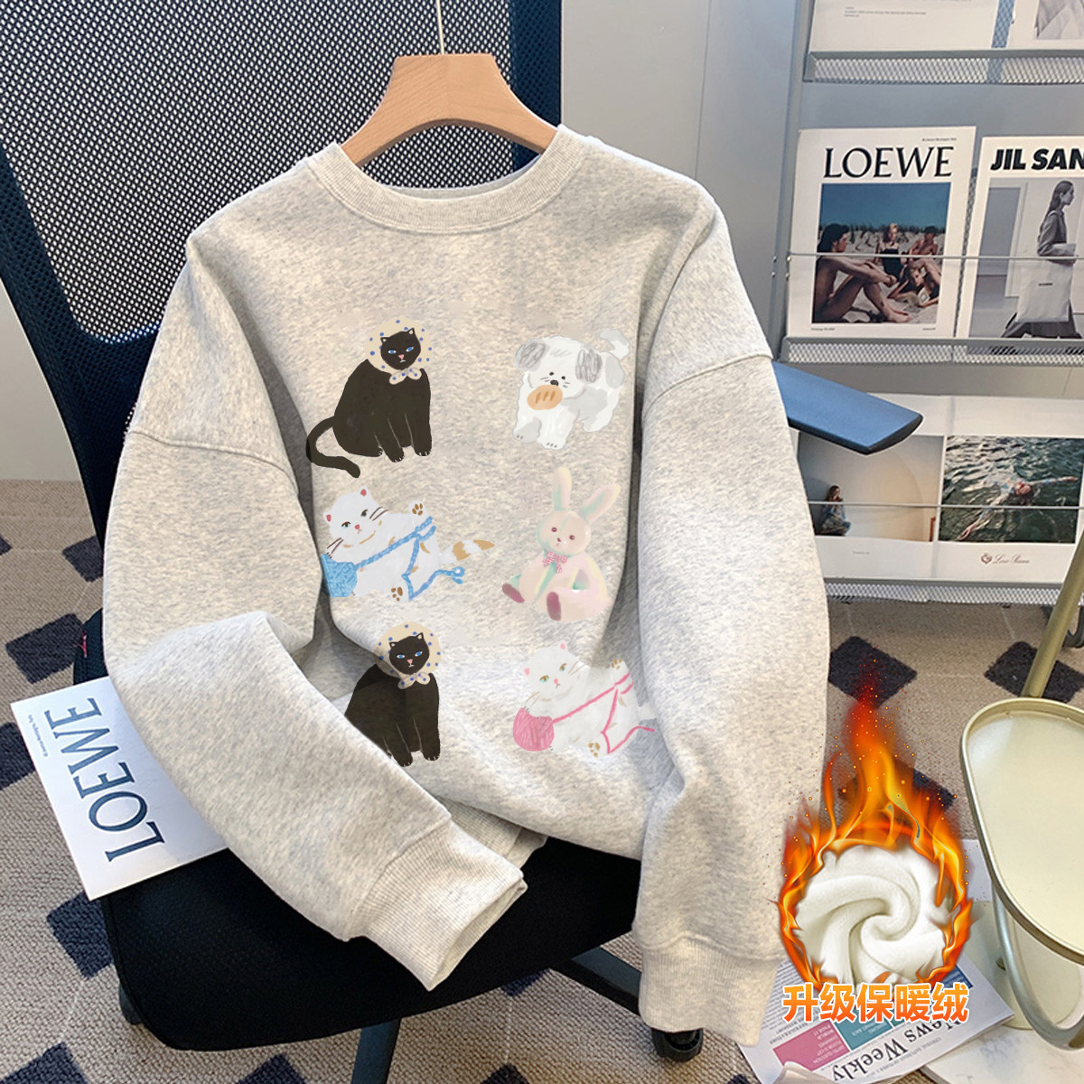 2024冬季女圆领前胸图案加绒卫衣美式复古慵懒风百搭韩版休闲