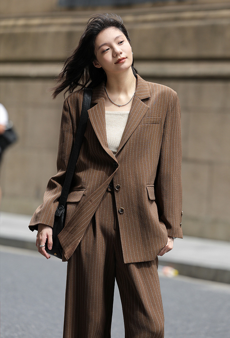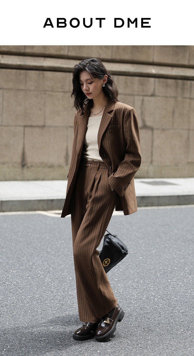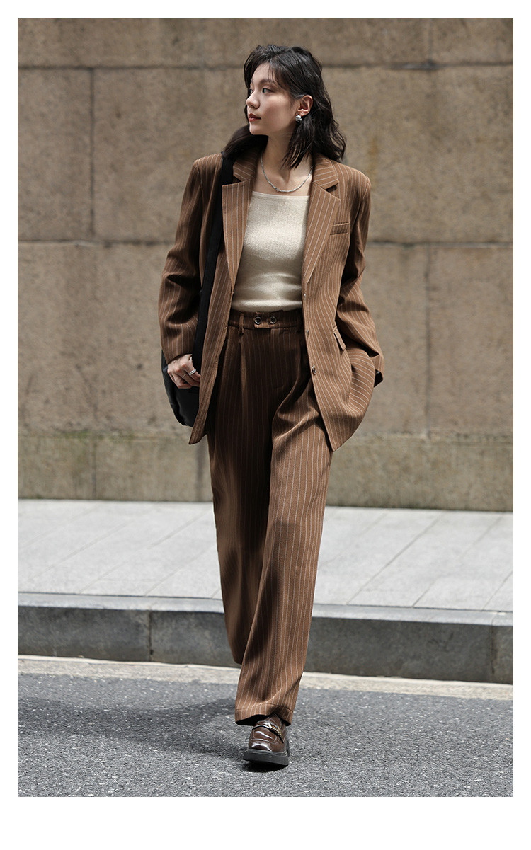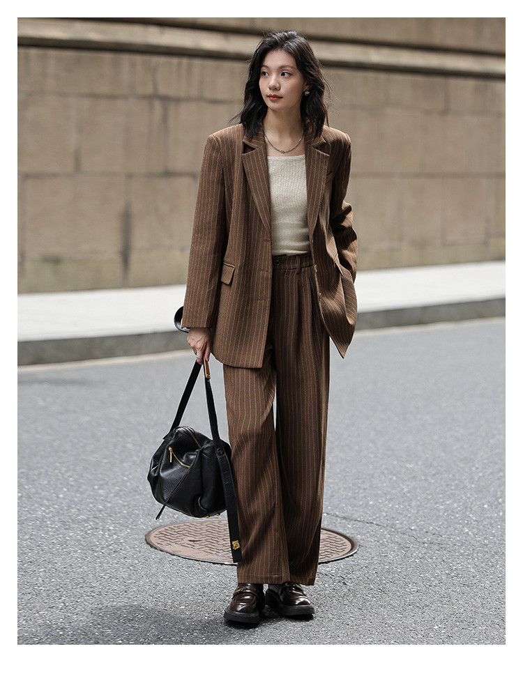 【棕色西装两件套】2024秋复古风经典条纹西装上衣+休闲裤女