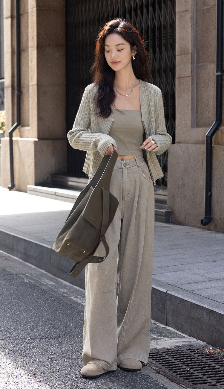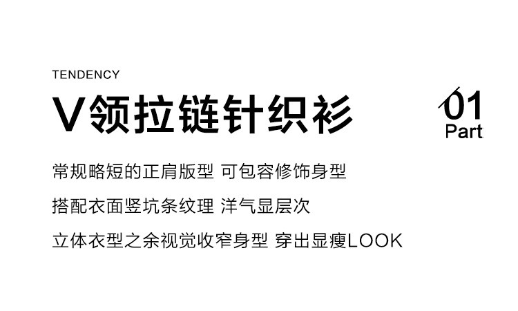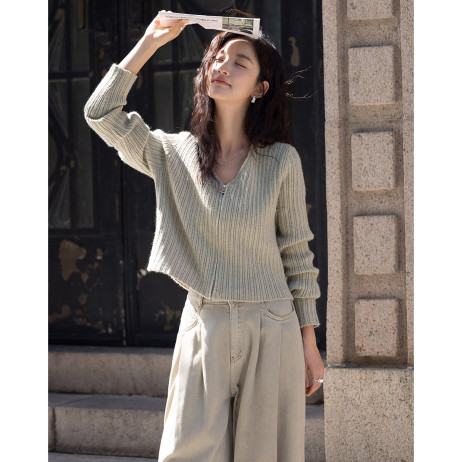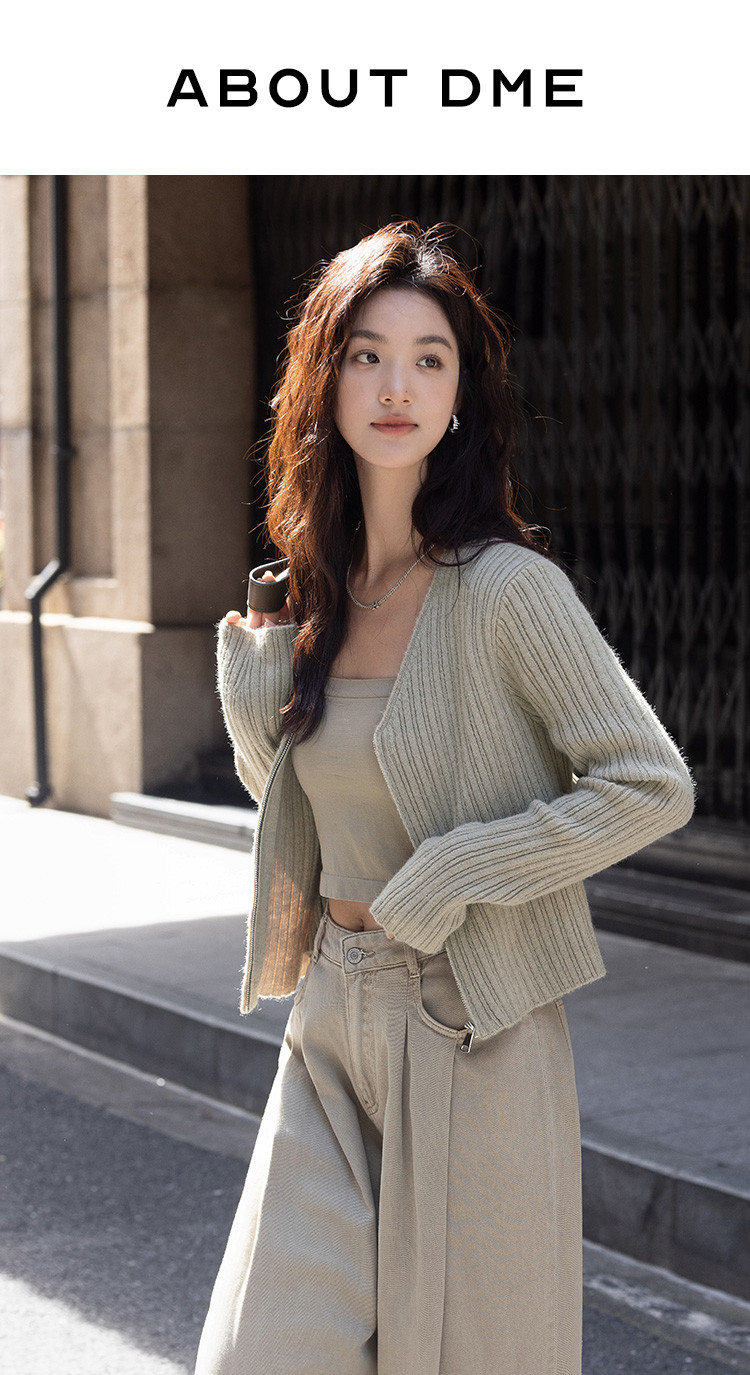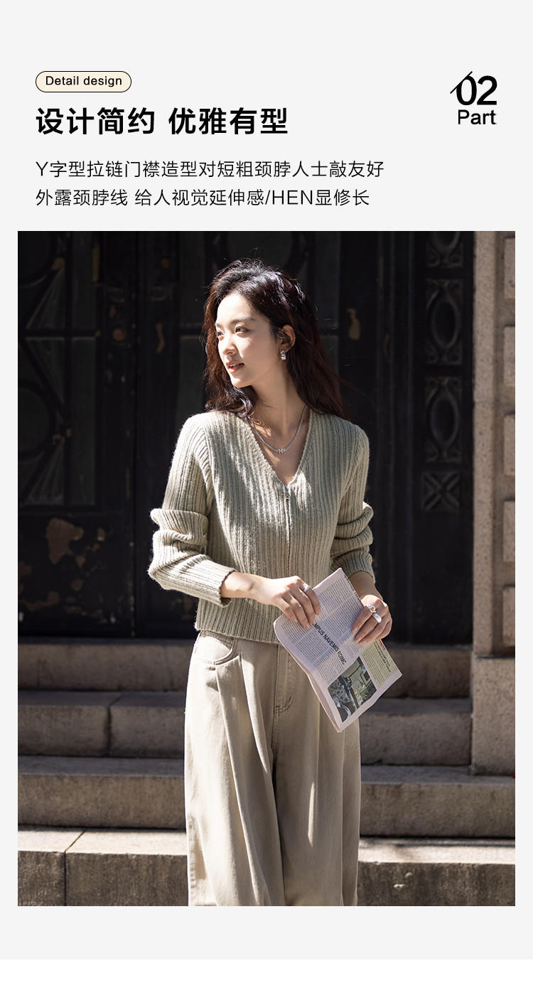 【卡其色休闲针织衫】2024冬V领开门襟拉链设计长袖针织衫女