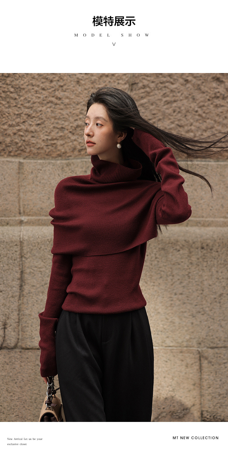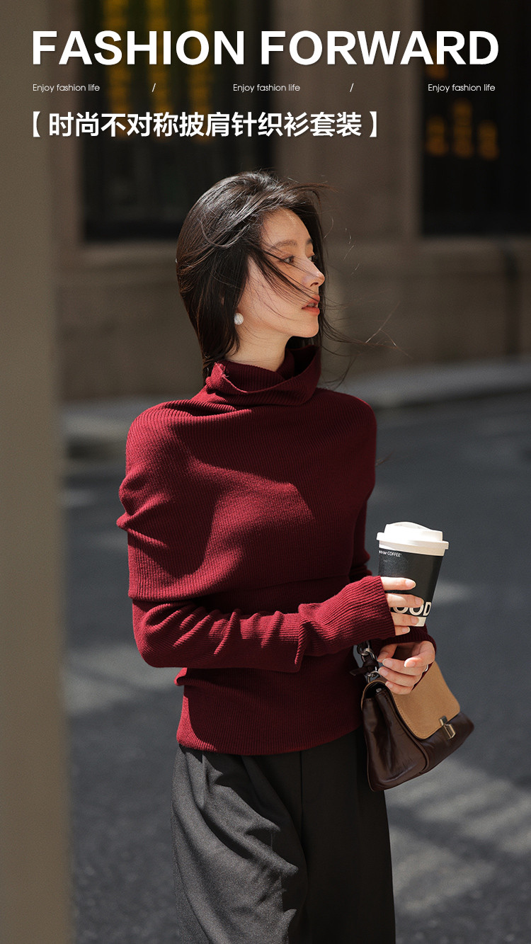 【韩范优雅】秋季时尚不对称袖口设计披肩高领罩衫两件套针织衫