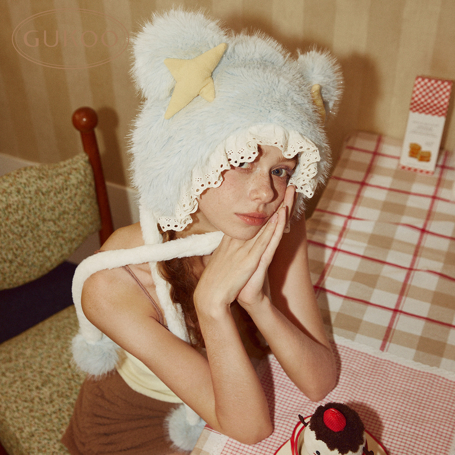 Gukoo/果壳帽子女冬季毛绒耳朵新款可爱毛绒保暖女士护耳棉帽
