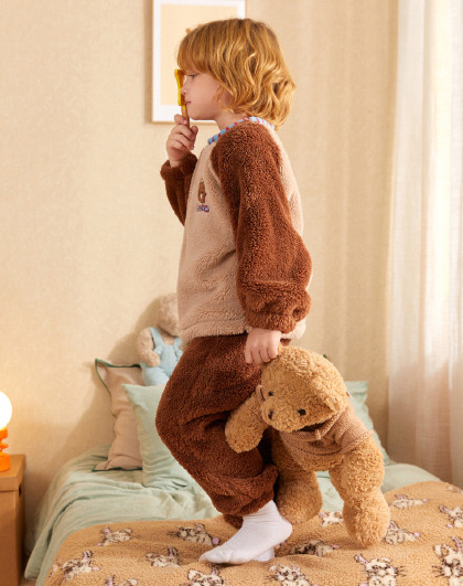 【童趣小熊系列】男童睡衣秋冬加厚北极绒绣花家居服套装可外穿