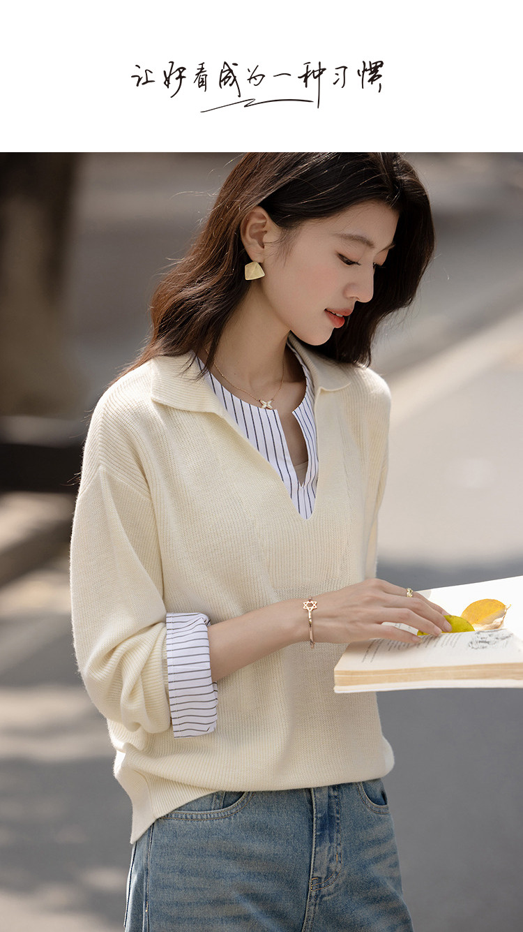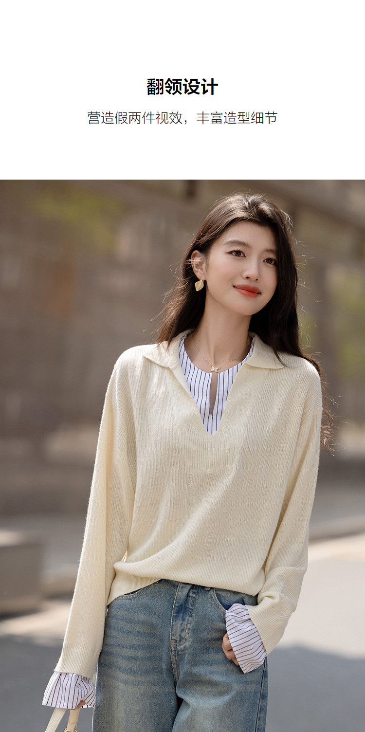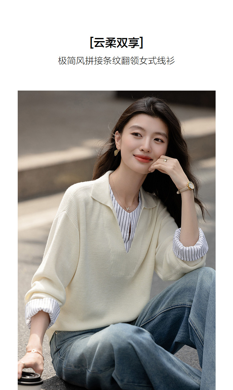 【绵羊毛桑蚕丝混纺】2026春极简风拼接条纹翻领线衫气质女式针织衫