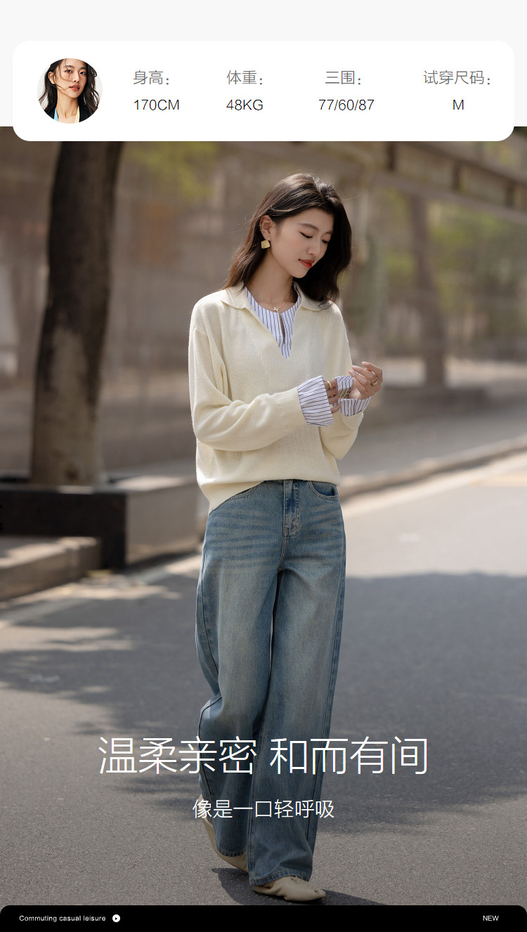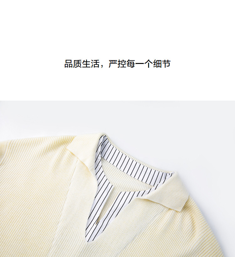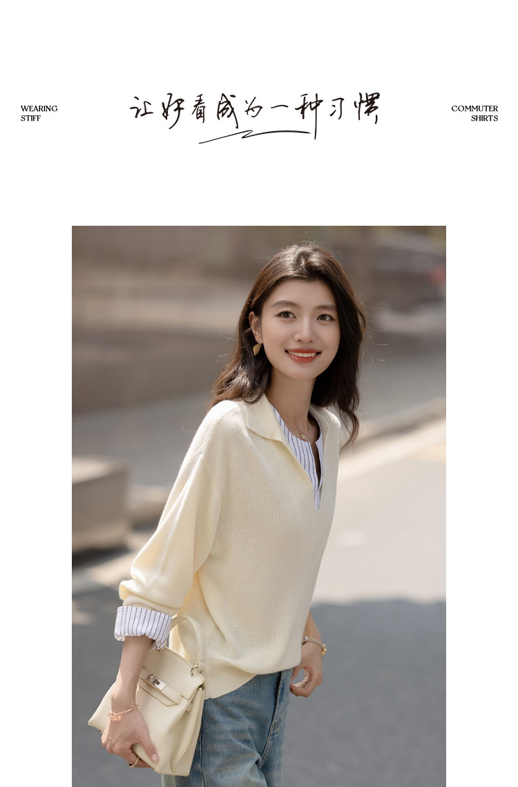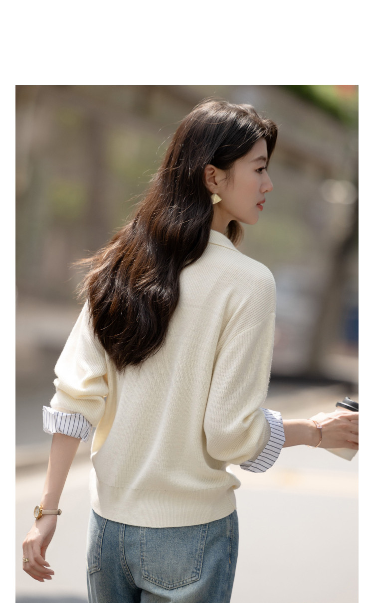 【绵羊毛桑蚕丝混纺】2026春极简风拼接条纹翻领线衫气质女式针织衫