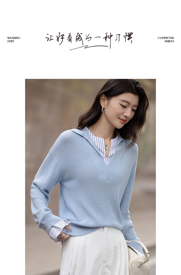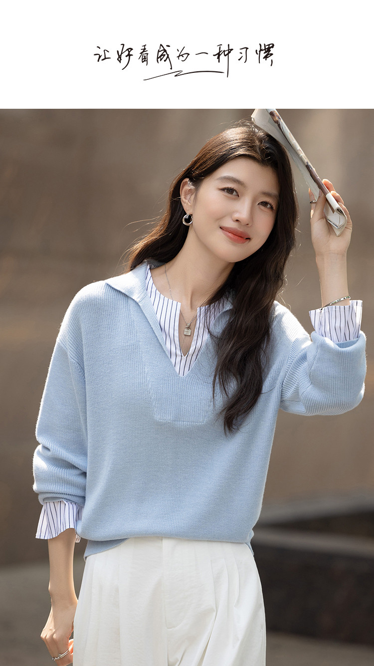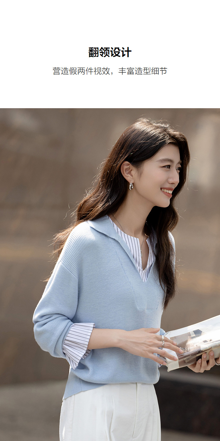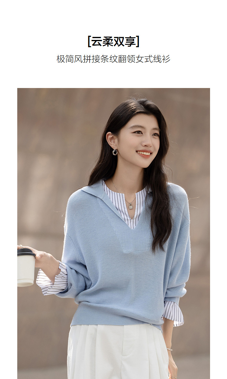 【绵羊毛桑蚕丝混纺】2026春极简风拼接条纹翻领线衫气质女式针织衫