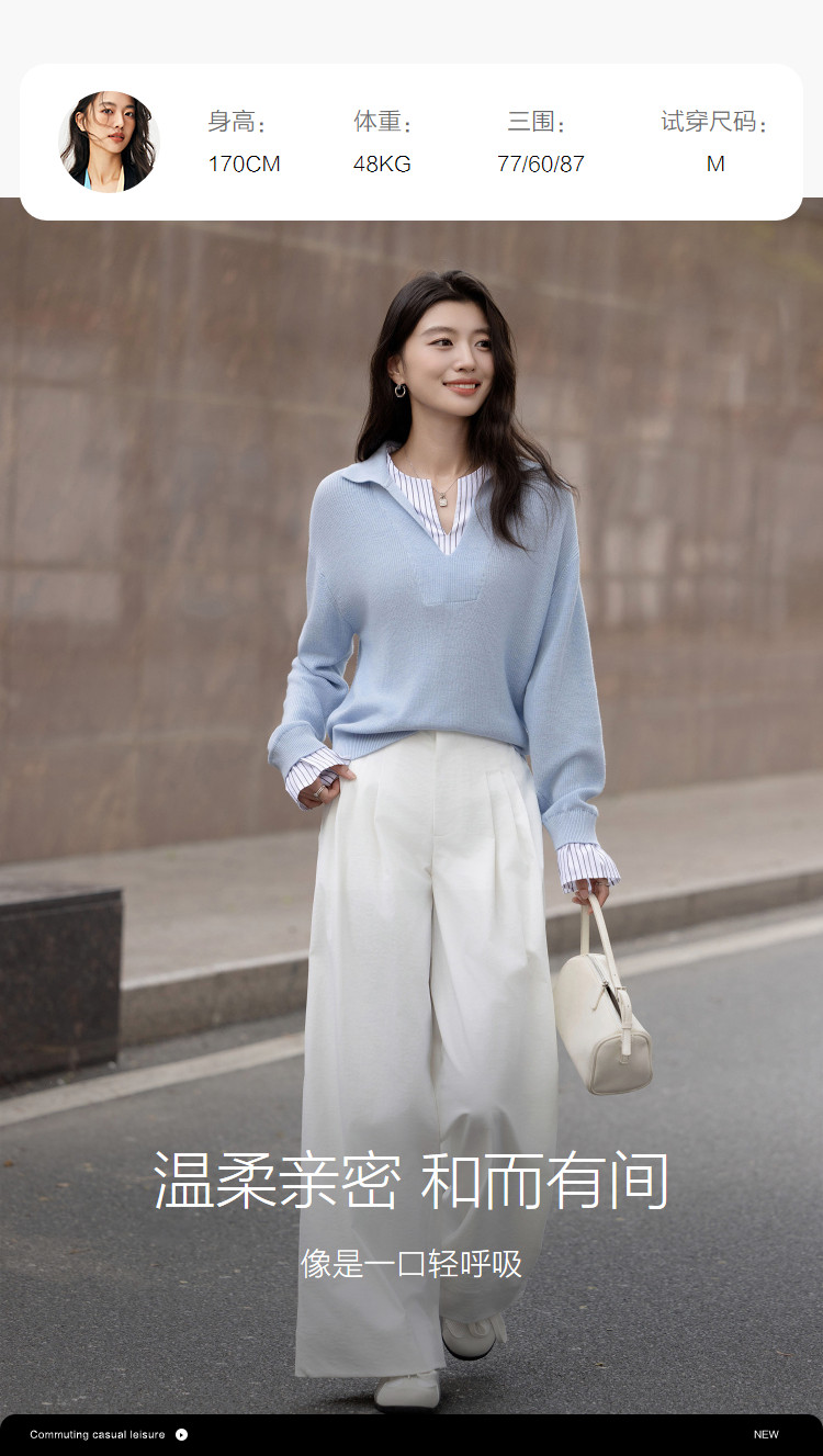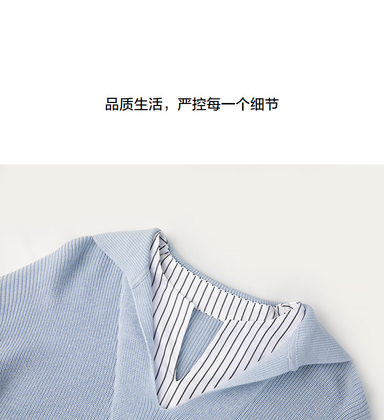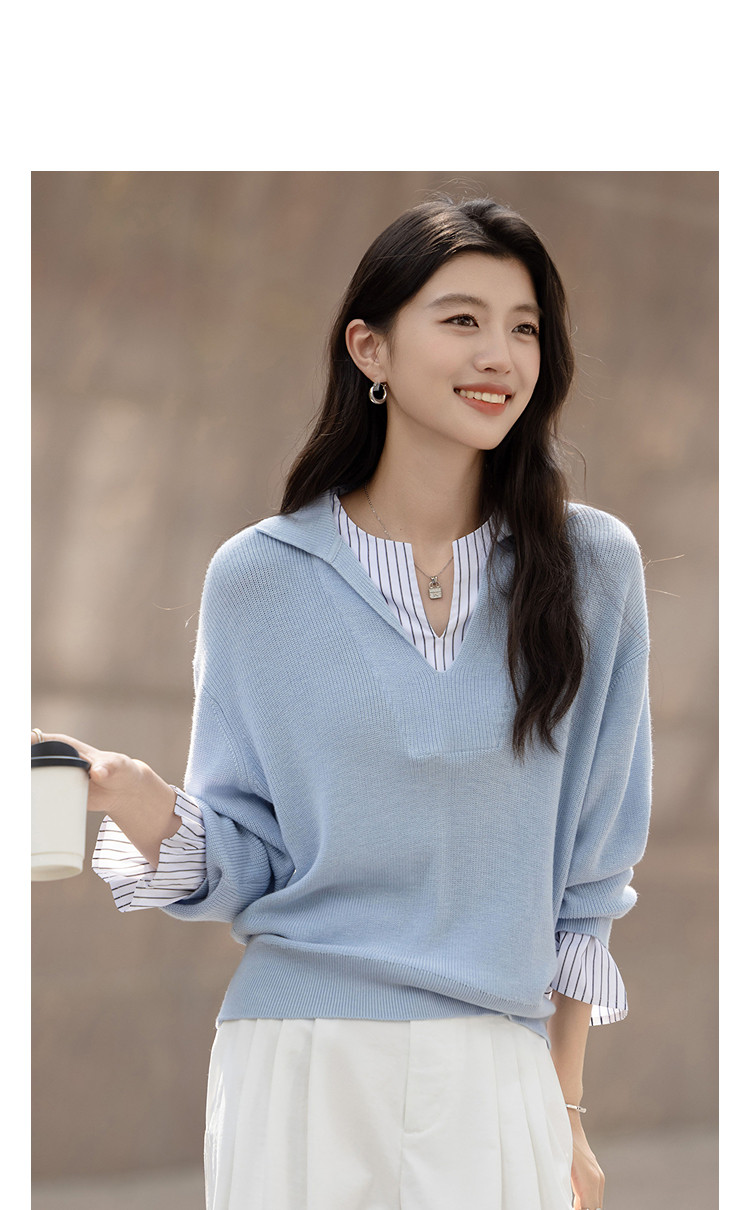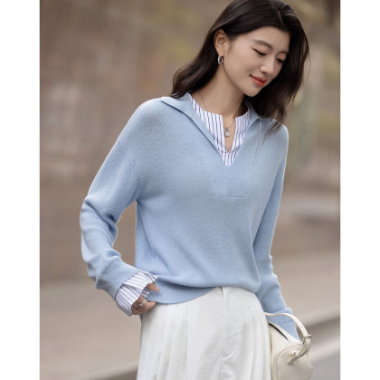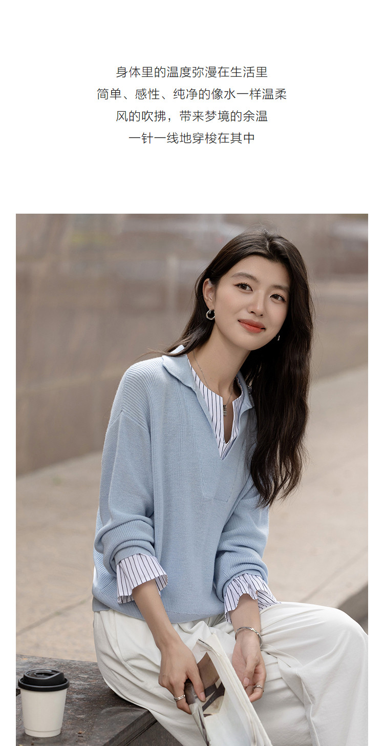 【绵羊毛桑蚕丝混纺】2026春极简风拼接条纹翻领线衫气质女式针织衫