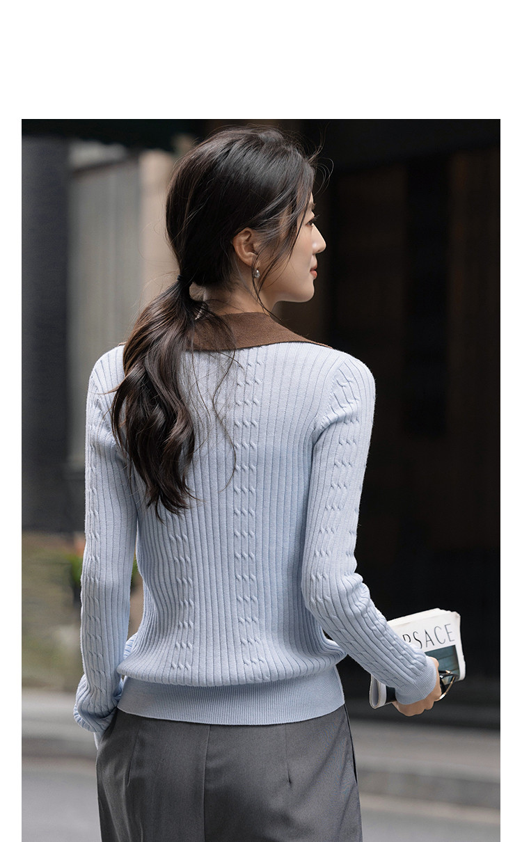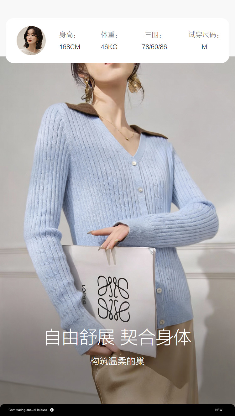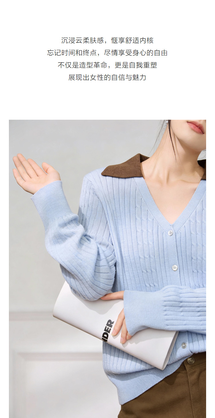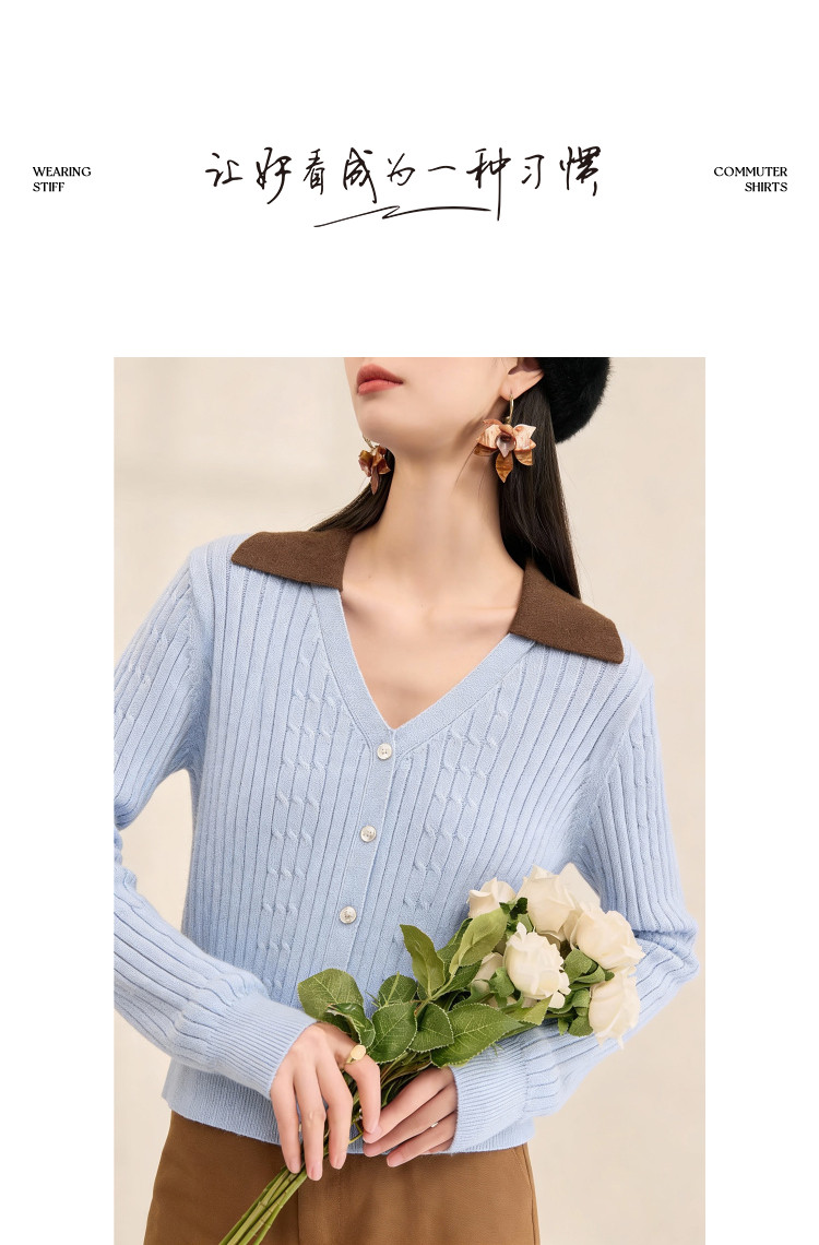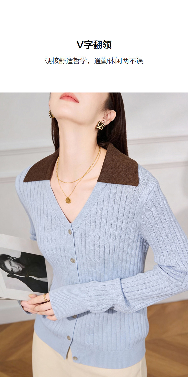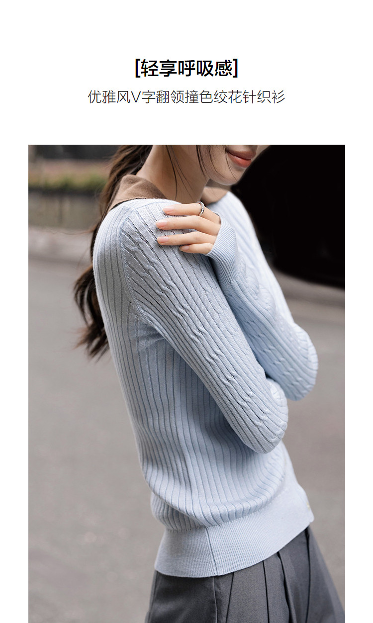 【含蓬松莱赛尔】2026春优雅风V字翻领撞色线衫绞花柔弹女式针织衫