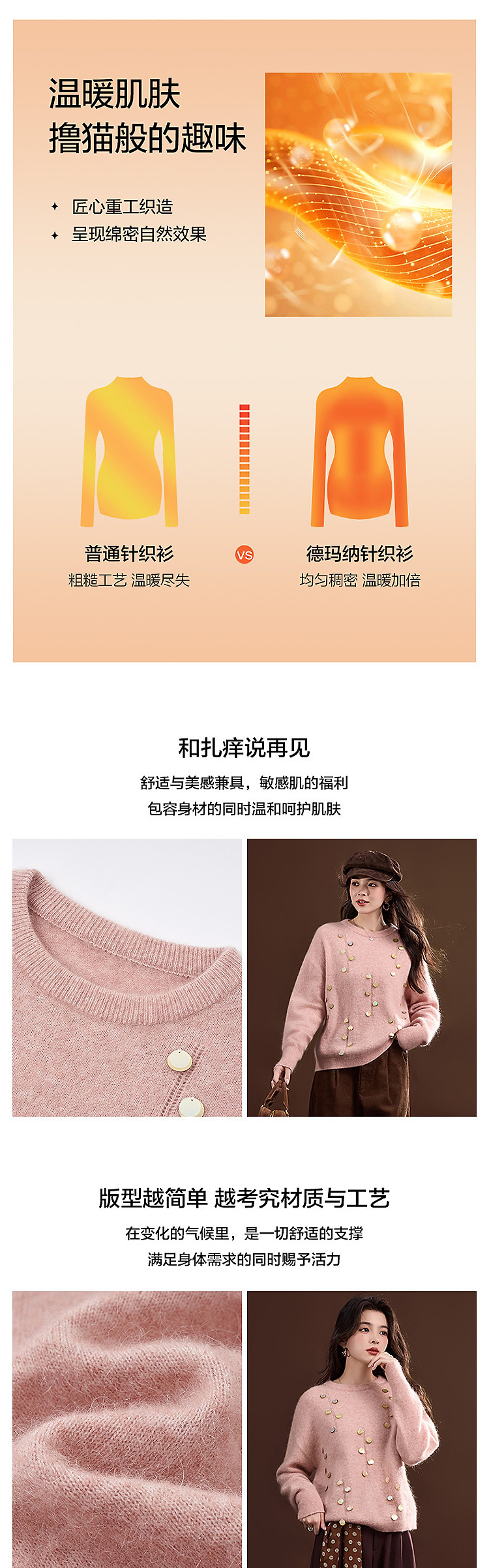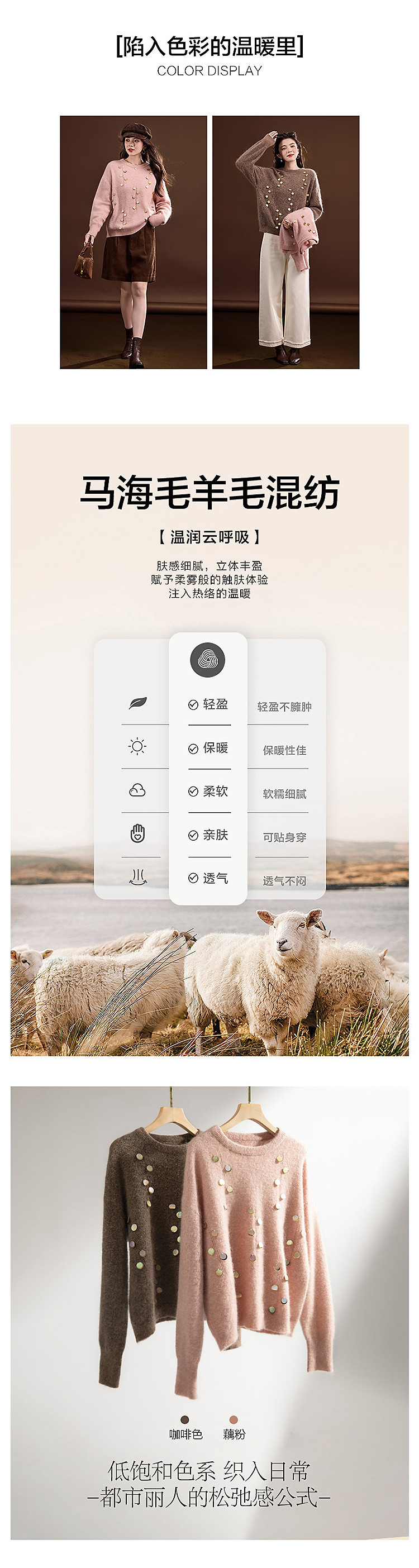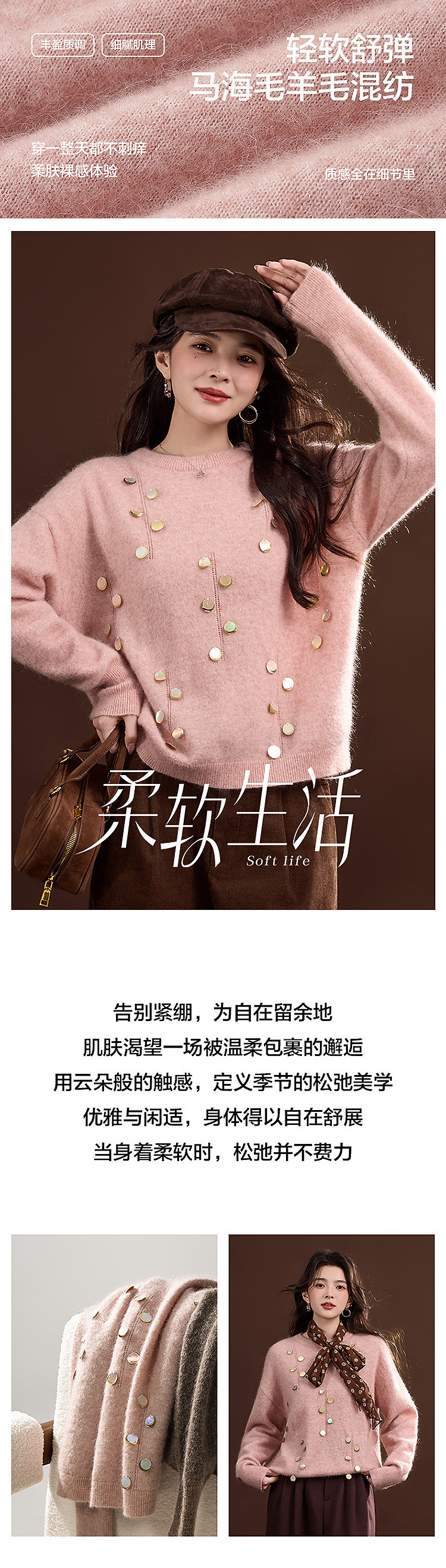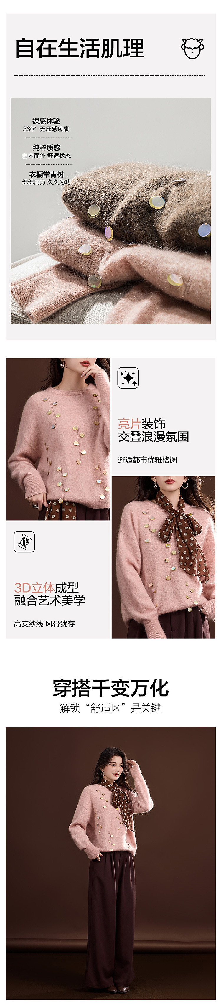 【马海毛绵羊毛混纺】冬季优雅亮片线衫宽松柔弹藏肉针织衫女上衣