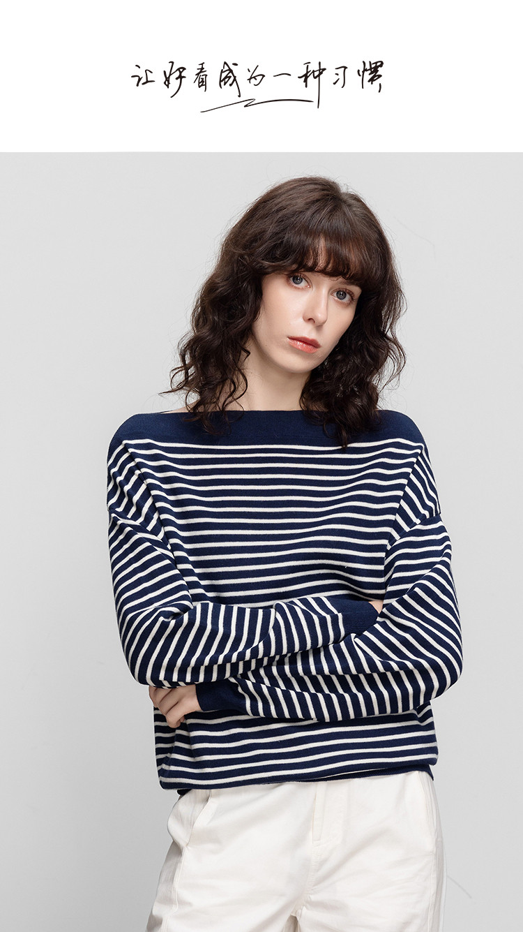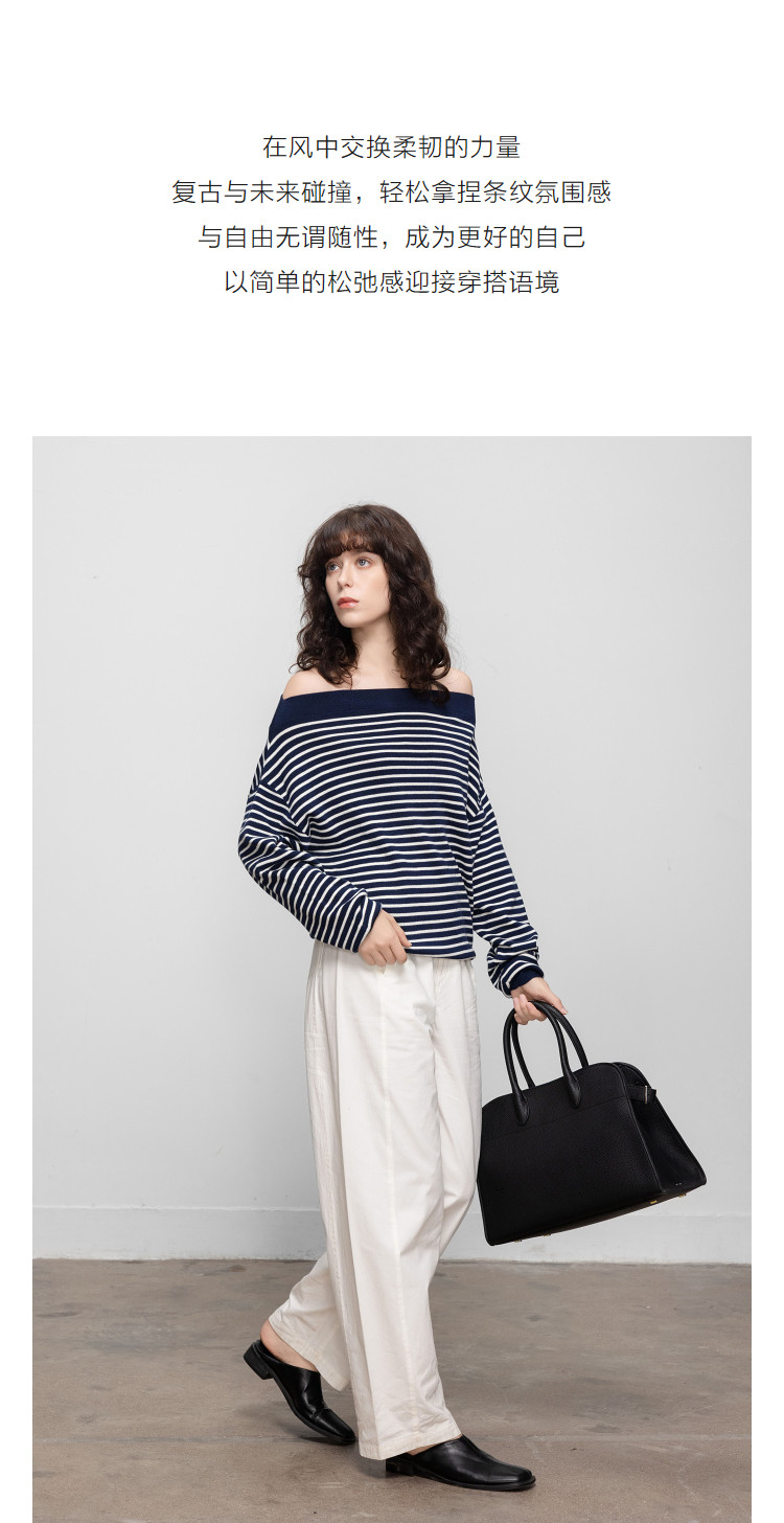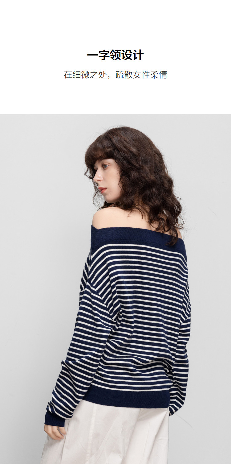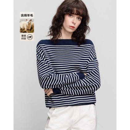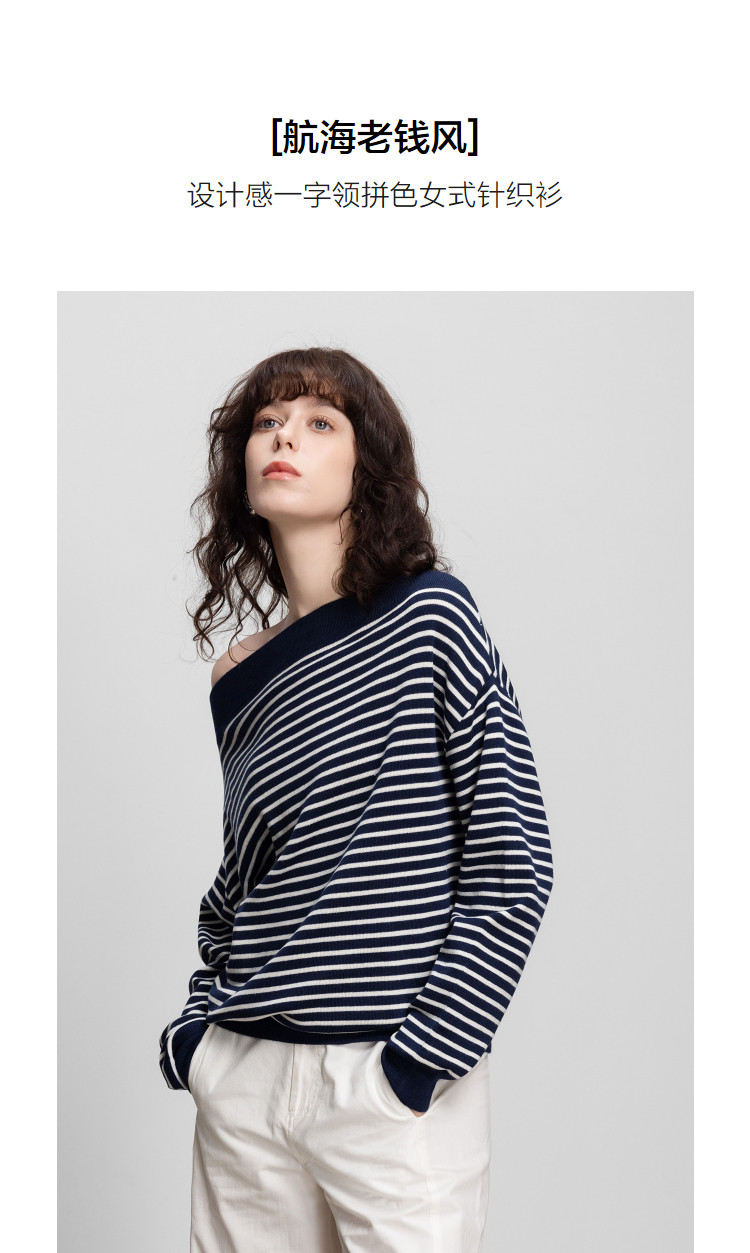 【含绵羊毛】2026春航海老钱风一字领拼色线衫条纹软弹针织衫女上衣
