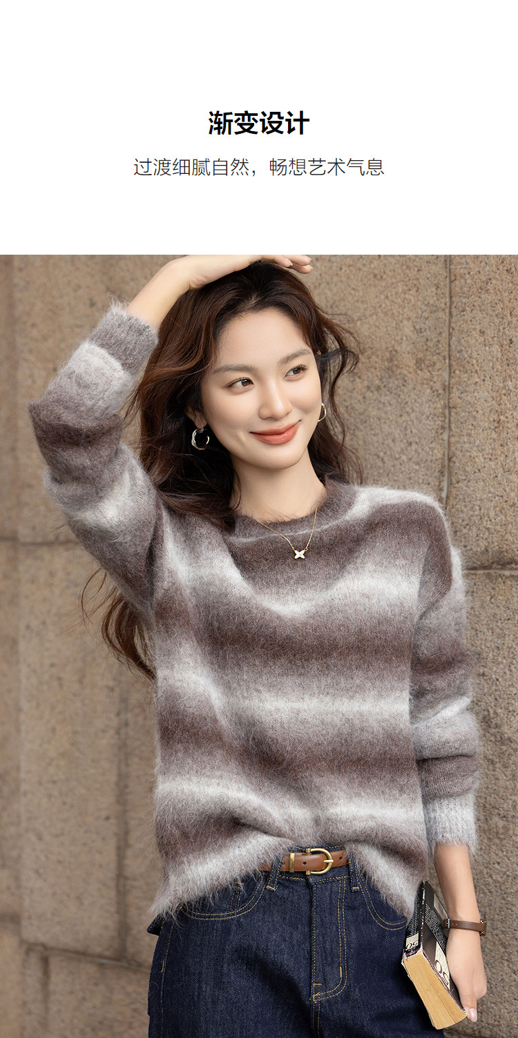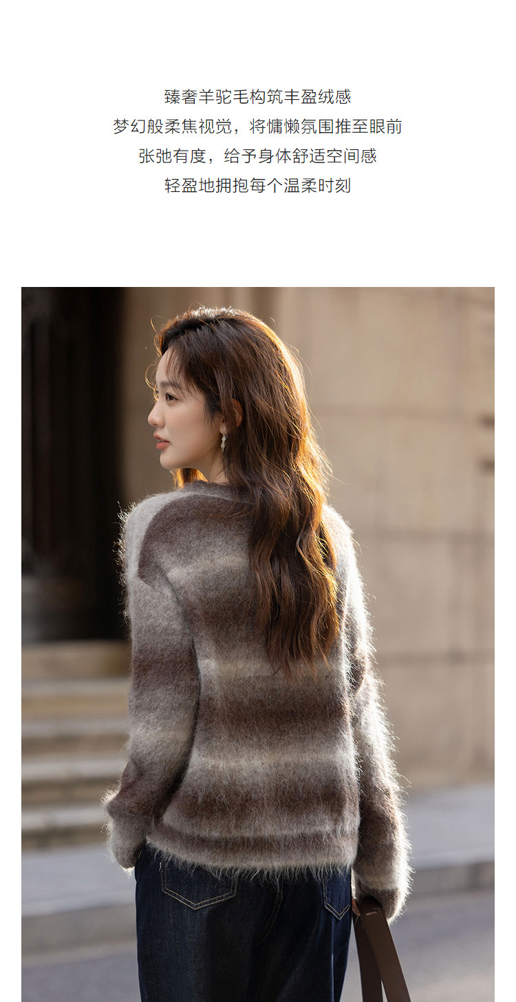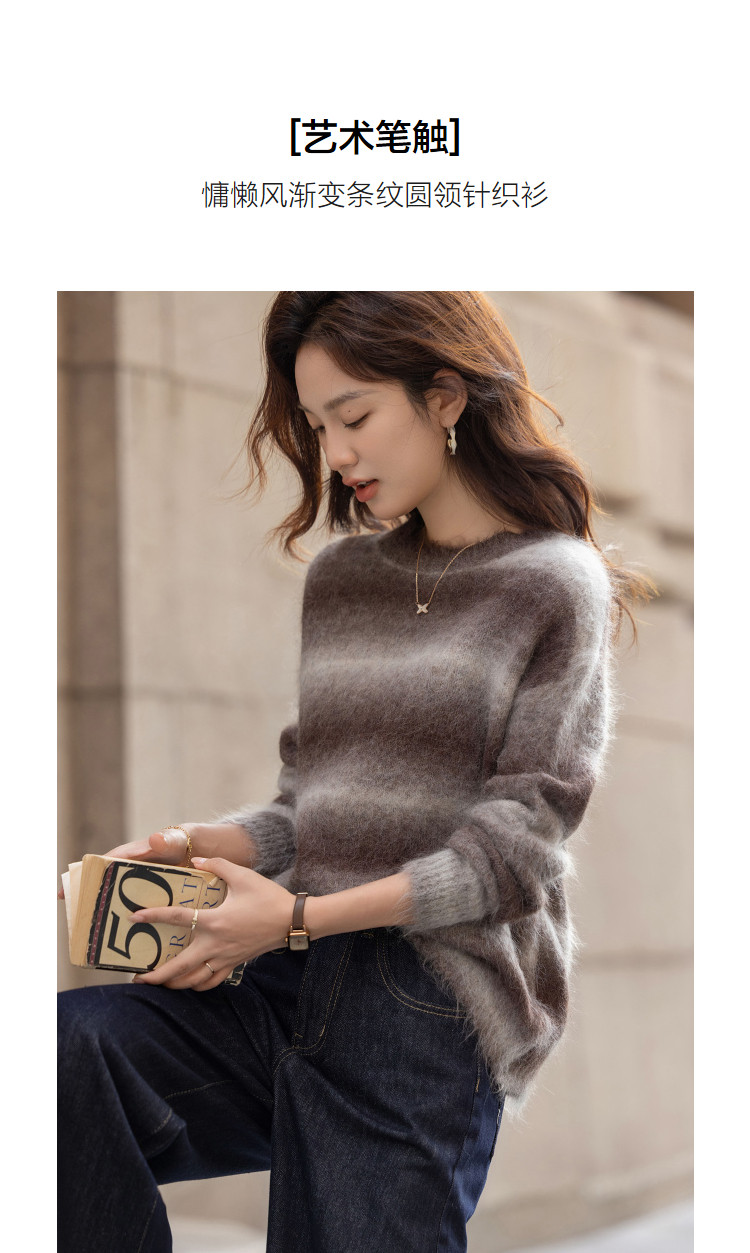 【臻奢羊驼毛混纺】冬季渐变式条纹圆领线衫蓬松柔软针织衫女上衣