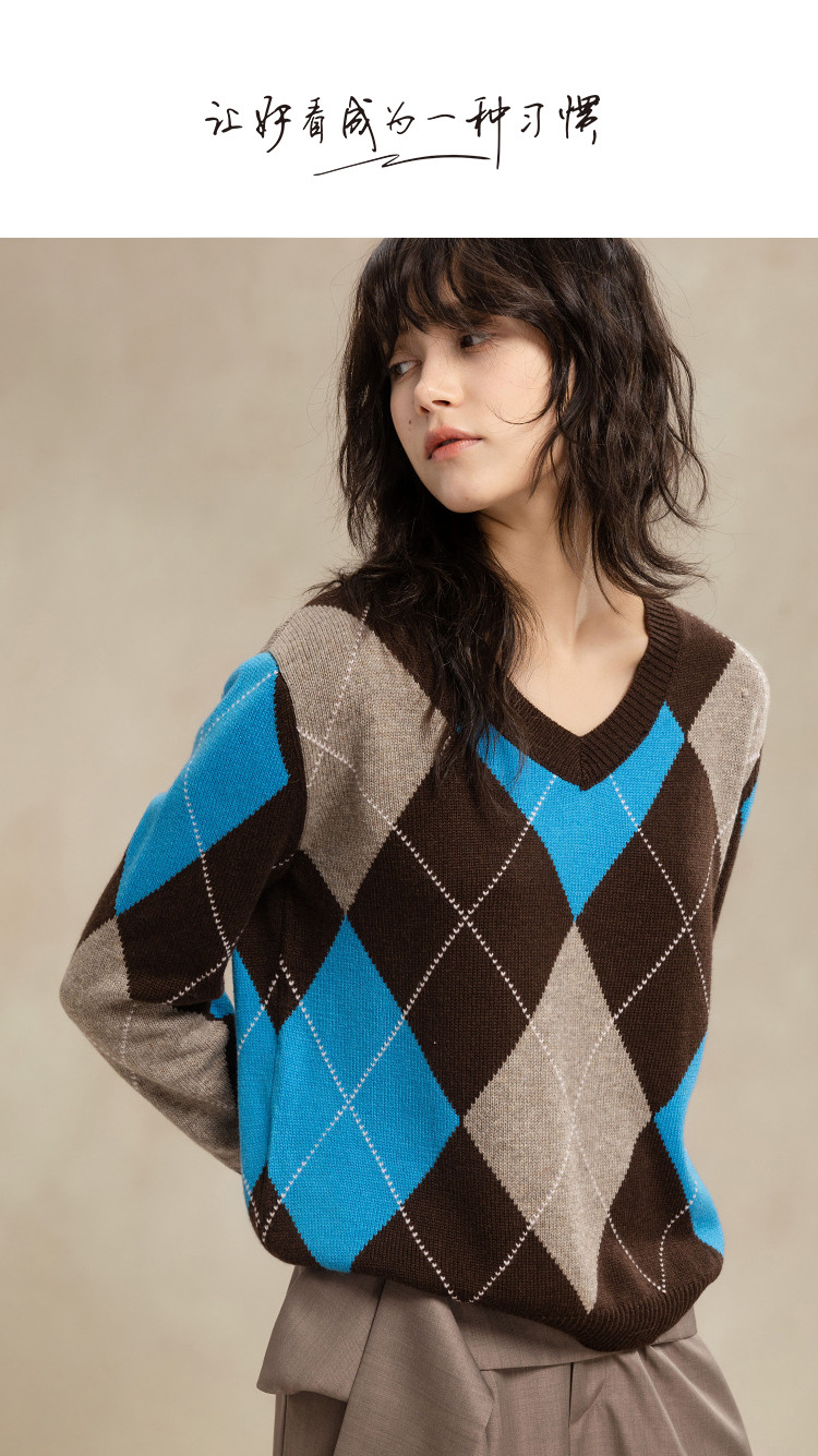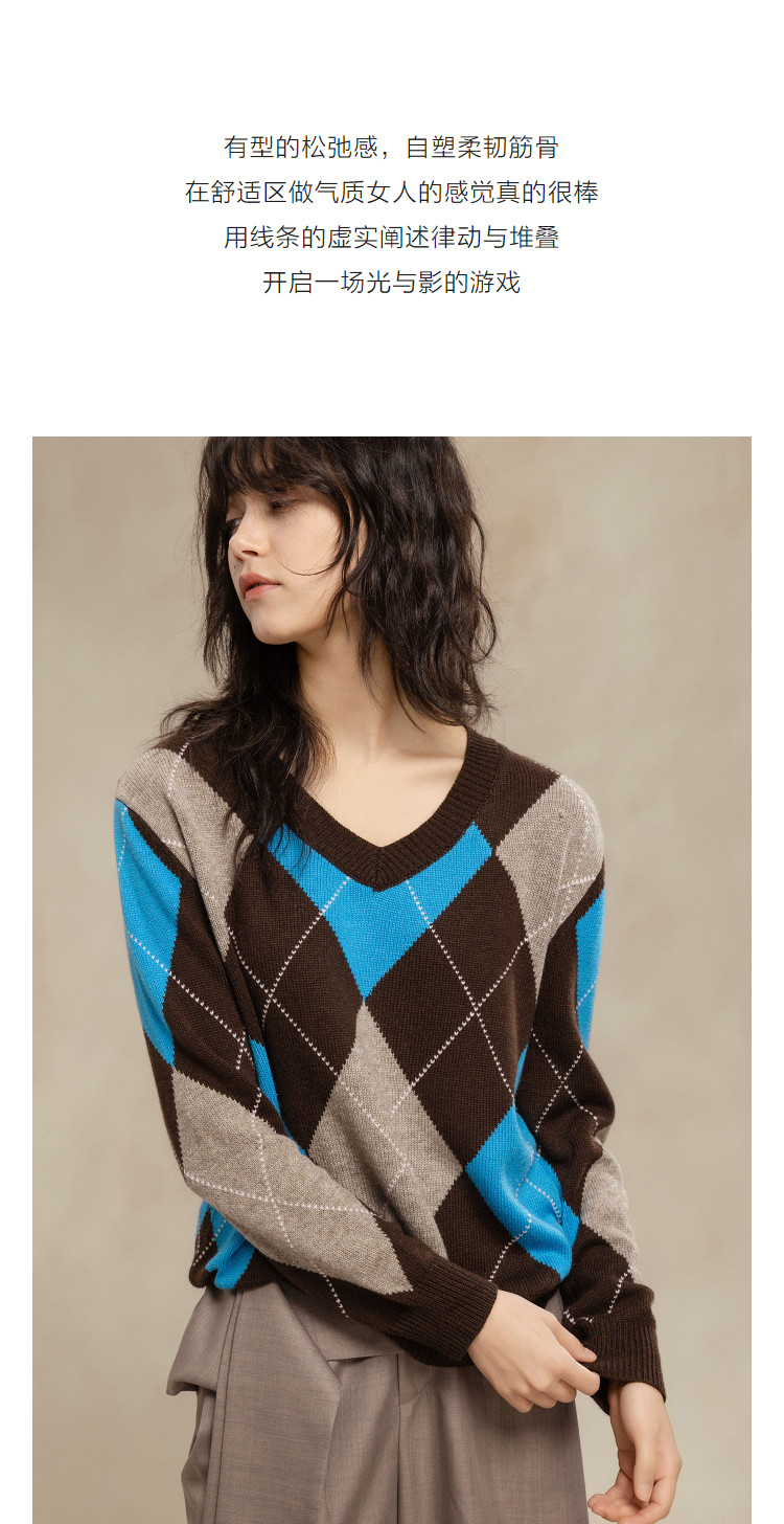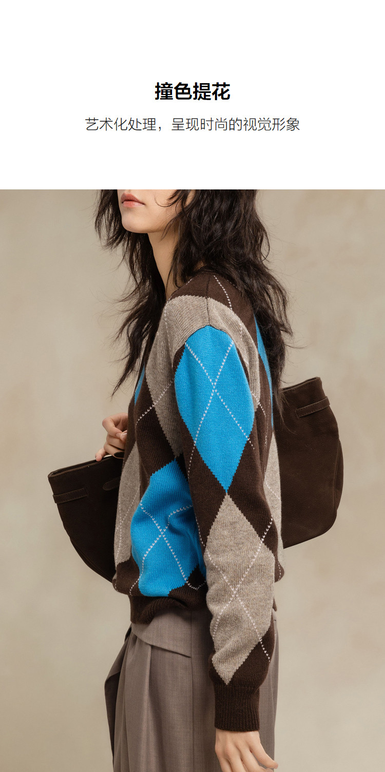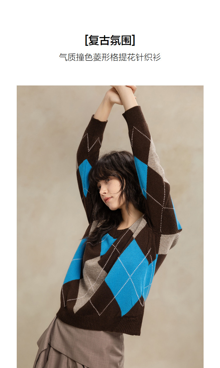 【蓬松绵羊毛】冬季复古V领撞色菱形格提花线衫罗纹针织衫女上衣
