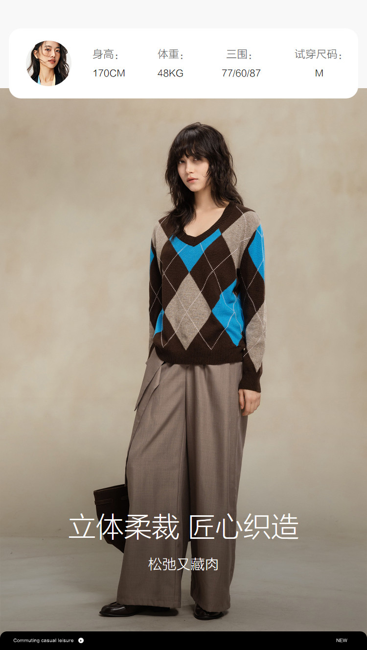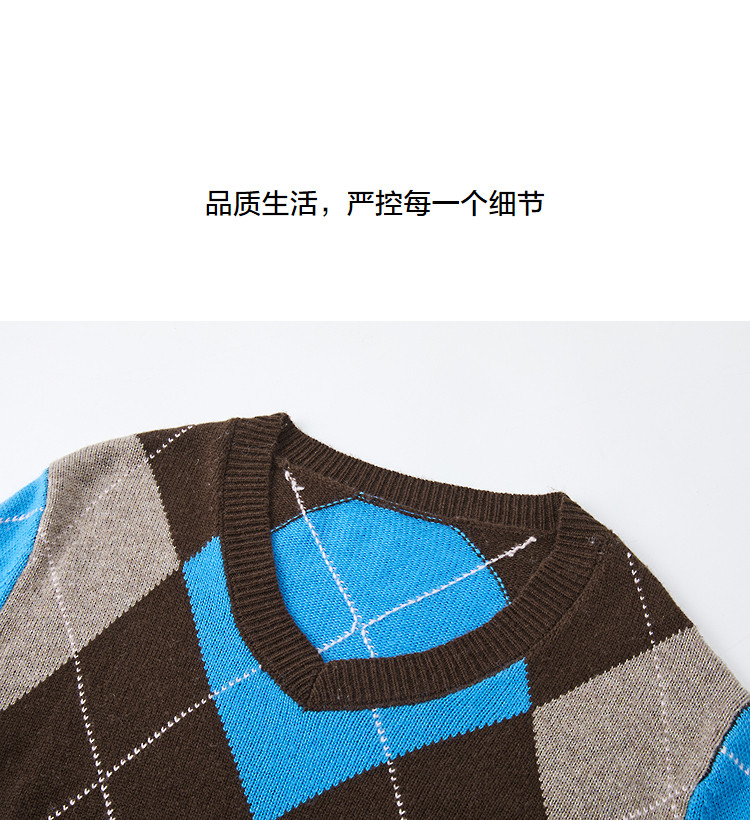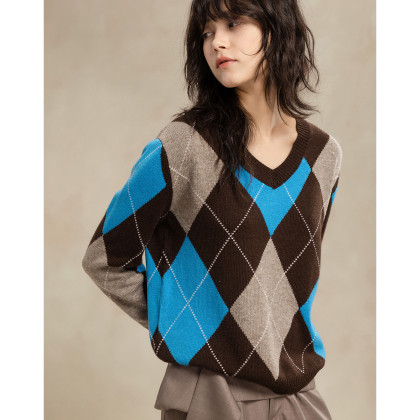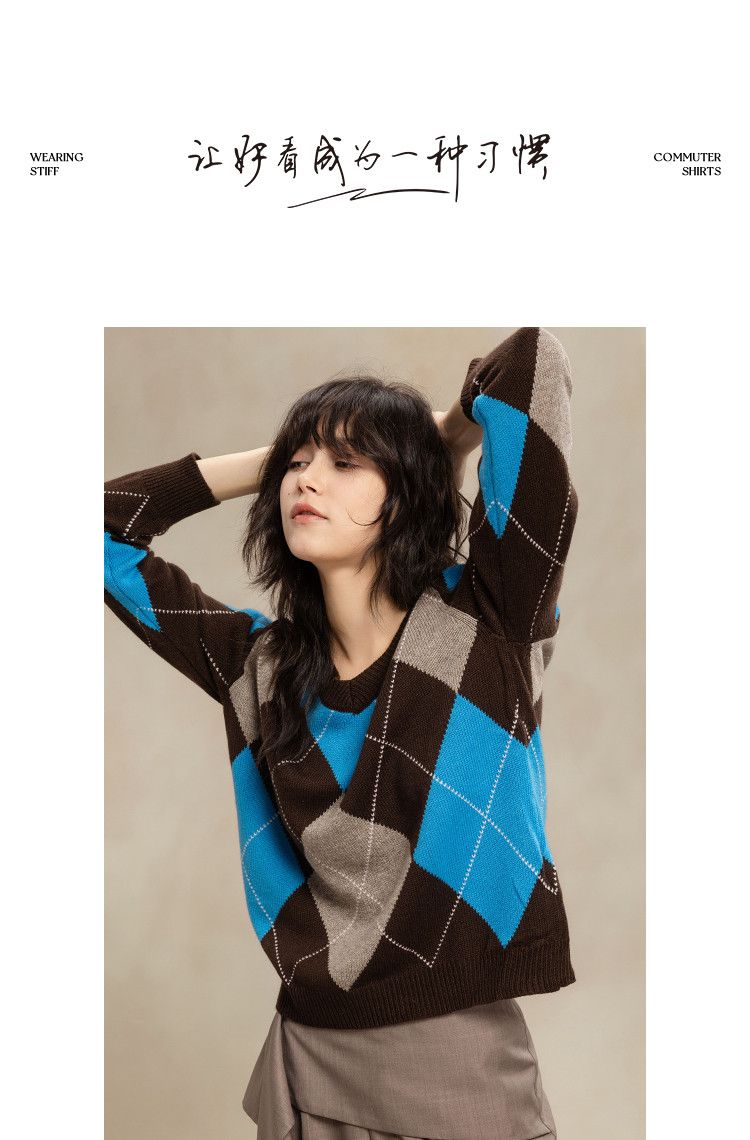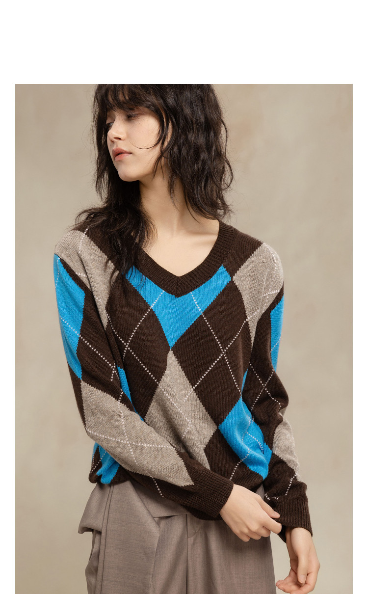 【蓬松绵羊毛】冬季复古V领撞色菱形格提花线衫罗纹针织衫女上衣