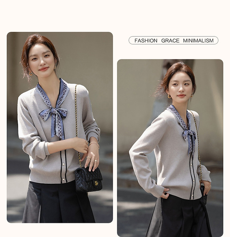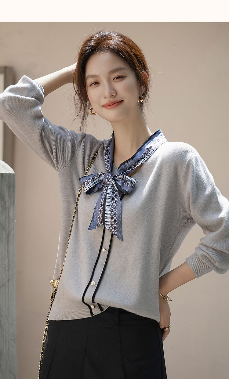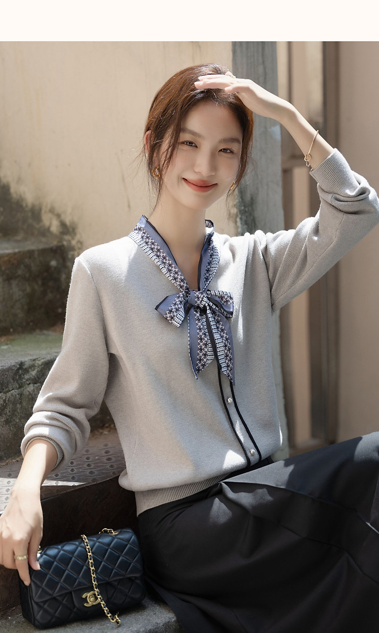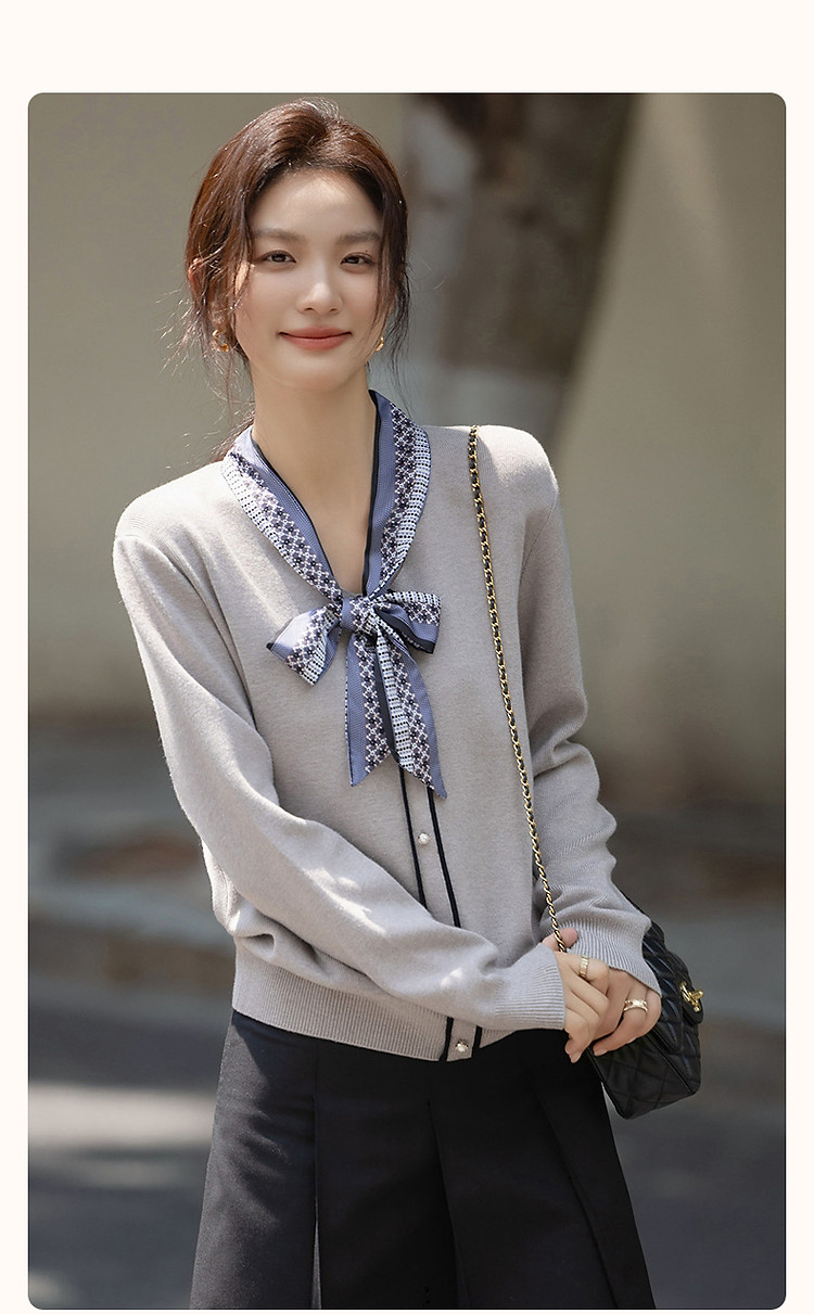 【日杂通勤自留】春秋冬丝带珍珠扣装饰开衫多季通穿针织衫女上衣