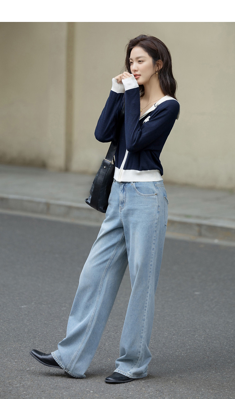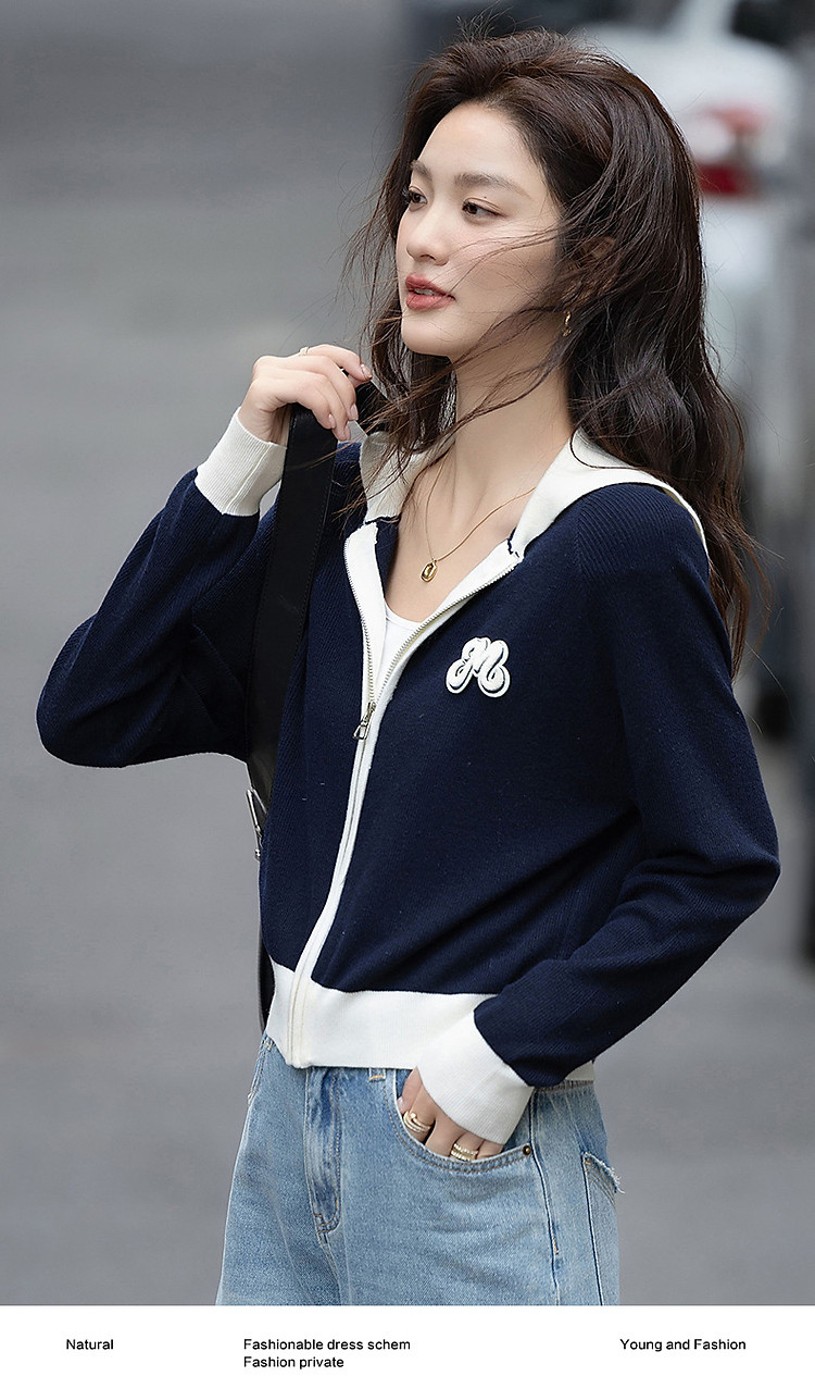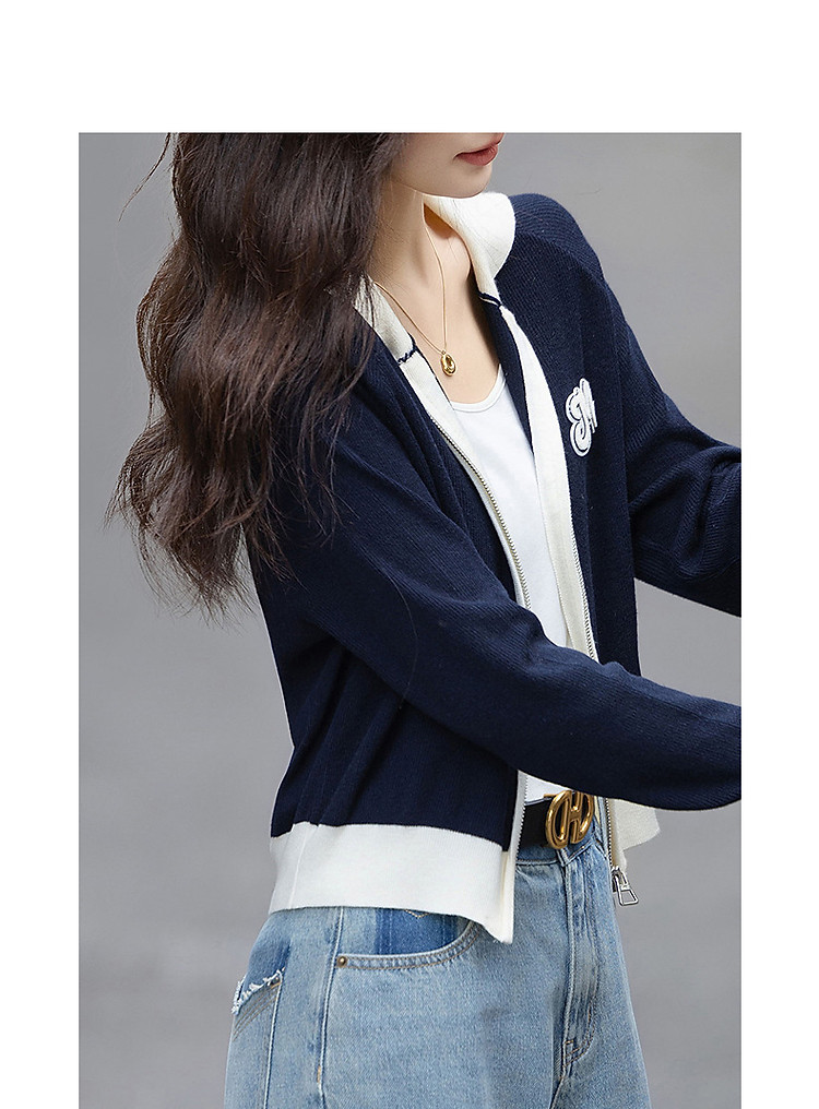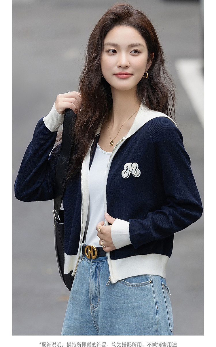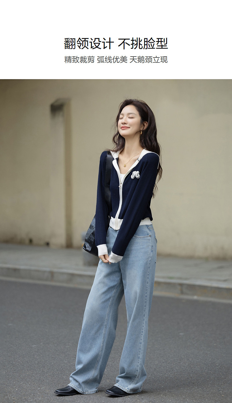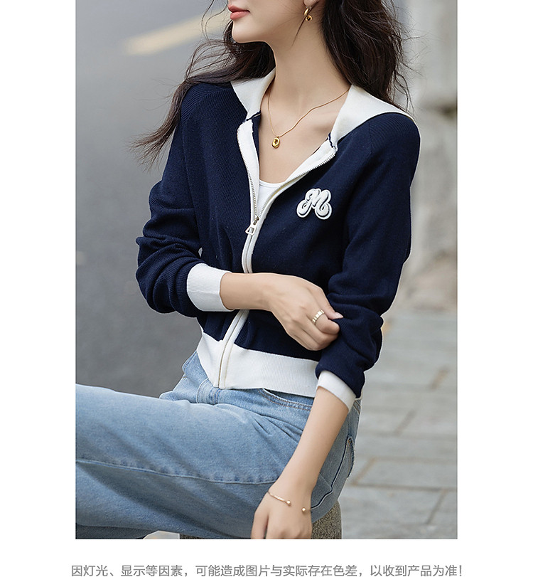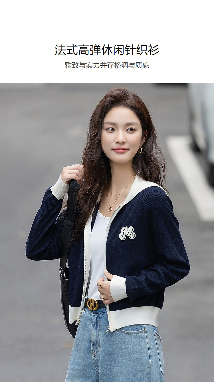 【法式高弹休闲针织衫】2025秋翻领撞色牙刷绣开衫女上衣