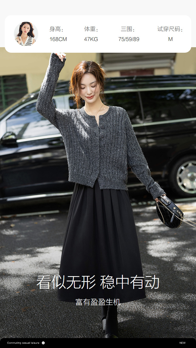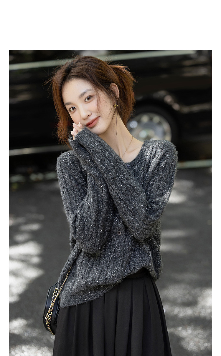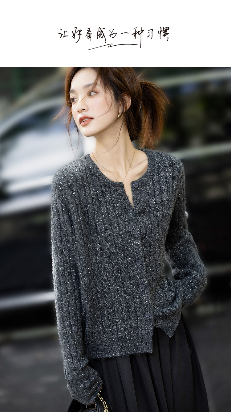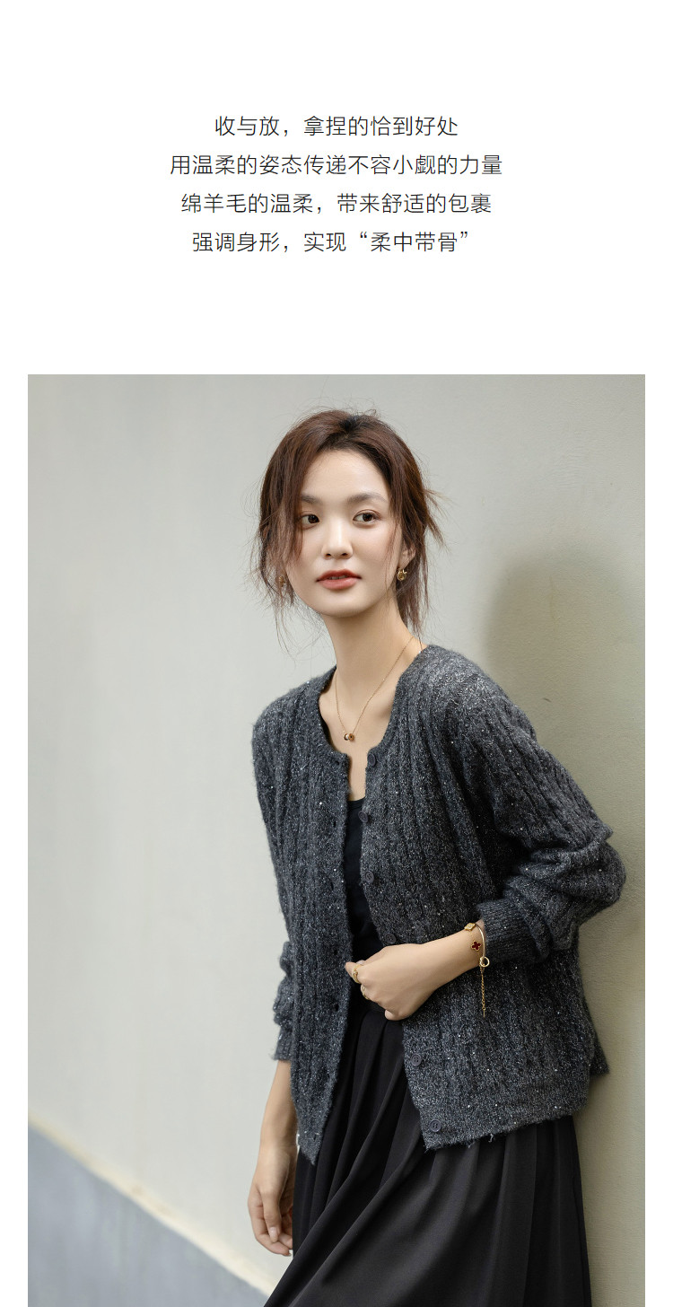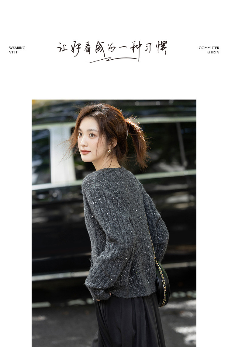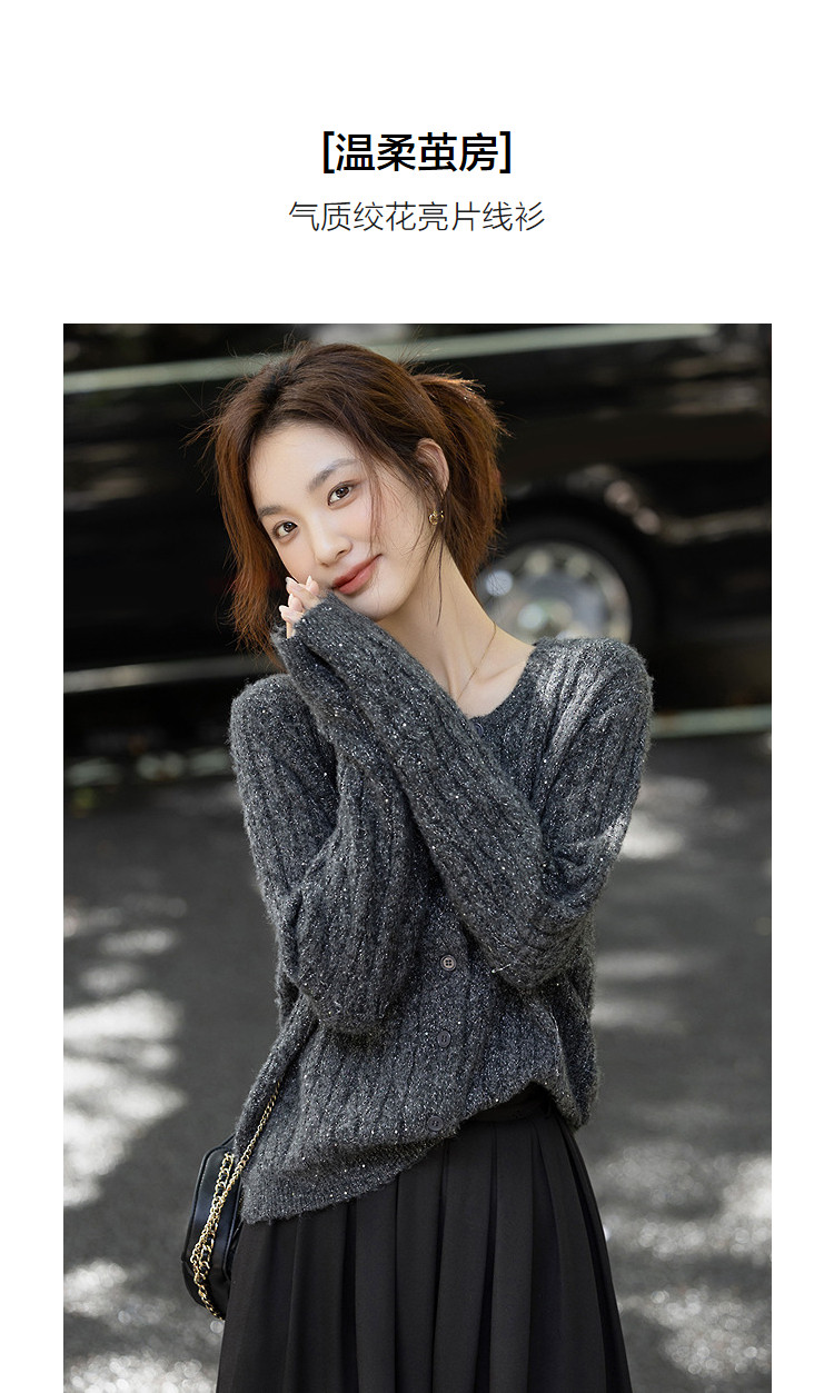 【含蓬松绵羊毛】秋季圆领绞花亮片线衫宽松藏肉小个子针织衫上衣