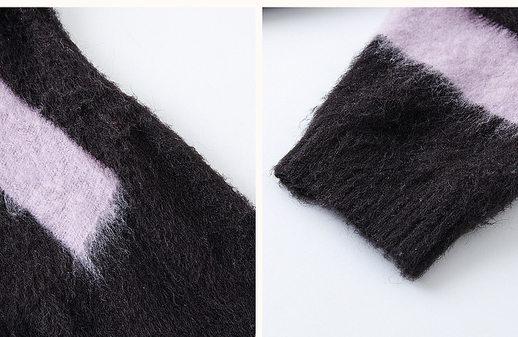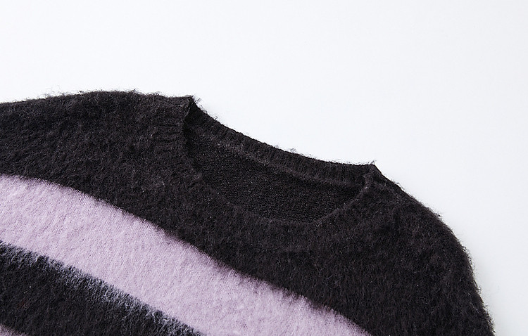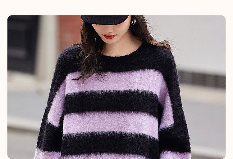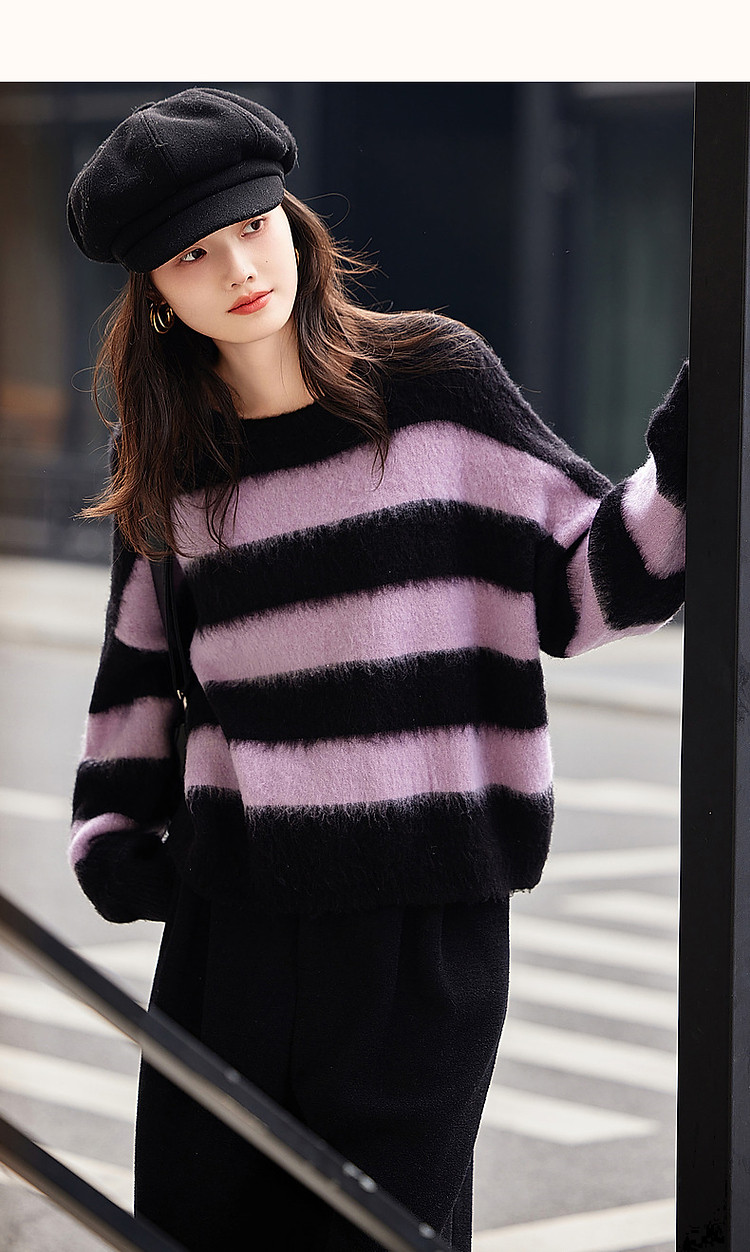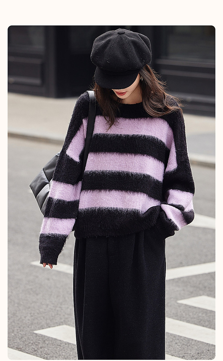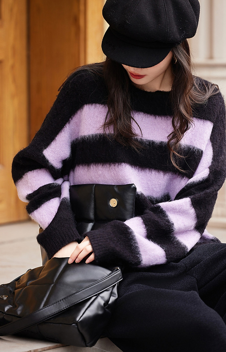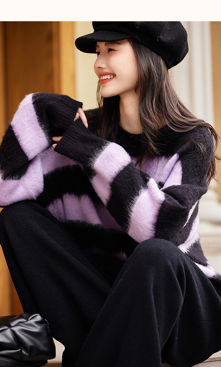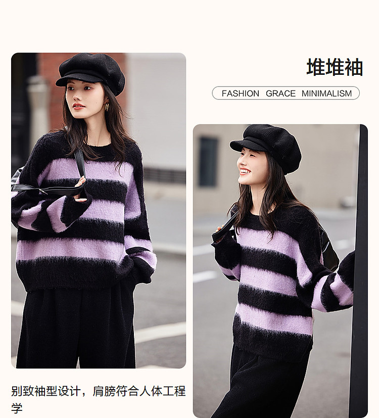 【时尚慵懒风】冬季圆领堆堆袖拉绒条纹气质拼色针织衫女上衣