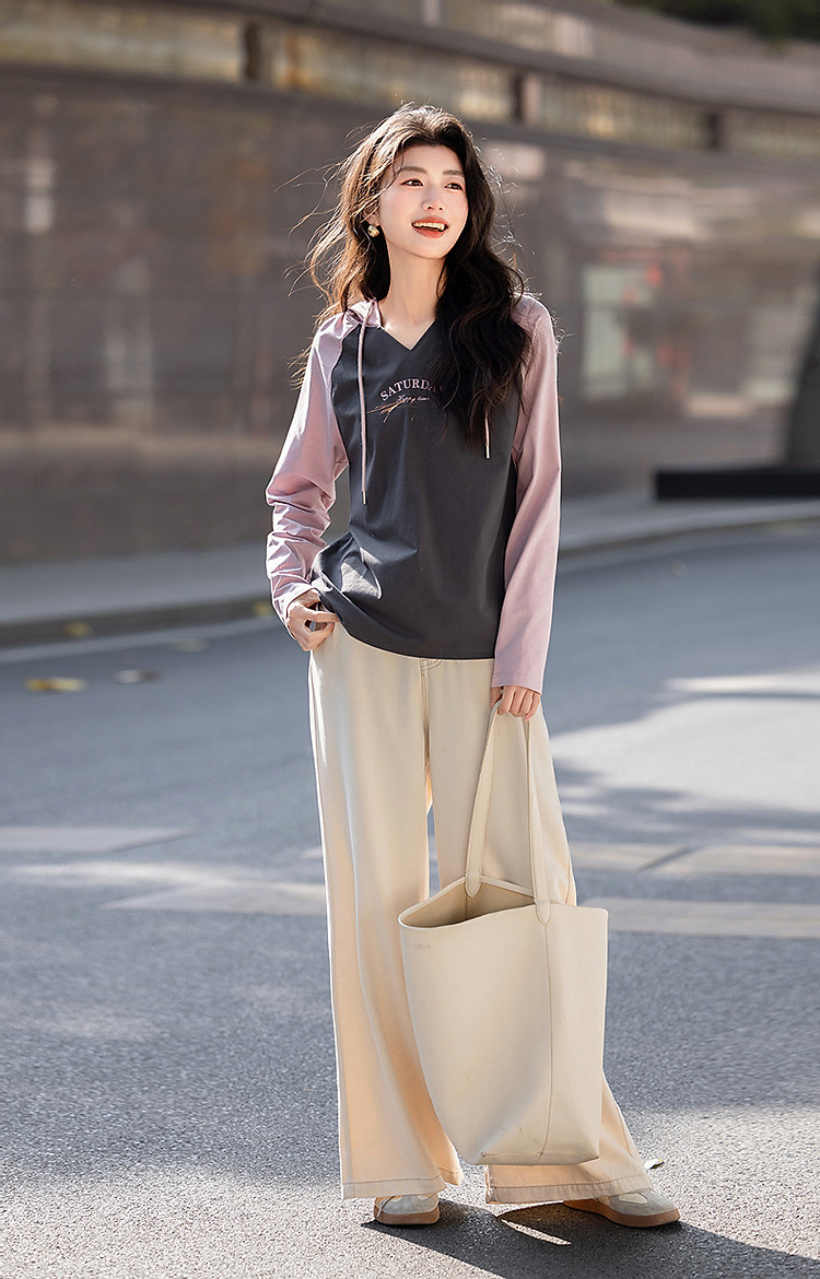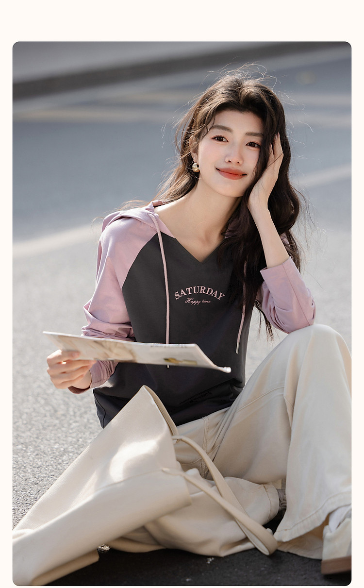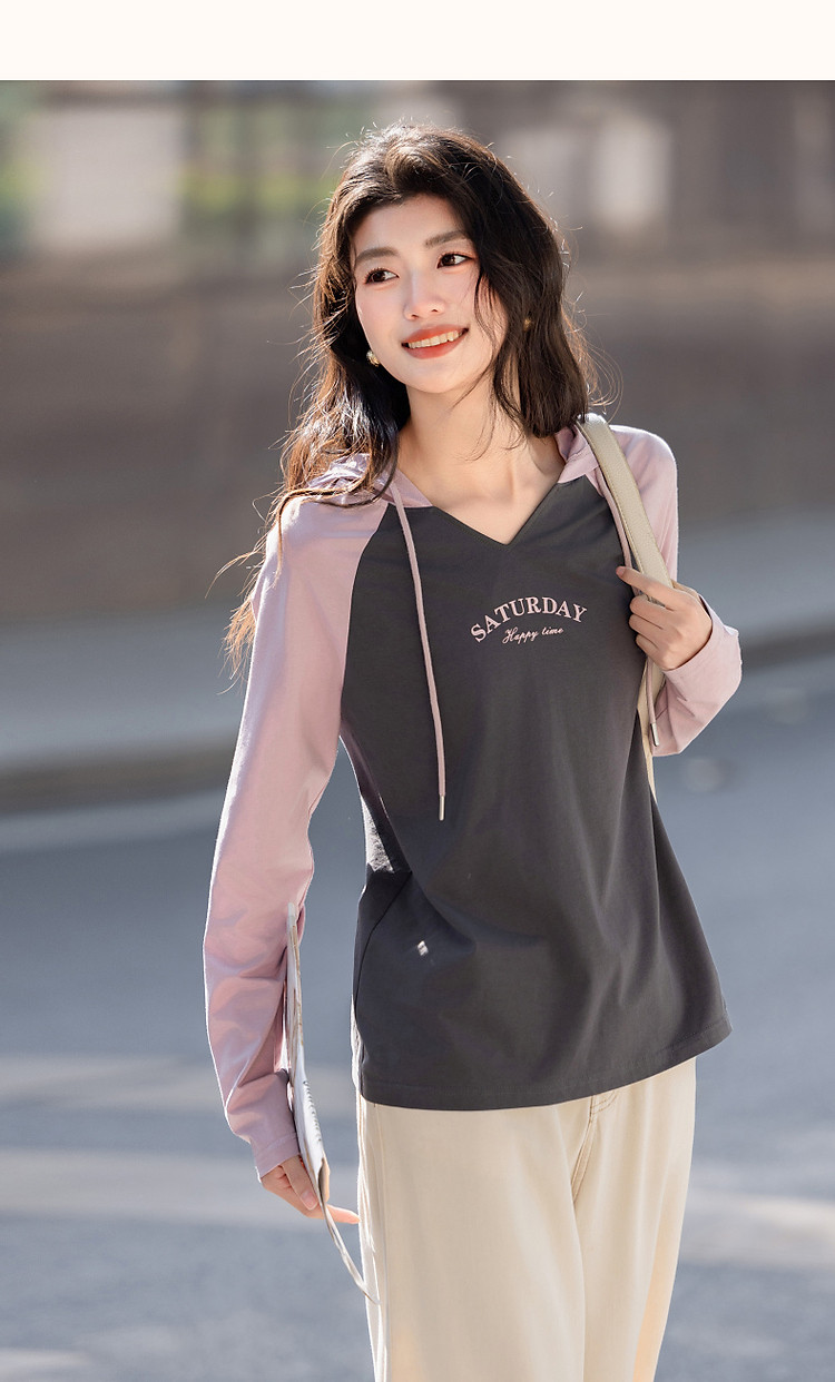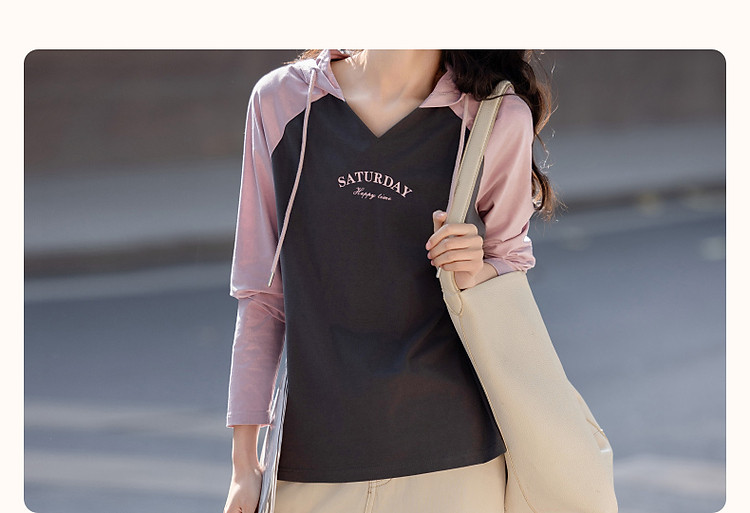 【盐系少年感】春季小V连帽领180G棉氨字母印花撞色女式t恤