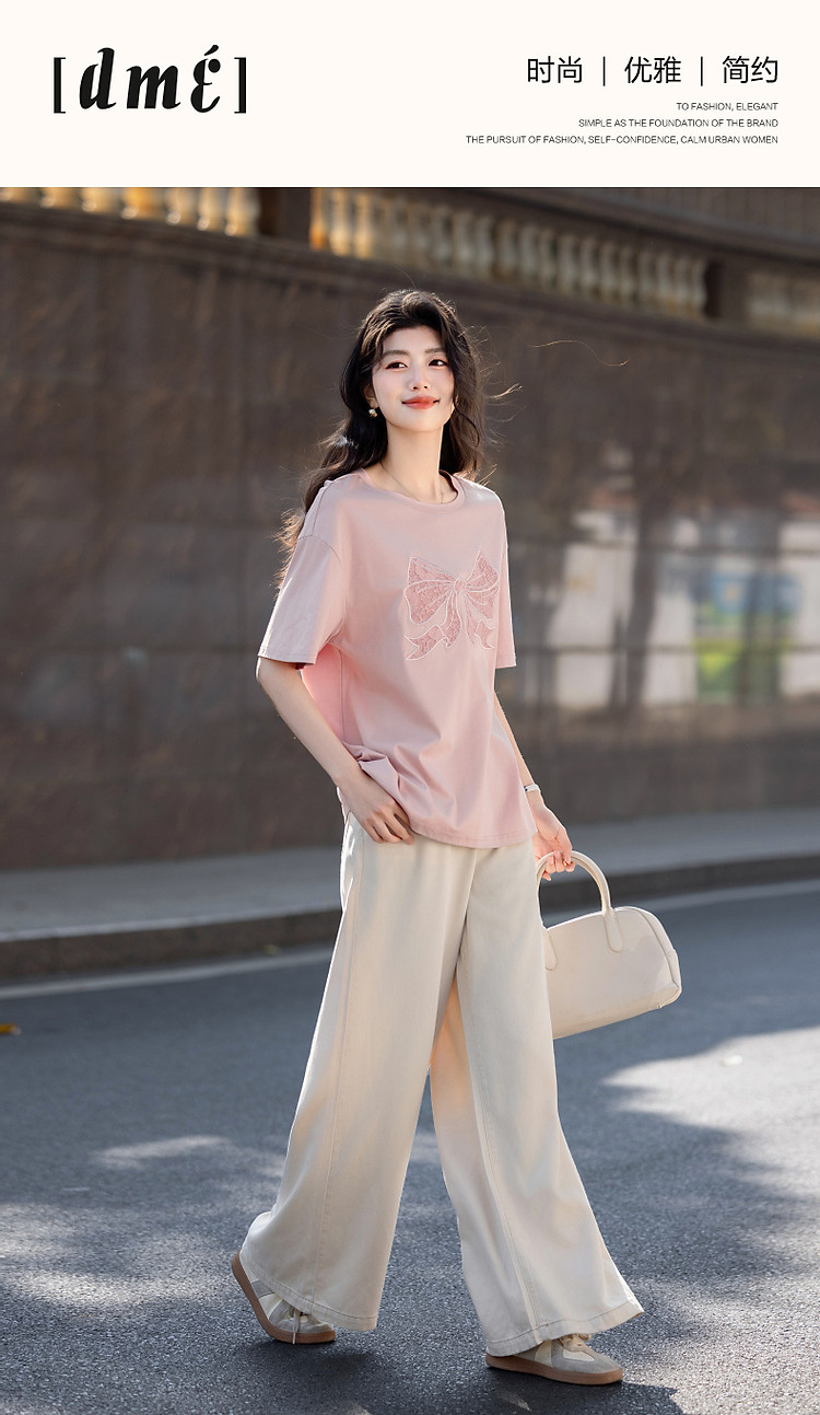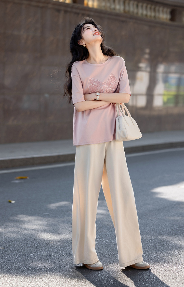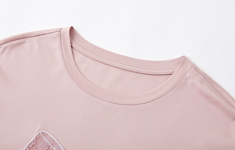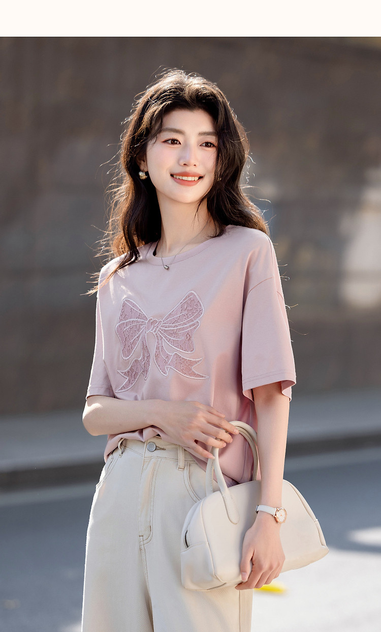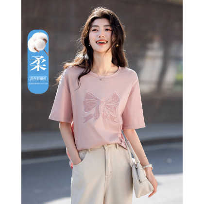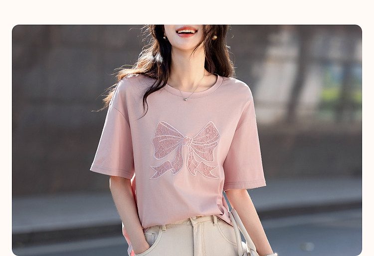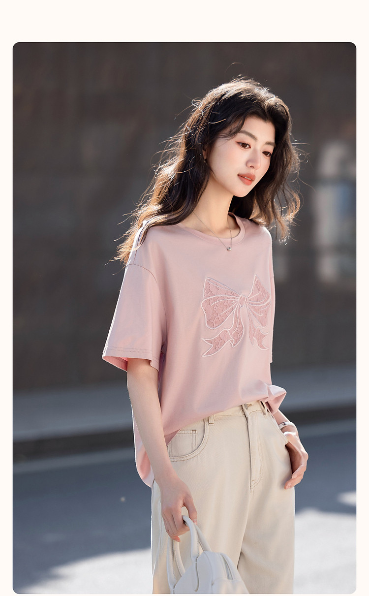 【面膜t恤】春季180G棉氨短袖t恤女刺绣蕾丝蝴蝶结女式t恤